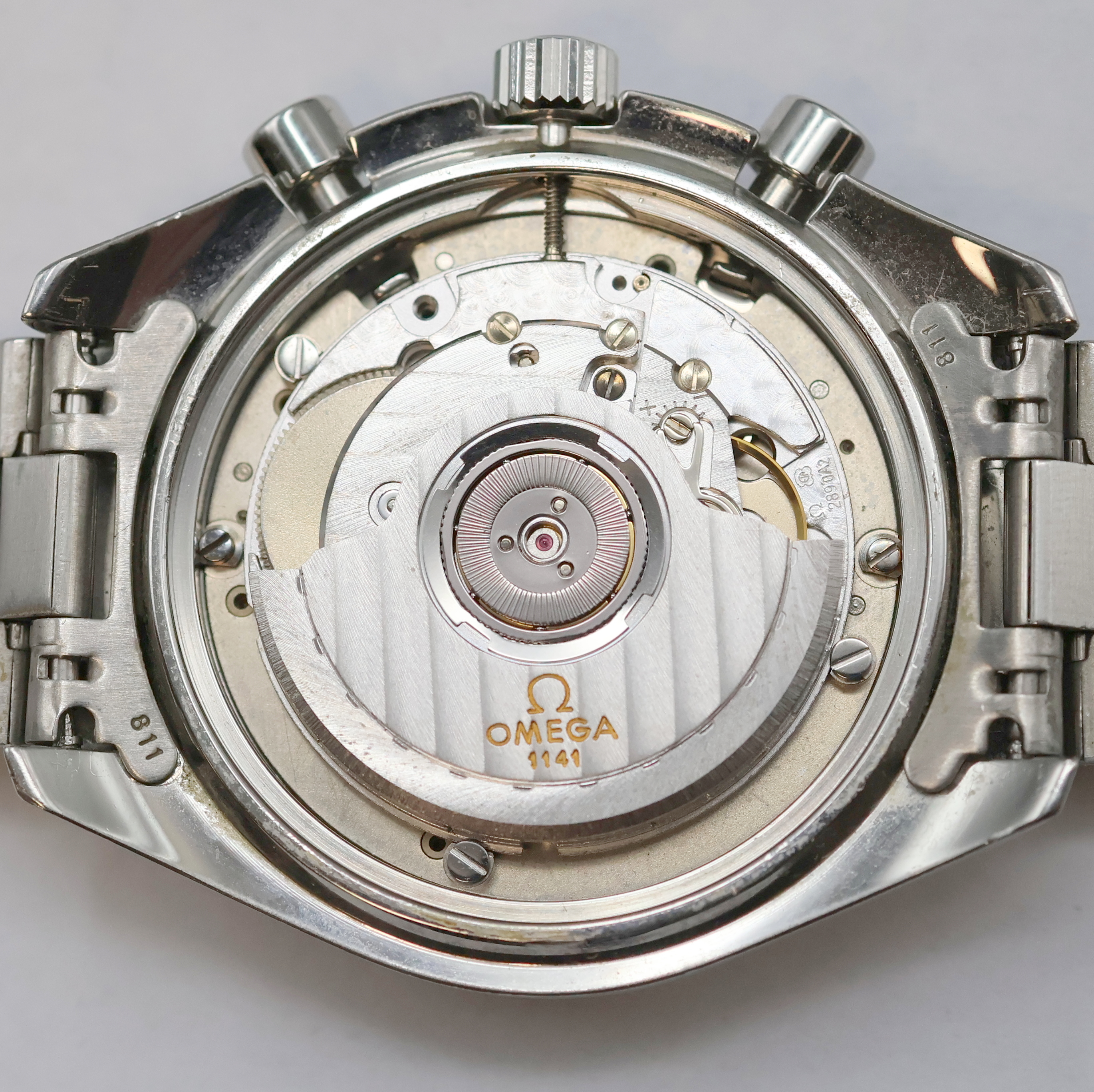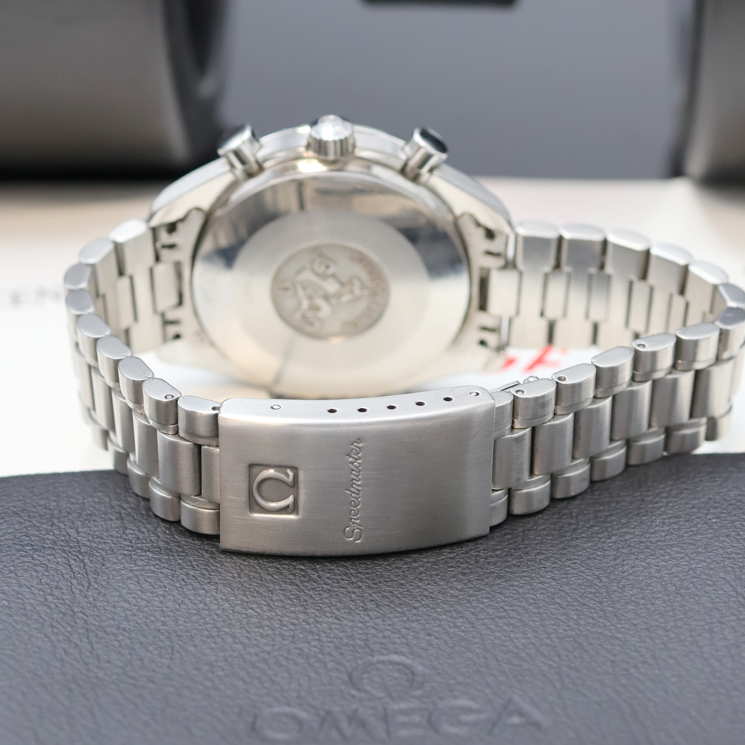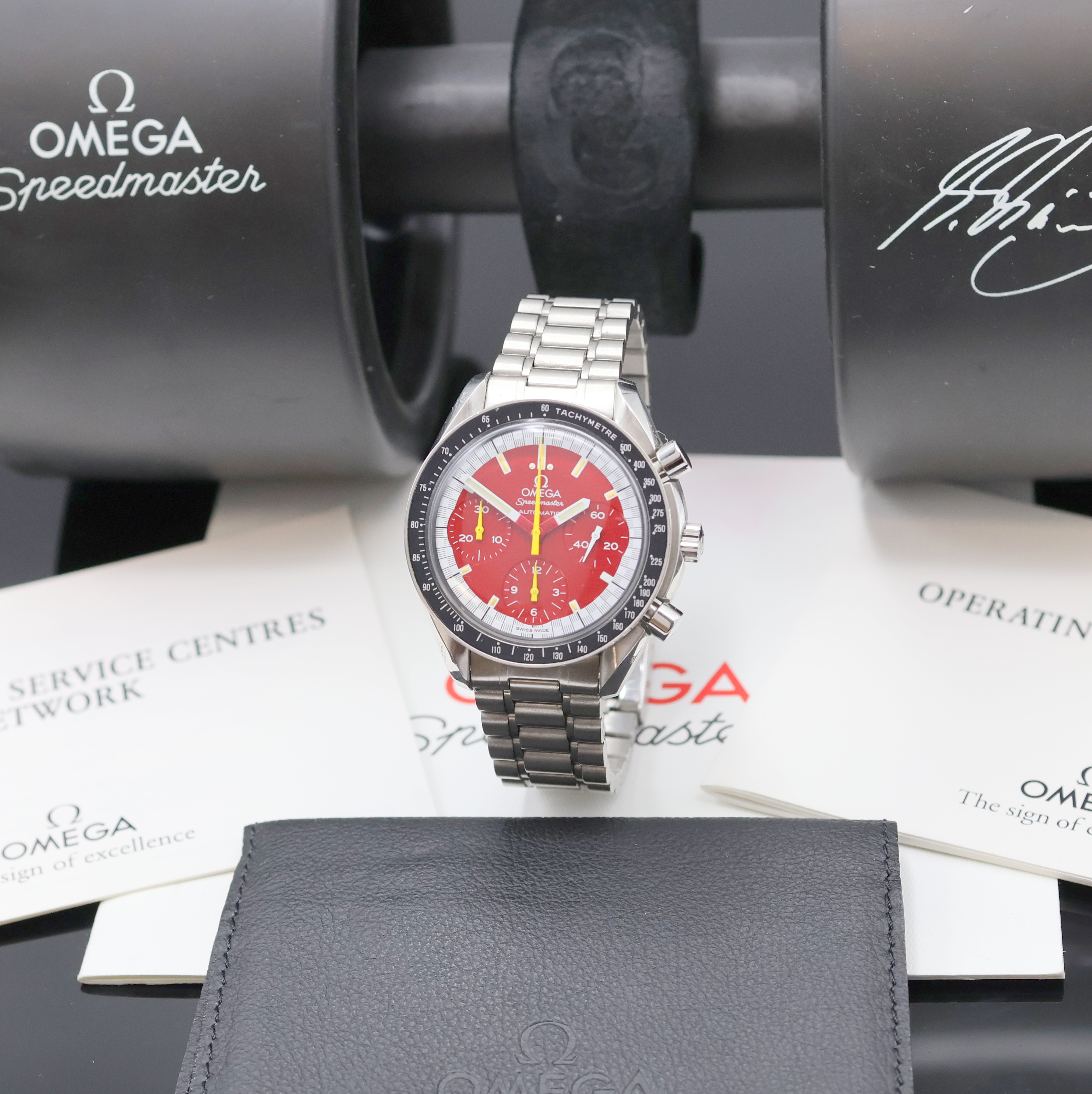 OMEGA Herrenarmbanduhr Serie Speedmaster Sonderedition Michael Schumacher Referenz 3810.61, Automatik, Edelstahlgeh. inkl. orig. Gliederband m. Faltschl., Boden aufgedr., rotes Zifferbl., Lünette m. schwarzer Tachymeterskala, zu Ehren d. mehrfachen Formel 1 Weltmeister, rhod. Werk Kal. 1141, 45 St., Feinreg., D. ca. 39 mm, L. ca. 20 cm, orig. Etui in Form von Slicks und Papiere, demnach gek. 08/1996, EZ 2-3, aus Sammlungsauflösung