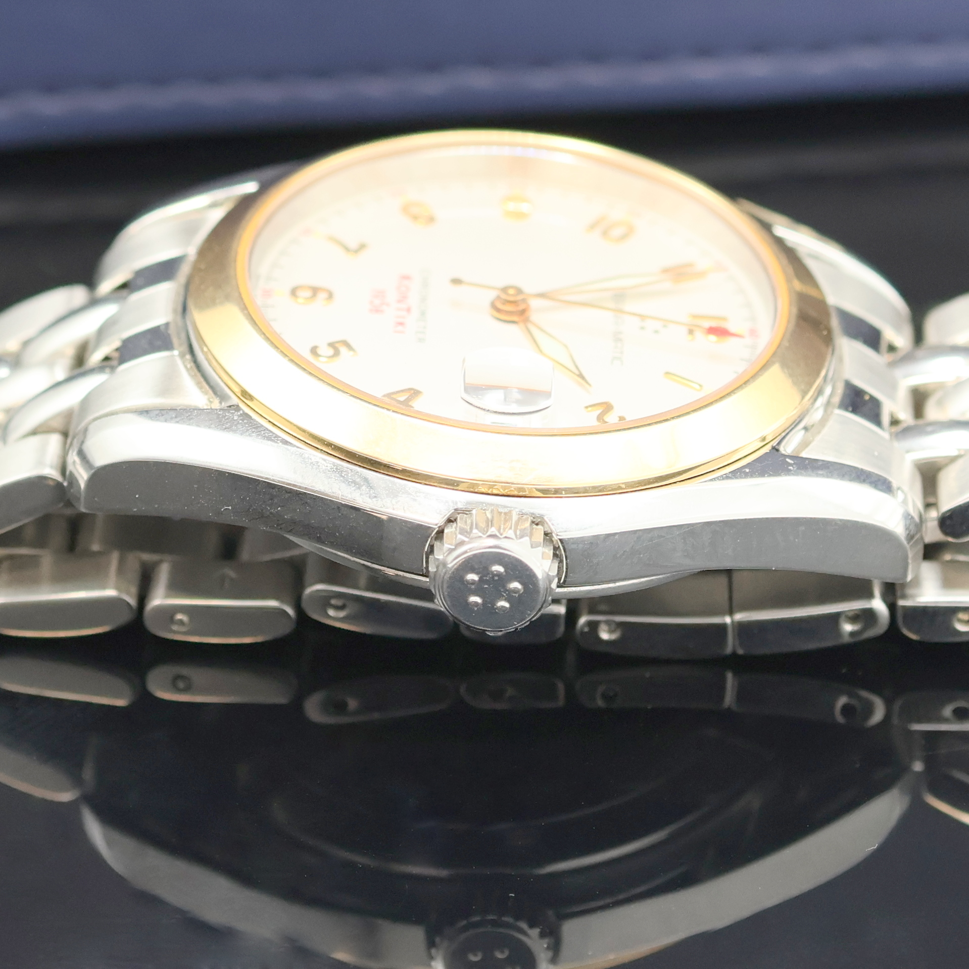 ETERNA seltene Herrenarmbanduhr Chronometer Kontiki 1958 Referenz 1573.47, Automatik, Edelstahl/Gold kombiniert inkl. Gliederband m. dopp. Faltschl., Boden und Krone verschr., silb. Zifferbl. m. aufgel. Std.-Zeichen, Anz. v. Std., Min., Zentralsek. und Datum, Werk rhod., 25 St., Basiskal. 2824-2, Ringunr., Flachspir., gebl. Schrauben, D. ca. 37 mm, L. ca. 20,5 cm, orig. Etui & Pap., demnach gek. 02/1998, EZ 2, aus Sammlungsauflösung