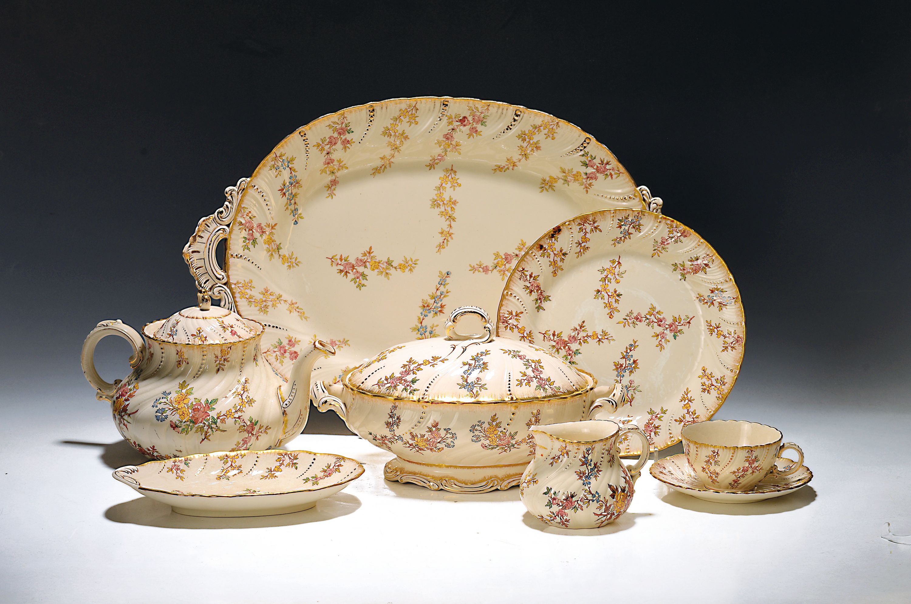 Umfangreiches Tafelservice, Louis XV, Saareguemines, um 1900, Fayence, Blumendekor mit Goldstaffage, 12 Suppenteller, 10 flache Teller, 11 kleine Teller D. 16 cm, 10 Dessertteller, 3 Schüsseln, 2 kl. ovale Platten, 2 kl. Schüsseln, Tasse mit Untertasse, gr. Fleischplatte, Teekanne, Milchkännchen, 2 Deckelschüsseln ( 1x best.), teilweise mit altersbedingten Verfärbungen und kl. Gebrauchsspuren an den Rändern