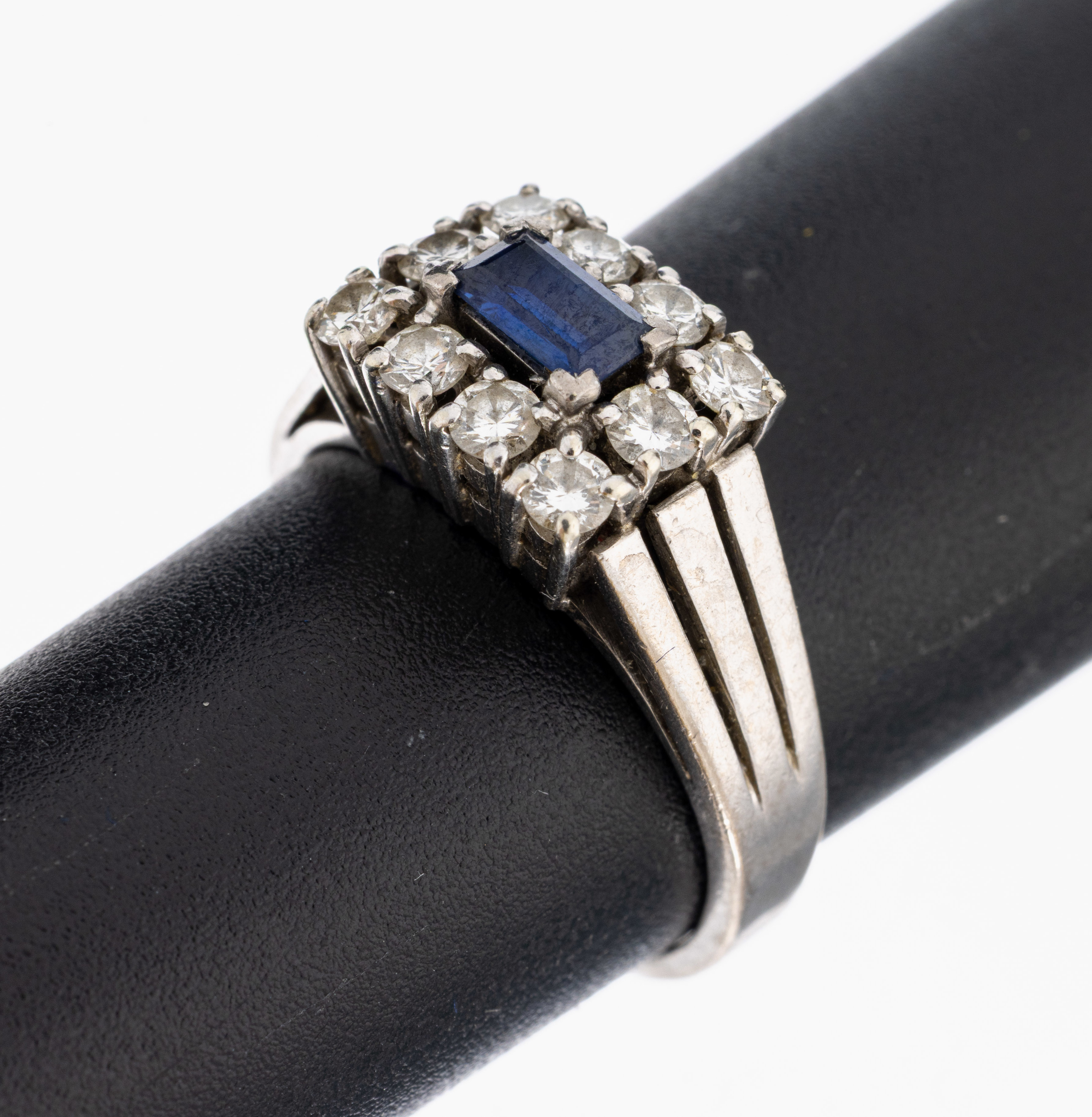 18 kt Gold Saphir-Brillant-Ring, WG 750/000, mittig facett. Saphir-Baguette ca. 0.30