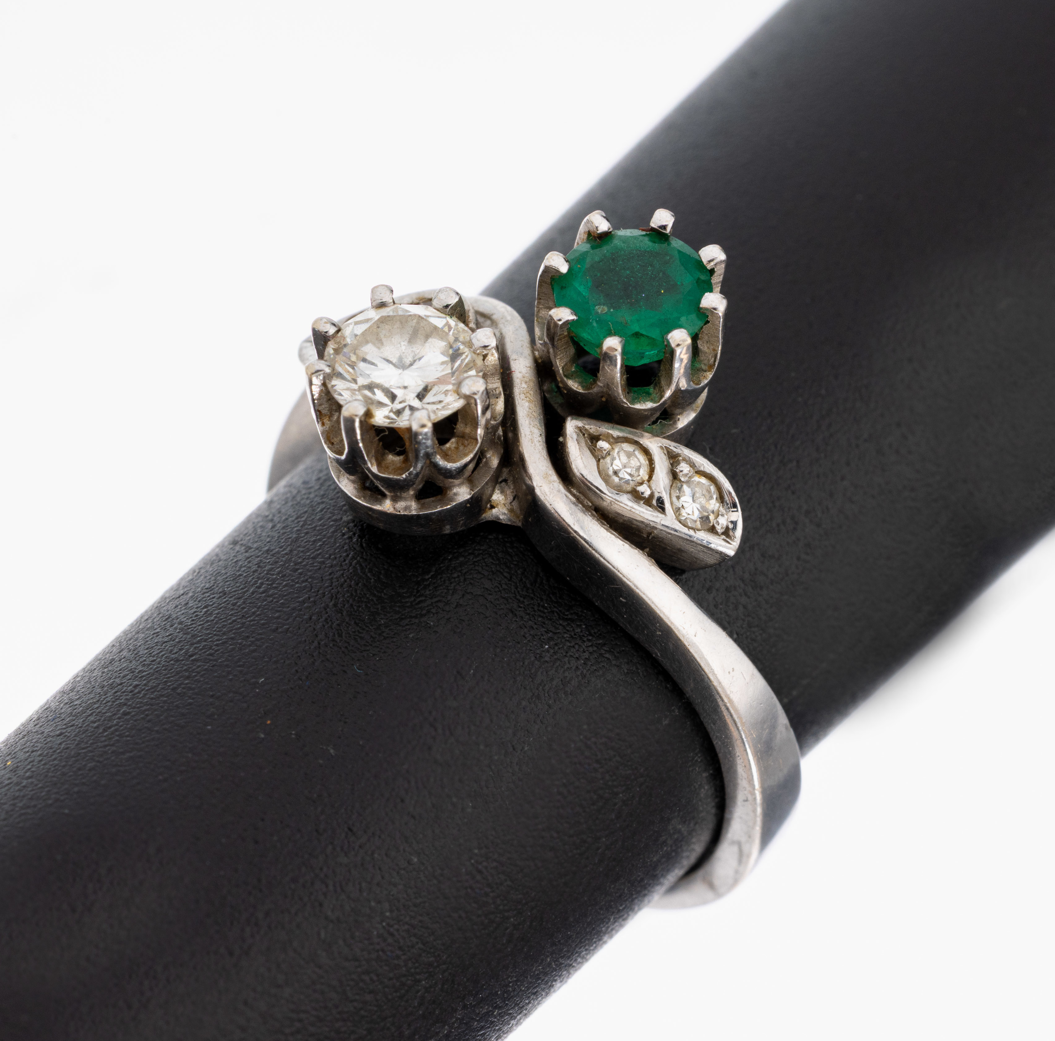 14 kt Gold Smaragd-Diamant-Ring, WG 585/000, 1 rundfacett. Smaragd ca. 0.35 ct, 1