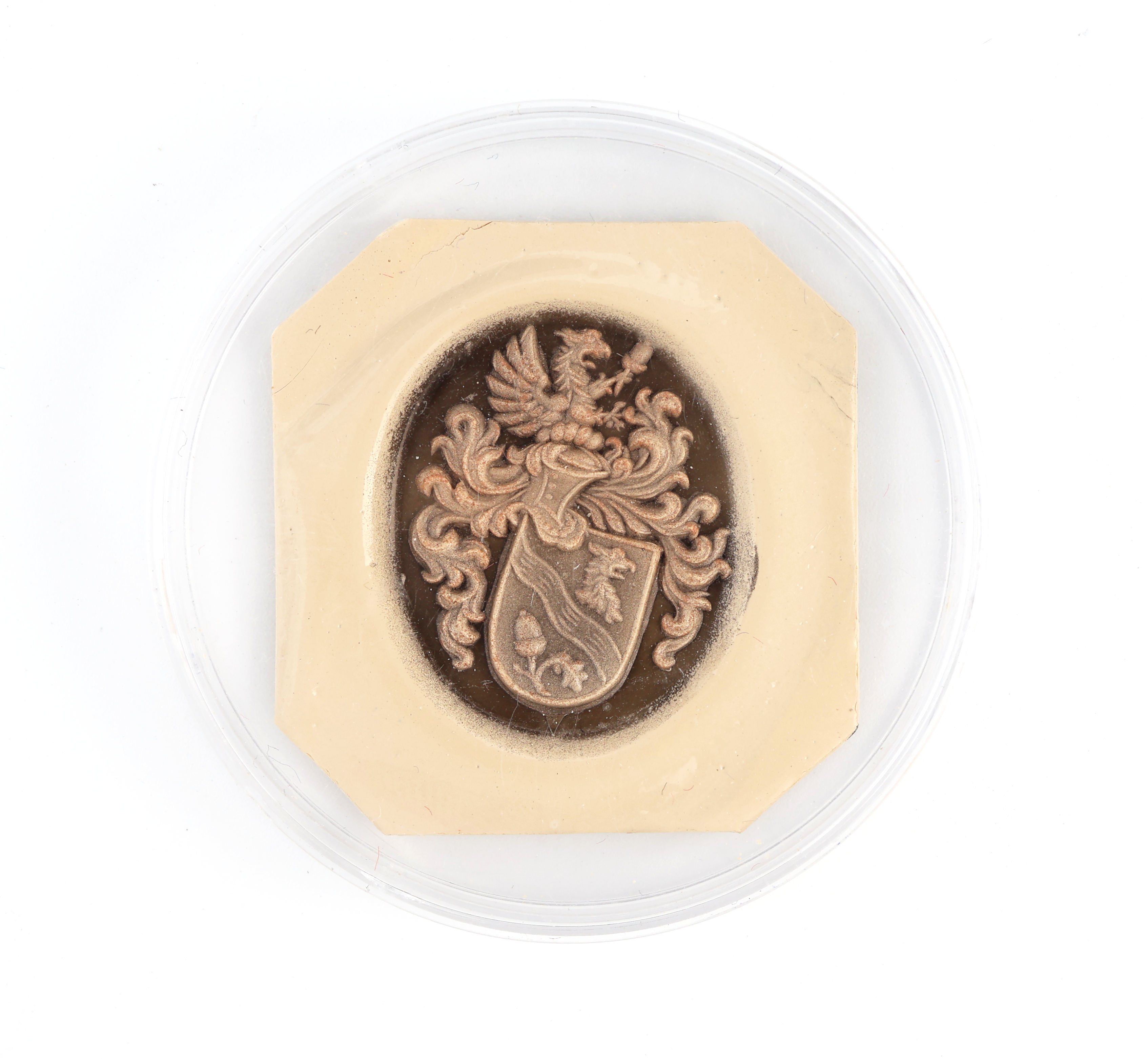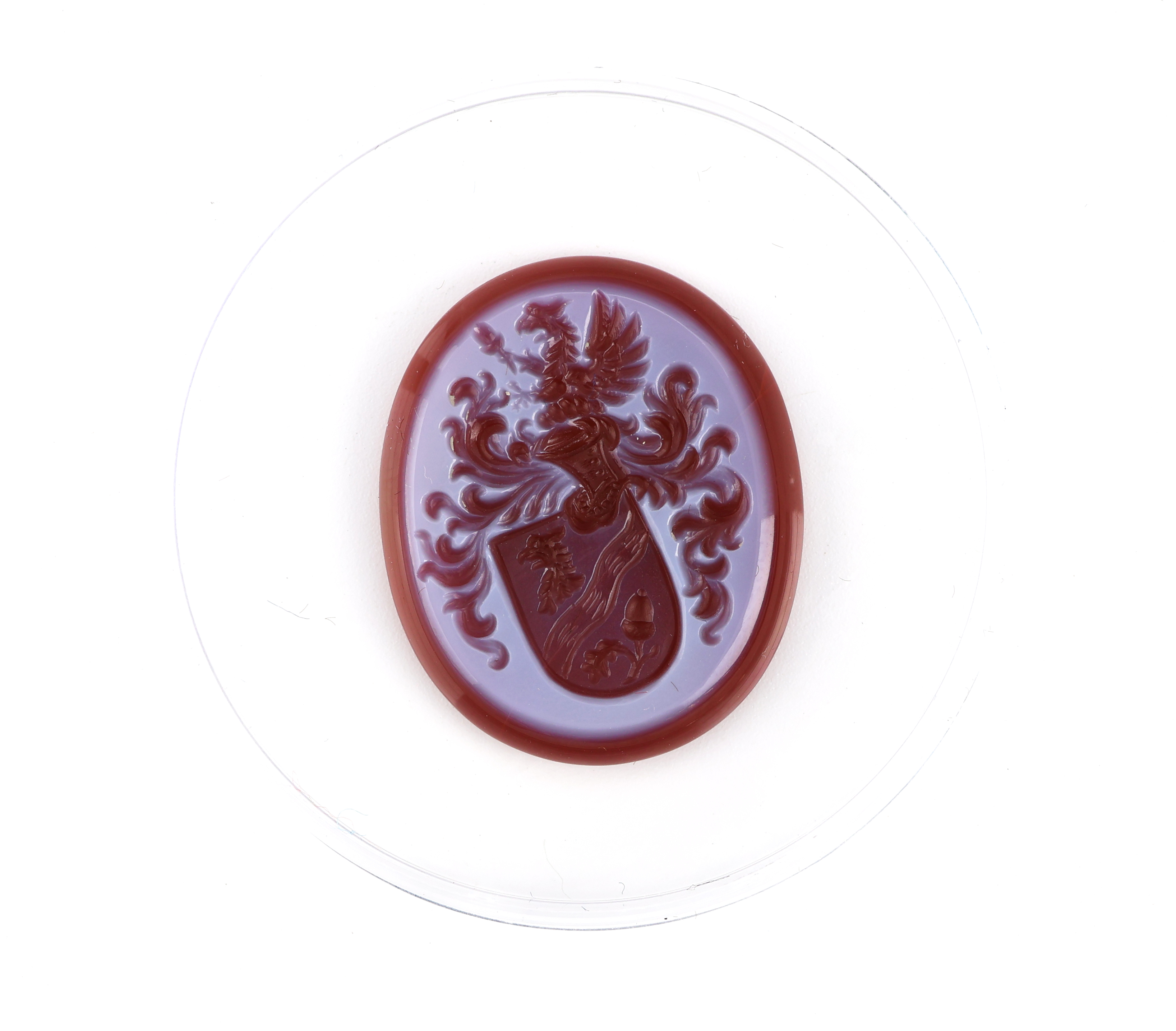 Lagenachat-Gravur, ovaler Lagenachat, Intaglio, Darstellung eines Familienwappens,