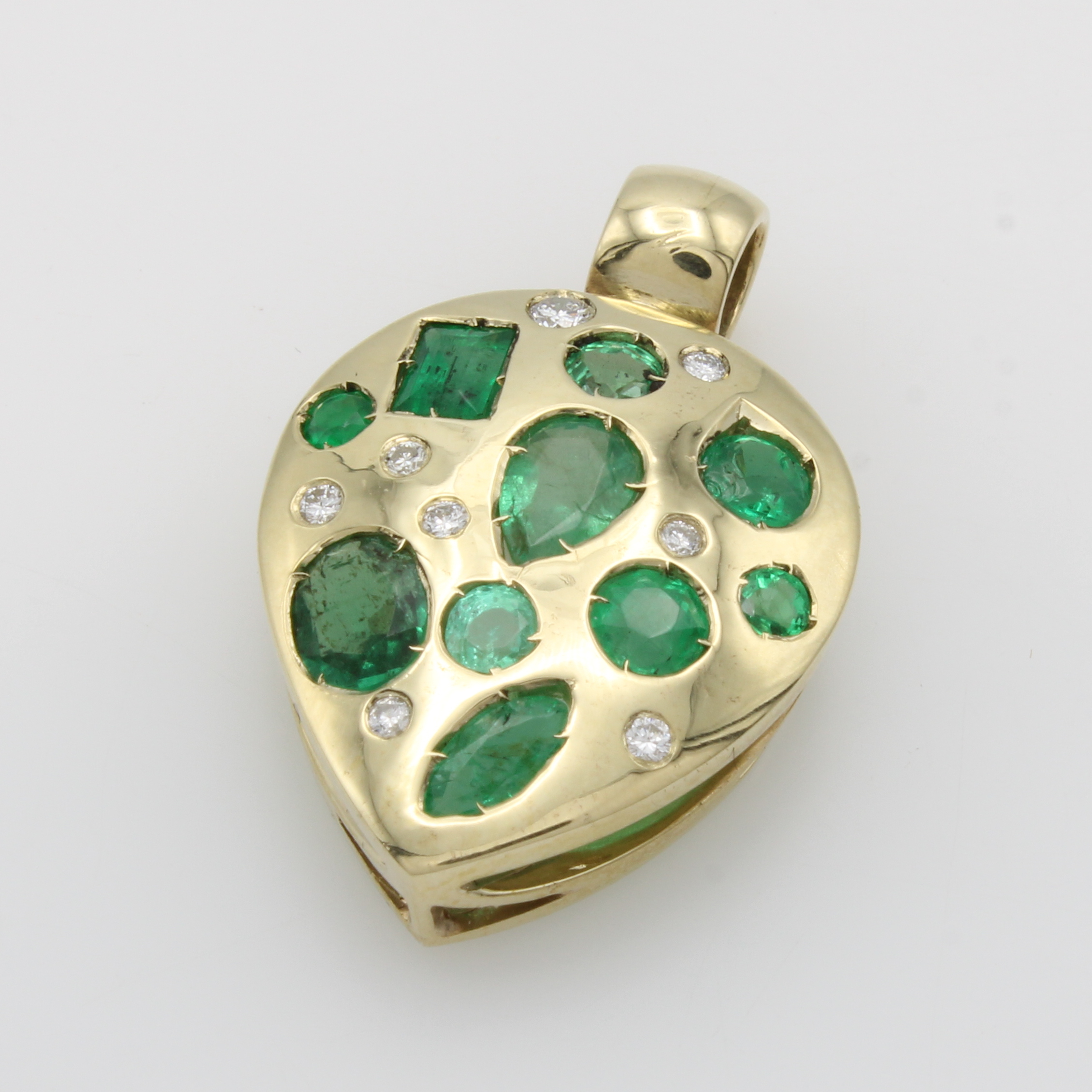 Anhänger mit Smaragden und Brillanten, GG 585/000, Smaragde in versch. Schliffarten zus. ca. 1.9 ct, Brill. zus. ca. 0.08 ct Weiß/si, Tropfenform Schätzpreis: 2500, - EUR