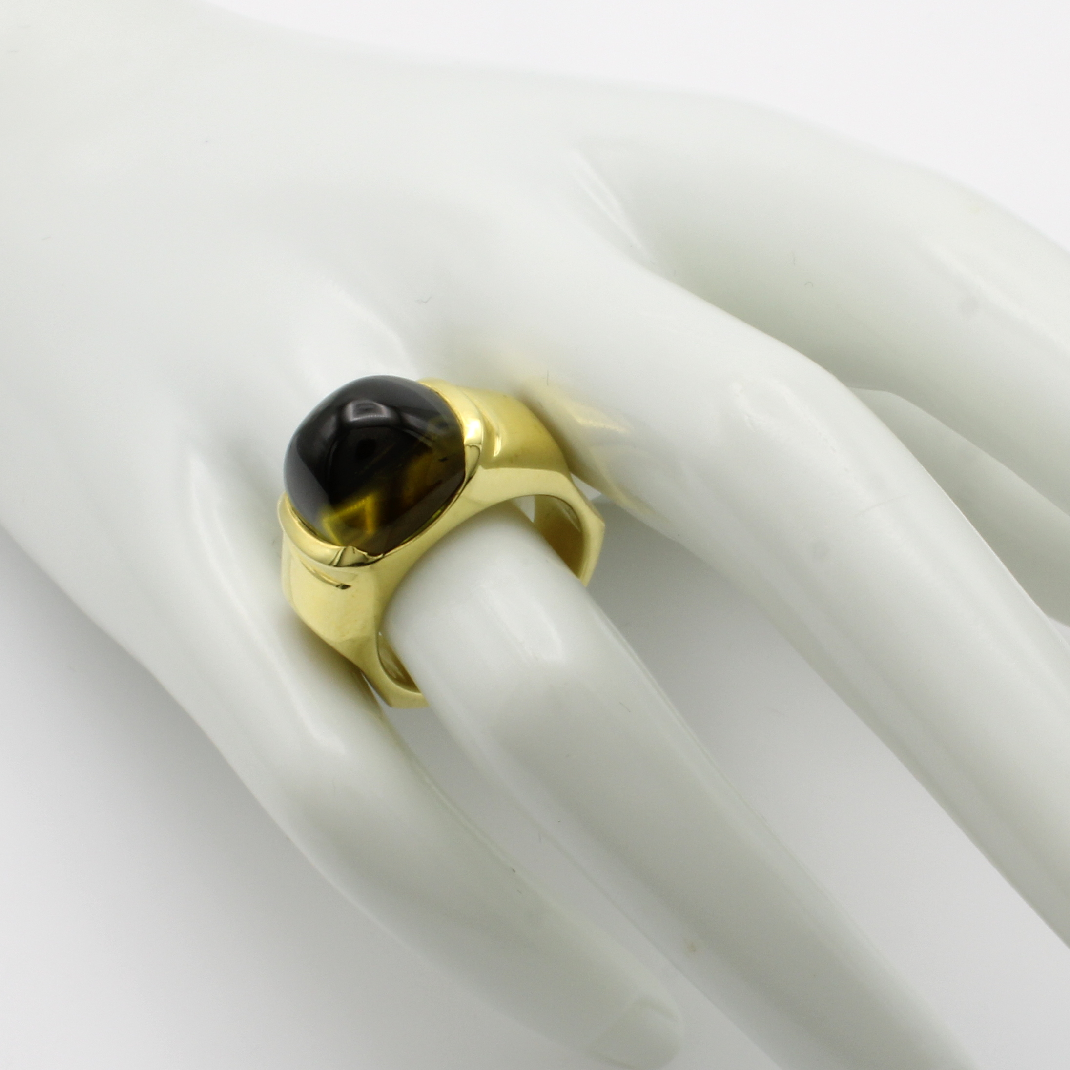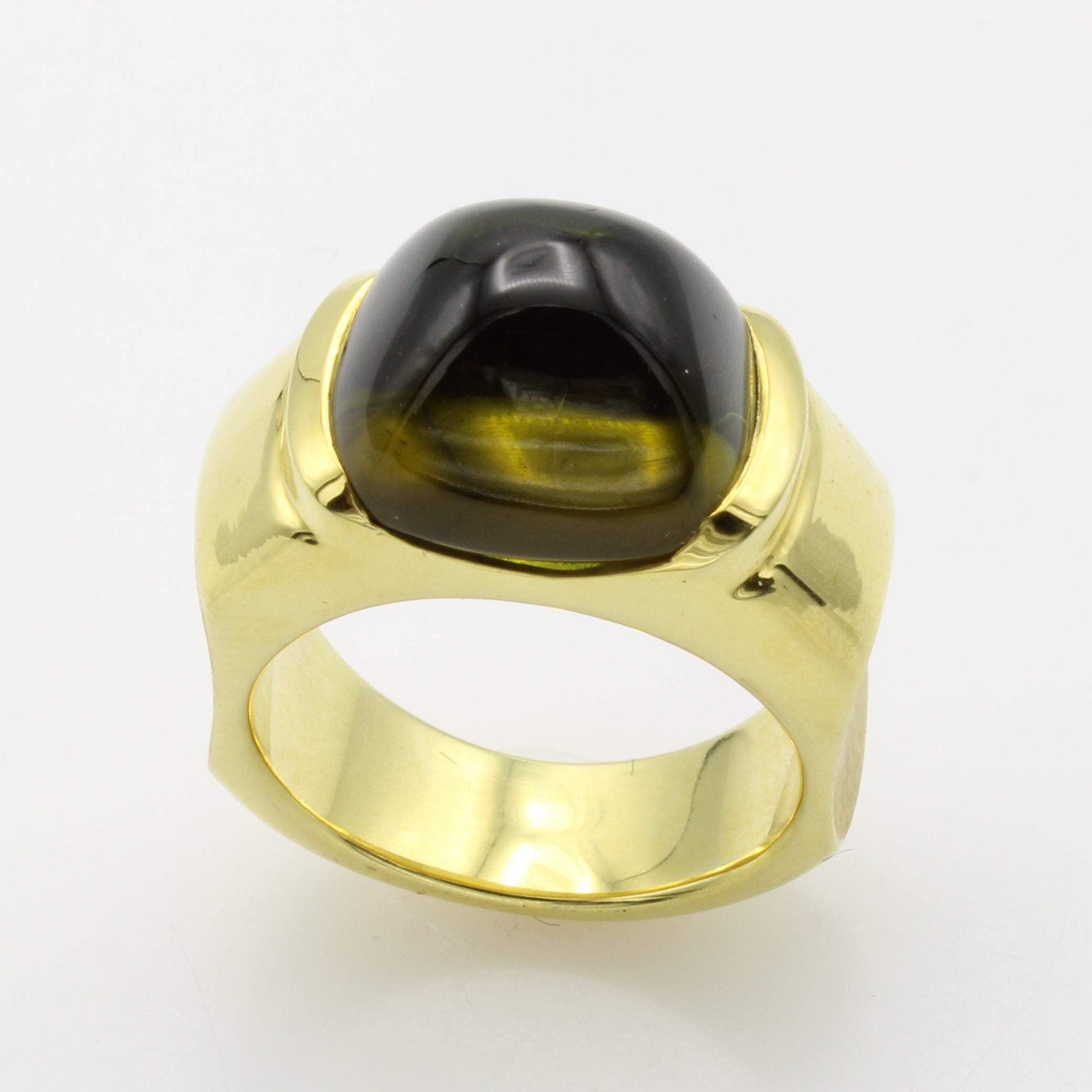 Ring mit Turmalincabochon, GG 585/000, Schiene z.T. matt. u. m. Einkerbungen für besseren Tragekomfort, grüner Turmalin ca. 12.7 ct, RW ca. 55 Schätzpreis: 5700, - EUR