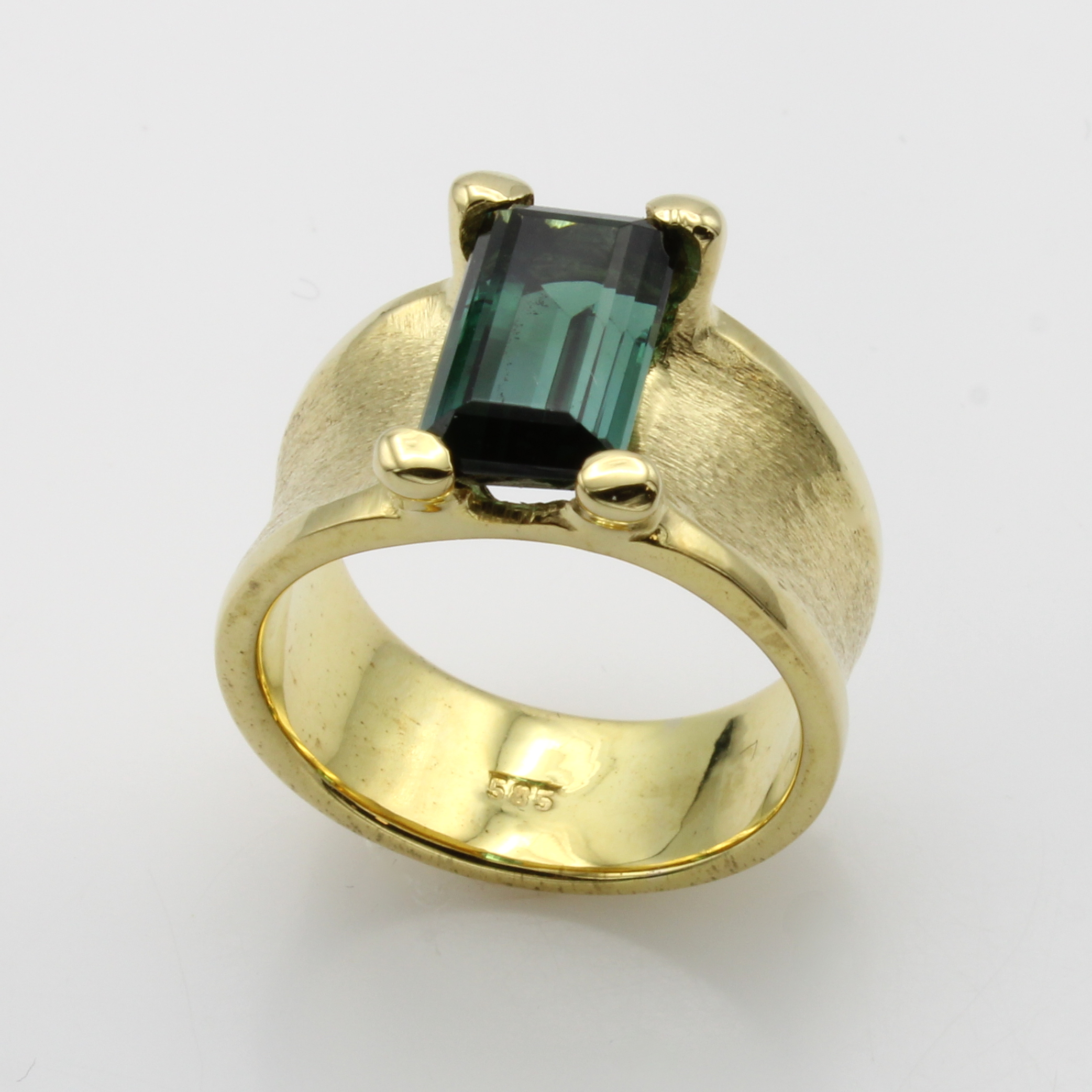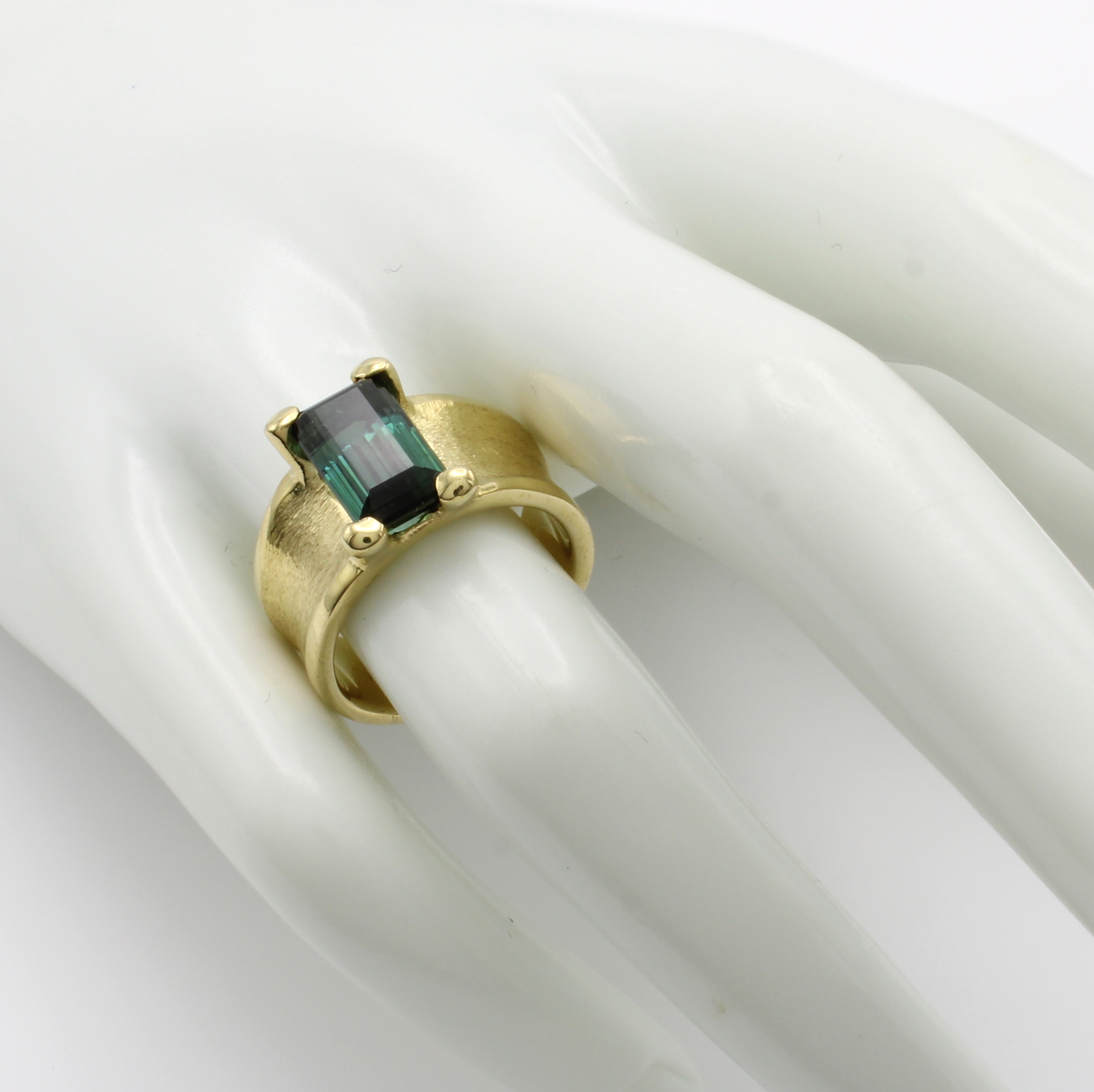 Ring mit Turmalin, GG 585/000, konkave Schiene z.T. matt., rechteckiger, grüner Turmalin in Krappenfassung ca. 3.2 ct, RW ca. 54 Schätzpreis: 3500, - EUR