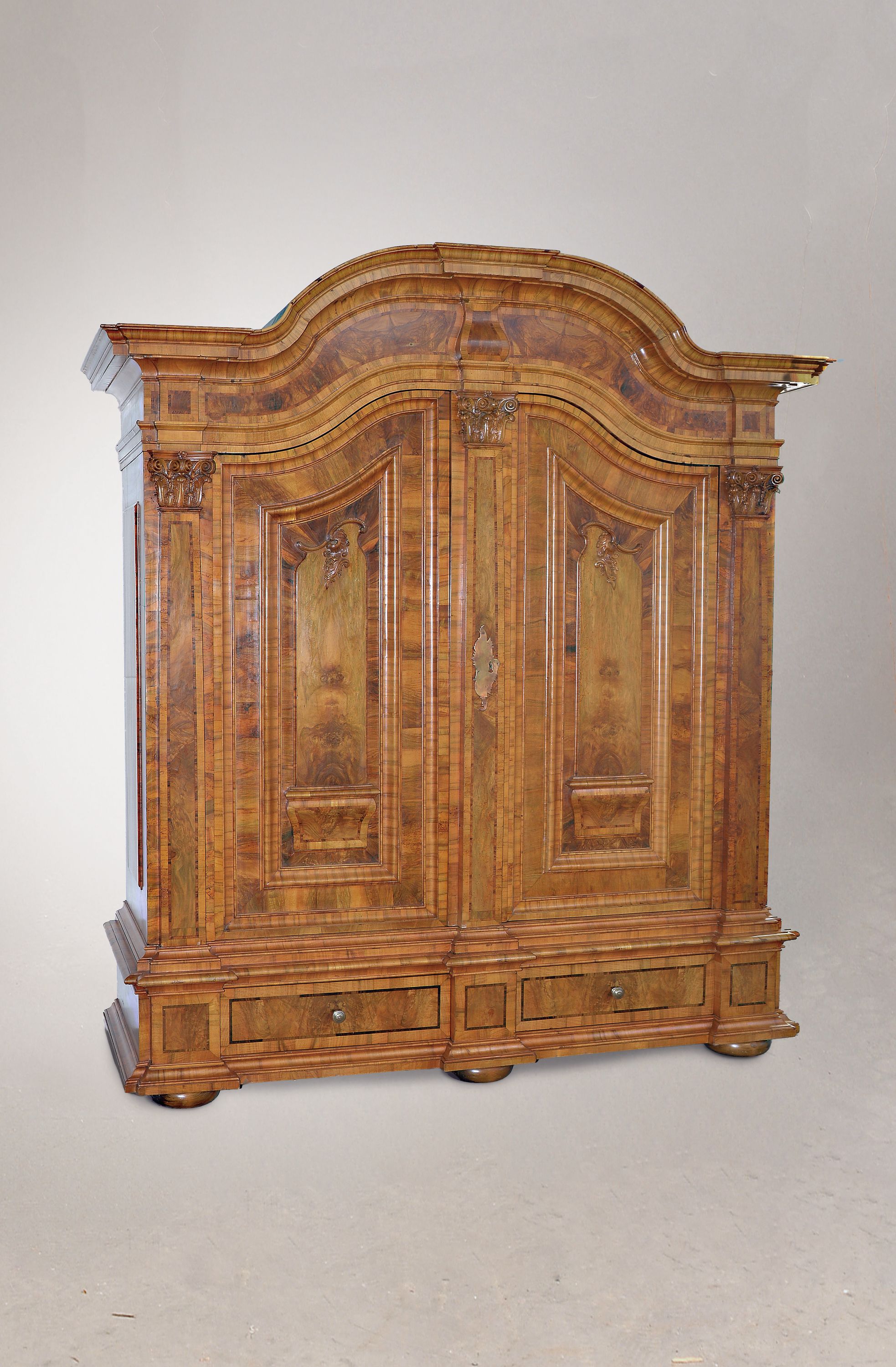 Sächsisches Schlossmöbel, zweitüriger Leipziger Barockschrank bzw. Pilasterschrank, Sachsen, um 1760, Nußbaum furniert, Maserholzdetails, orig. Schlösser, Schlüssel und Beschläge schmiedeeisern, altrestauriert, dreiteilige Fassadengliederung mit Pilastern, korinthische Kapitelle, Türfüllungen mit Rollwerk, profilierter Kranz, gedrückte Kugelfüße sekundär, ca. 248x228x76 cm, EZ 2-3, äußerst repräsentativ-architektonische Anmutung, Lit. Vgl. Haase: Dresdener Möbel des 18.Jh., 1993, Abb. 14 S.260; der vorliegende Schrank stellt ein exemplarisches Beispiel aus der Blüte sächsischer Möbelkunst dar; eine reduziertere Verwendung des Dekors, der dynamische Schwung des Giebels und die aufgelockerte Behandlung und Gliederung der Flächen belegen den spätbarocken Charakter