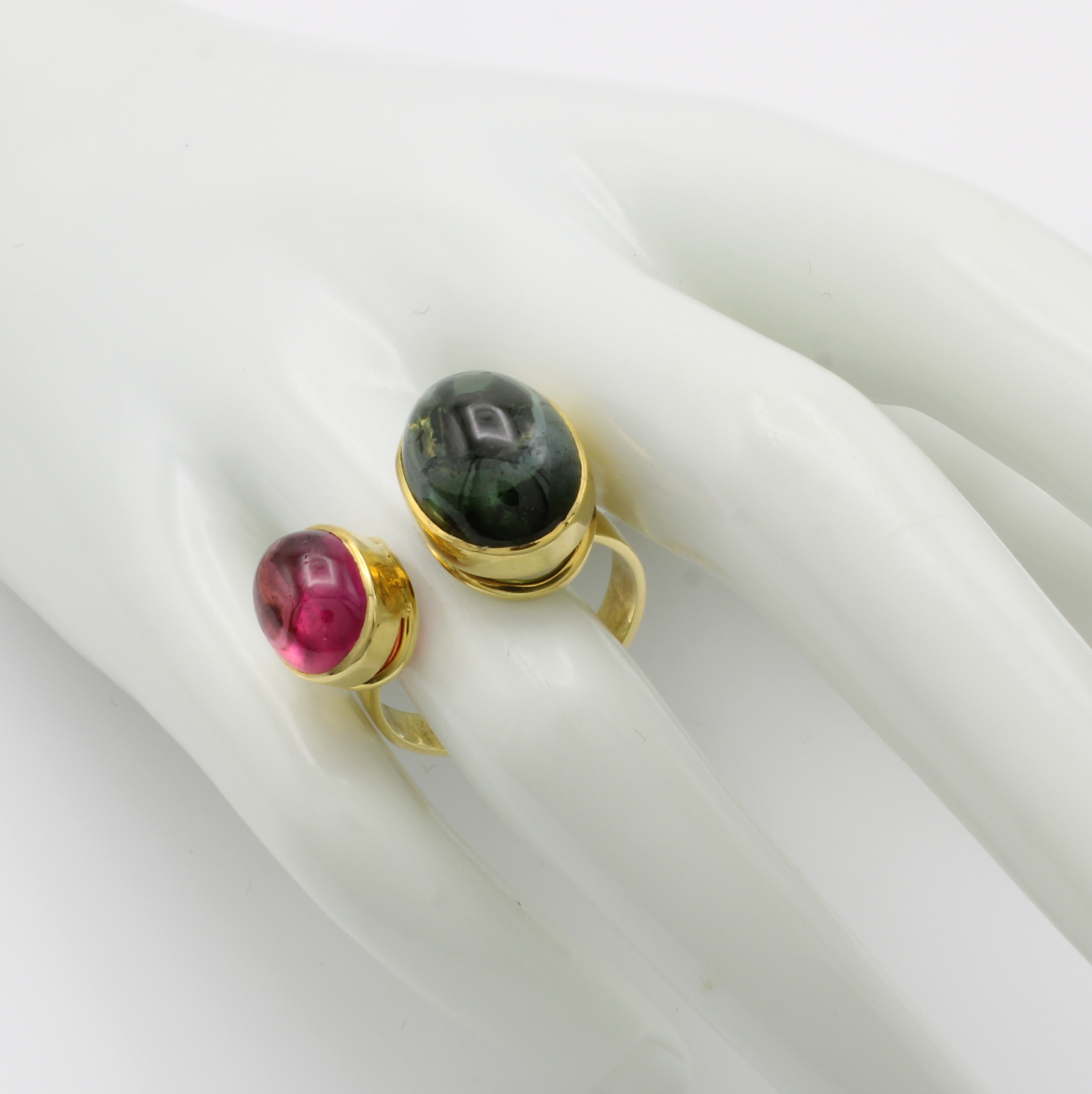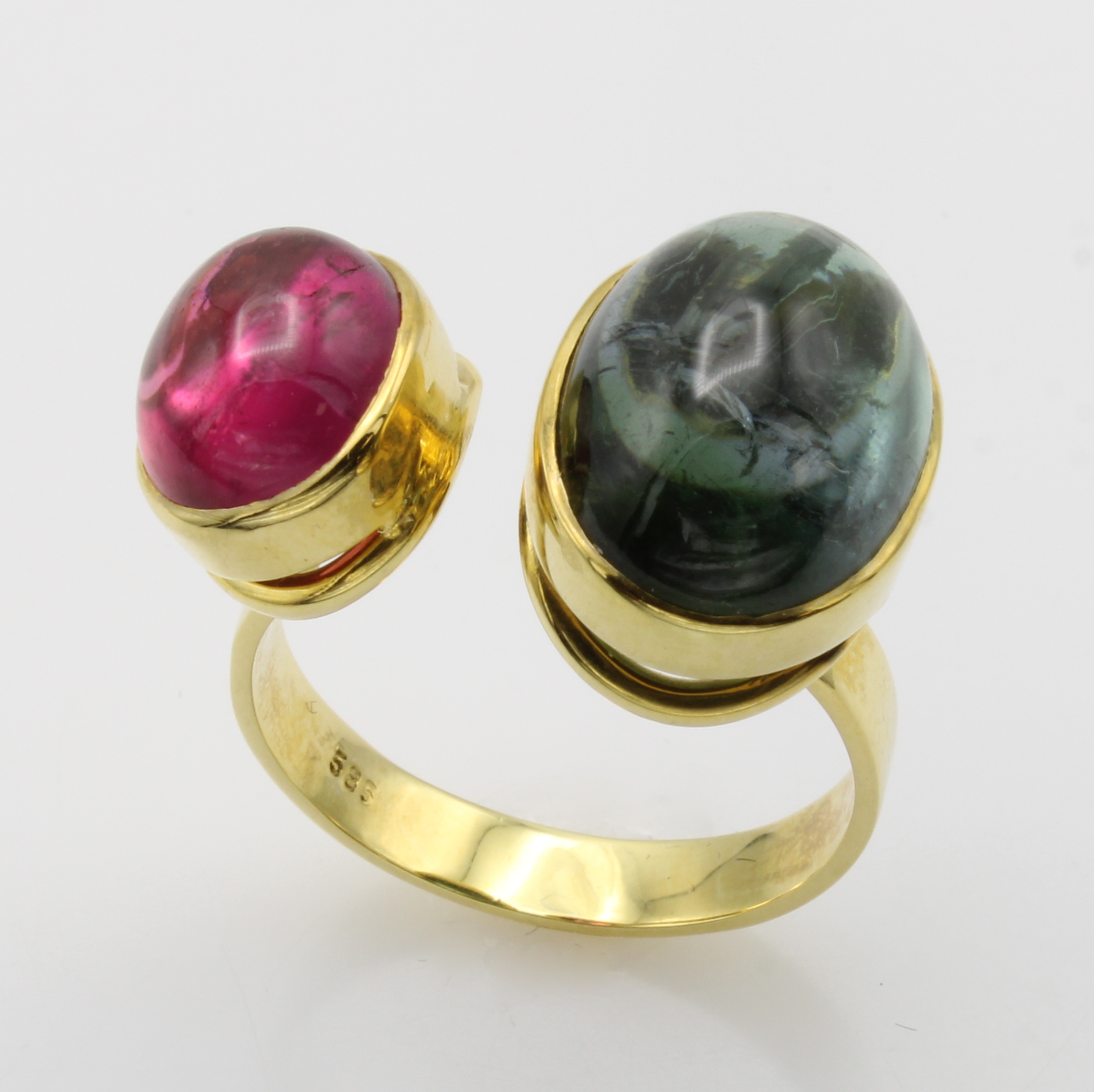 Ring mit Turmalincabochons, GG 585/000, offen gearb., rosa u. grüner Turmalin zus. ca. 15.9 ct, RW ca. 63 Schätzpreis: 3400, - EUR