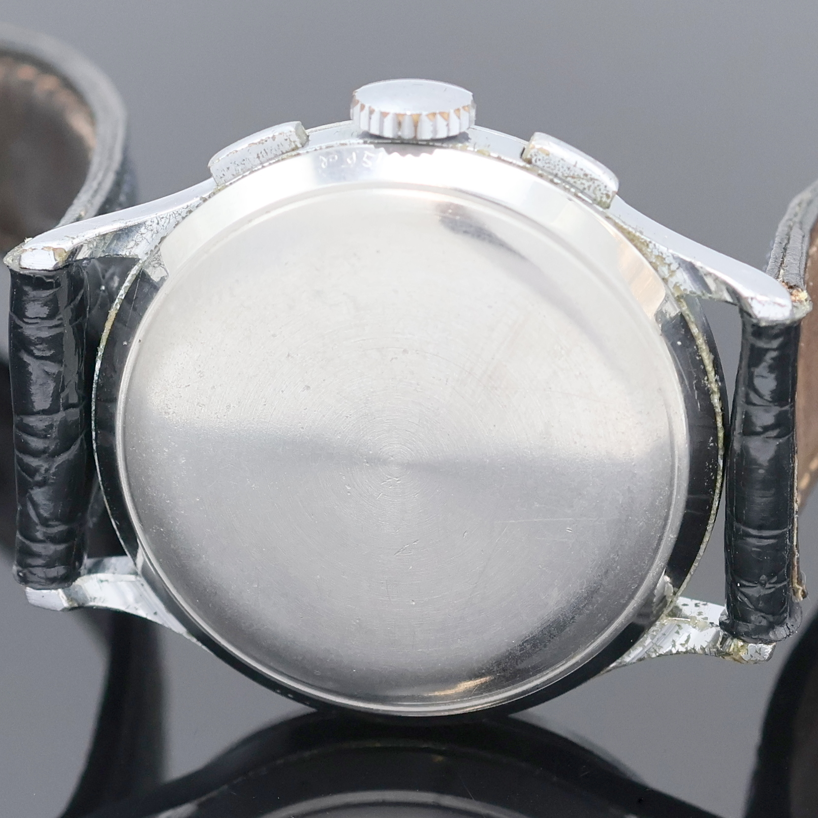 Geh., Stahlboden aufgedr., silb. Zifferbl. pat., arab. Leuchtzahlen, gebl. Leuchtzeiger