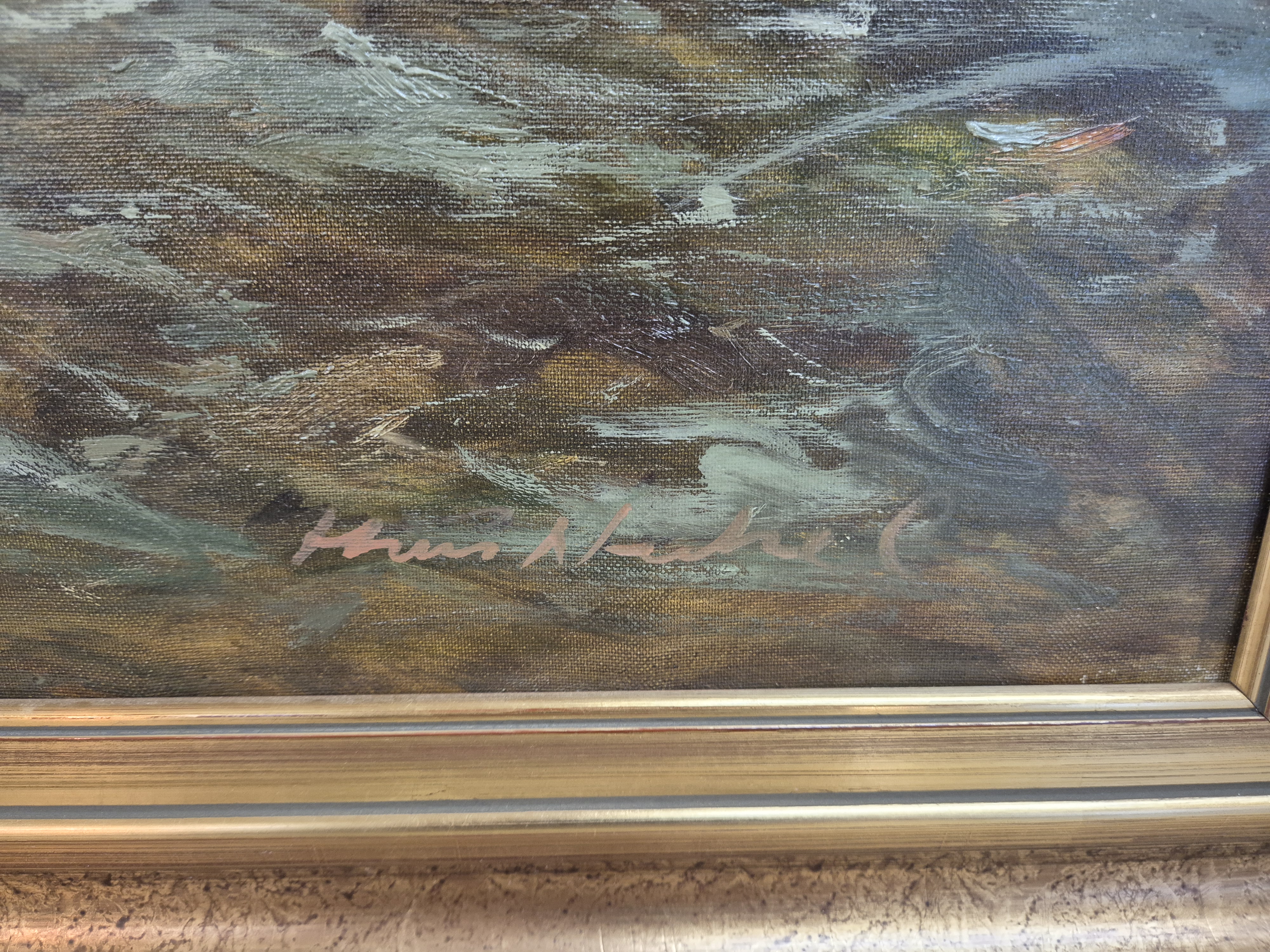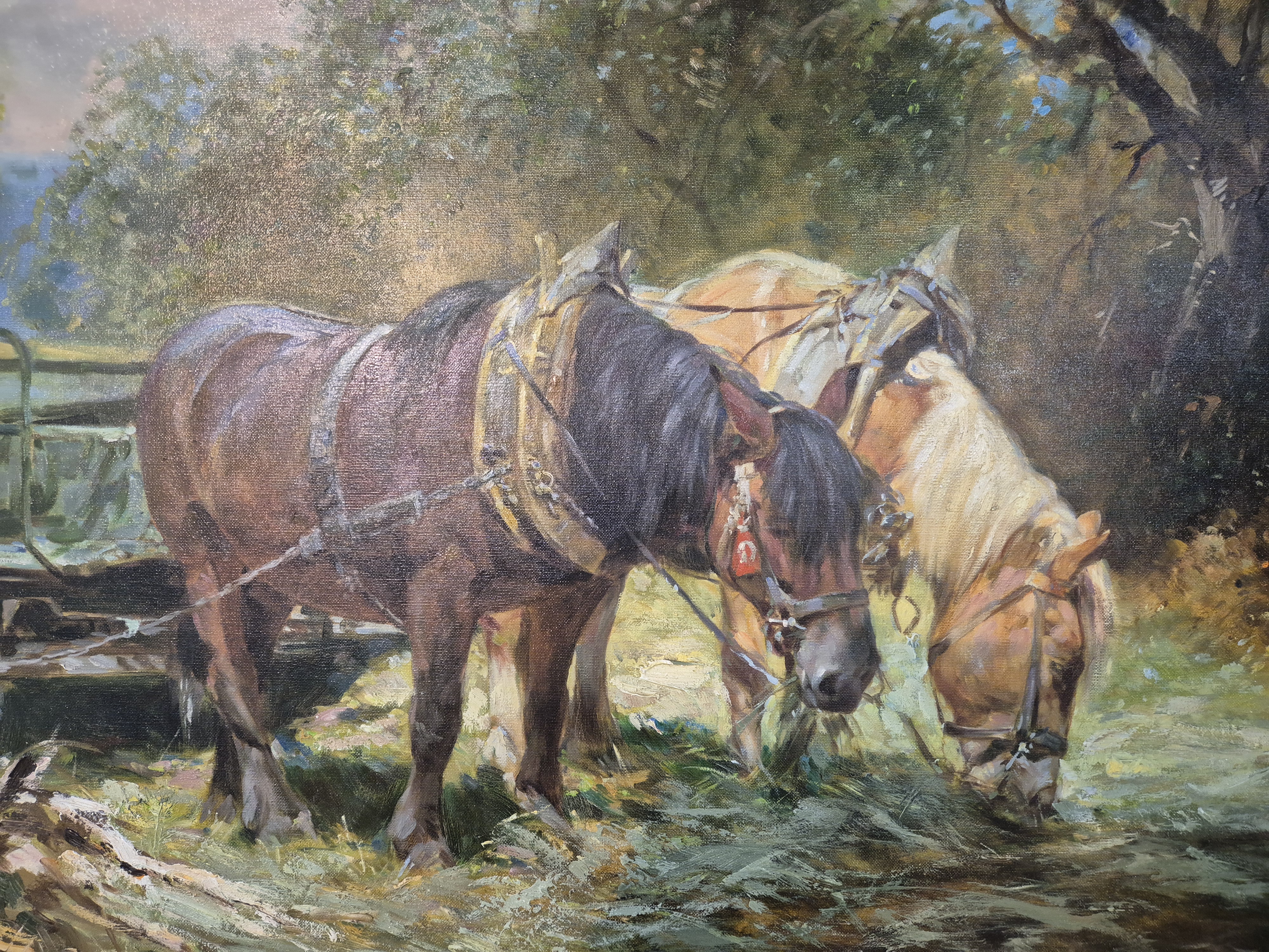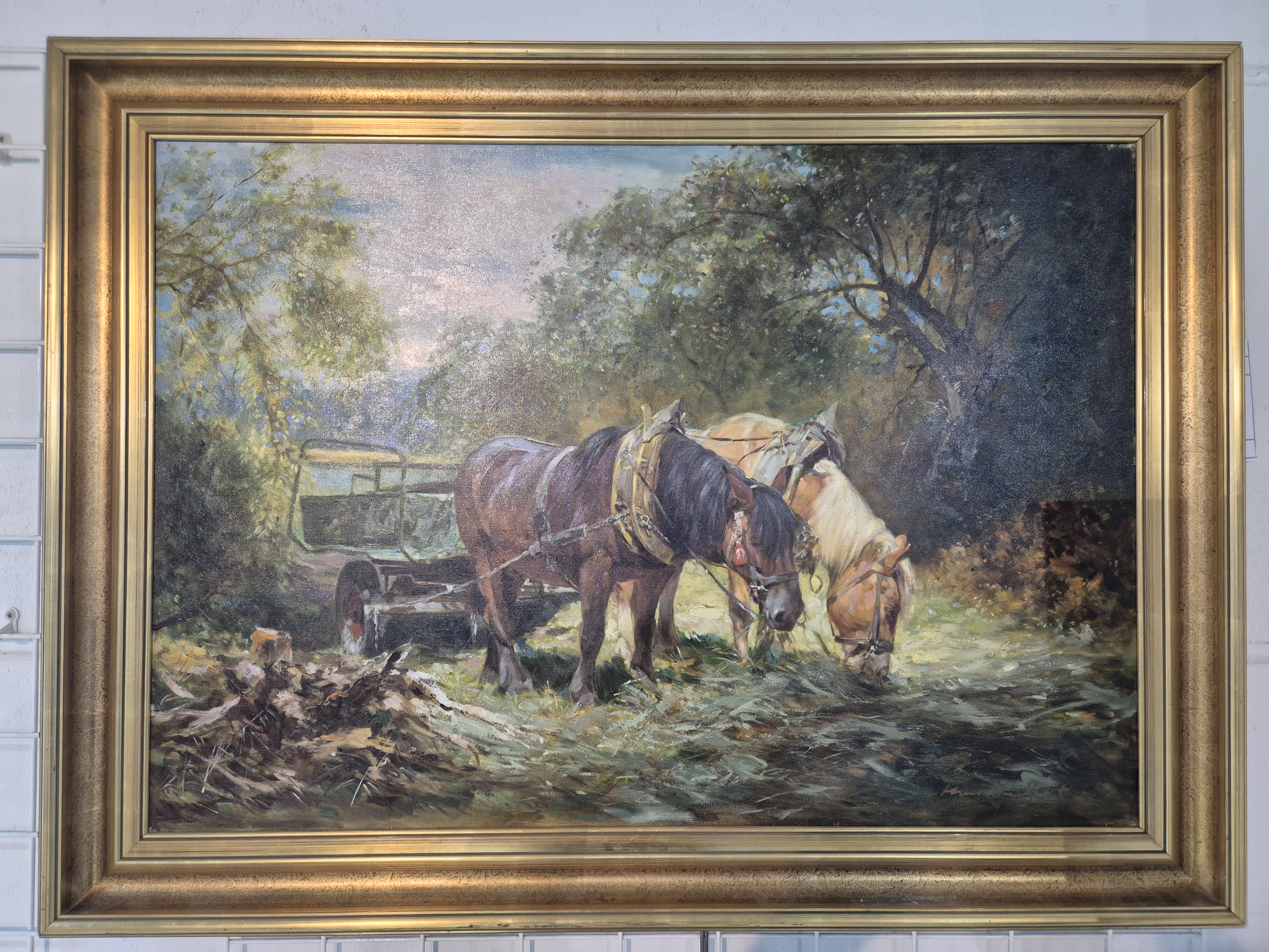 Hans Hachel ?, 20. Jh., , Zweispänner bei der Rast, Öl/Lwd, unleserlich signiert, ca 70 x 100 cm, Rahmen