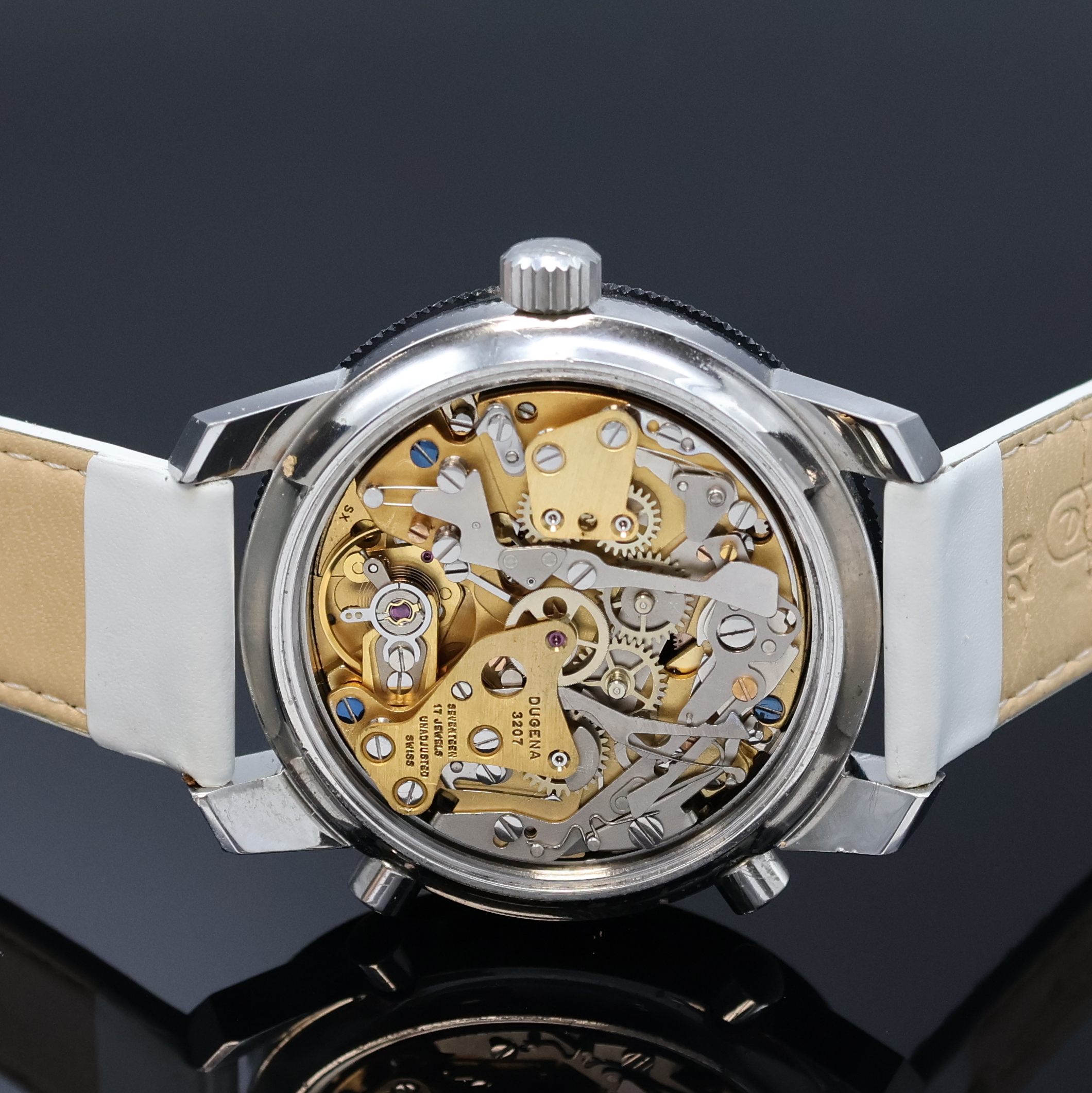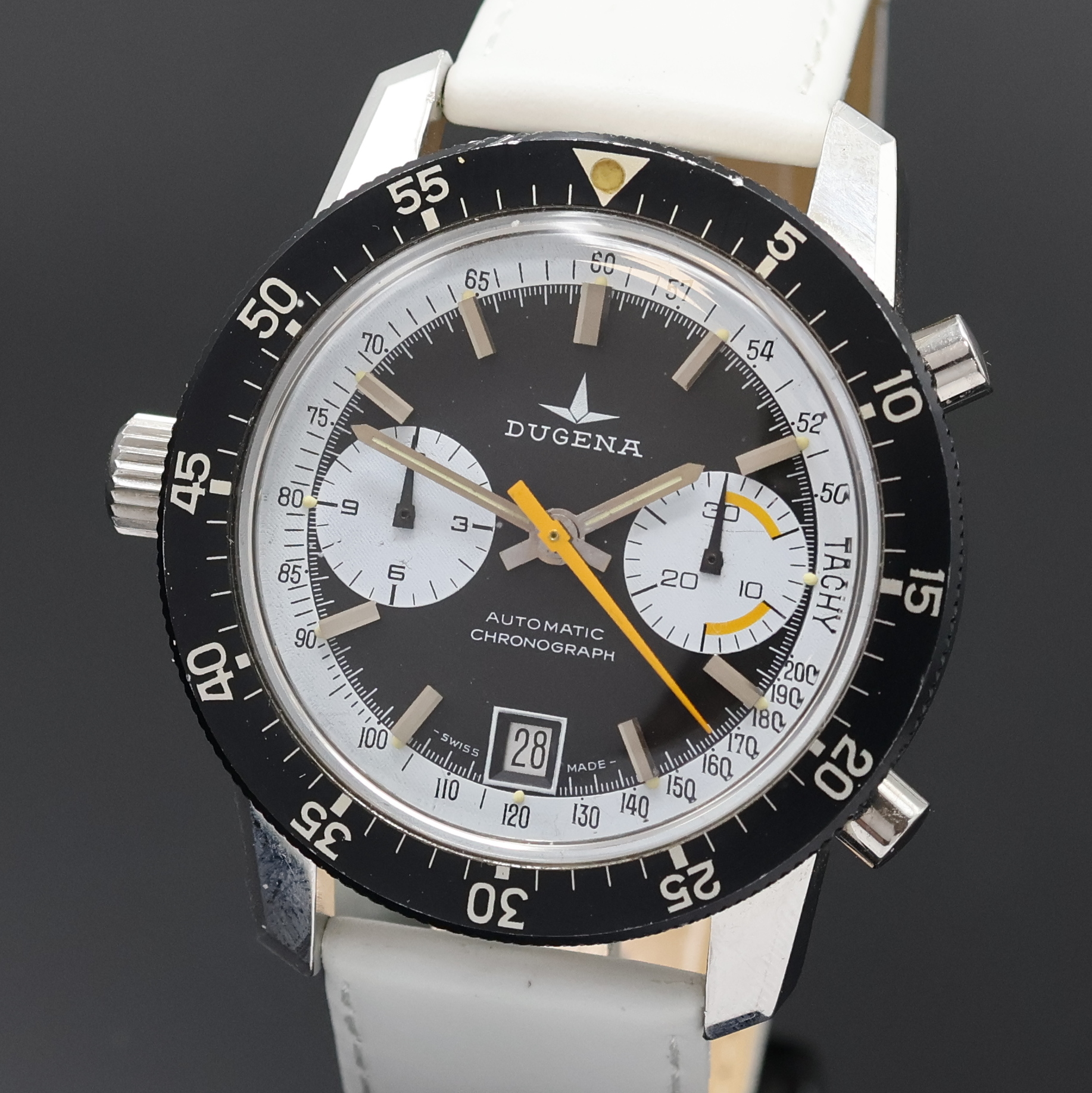 DUGENA Armbandchronograph Referenz 524150, Schweiz um 1970, Automatik, Edelstahlgeh., Boden verschr., Lünette m. 60er teil. beids. drehb., schwarzes Zifferbl. m. Leuchtind., silb. Leuchtzeiger, 12 Std.- u. 30 Min.- Zähler, Datum, Tachymeterskala, verg. Werk Kal. 3207, 17 St., D. ca. 41 mm, Überh. empf., EZ 2-3, aus Sammlungsauflösung