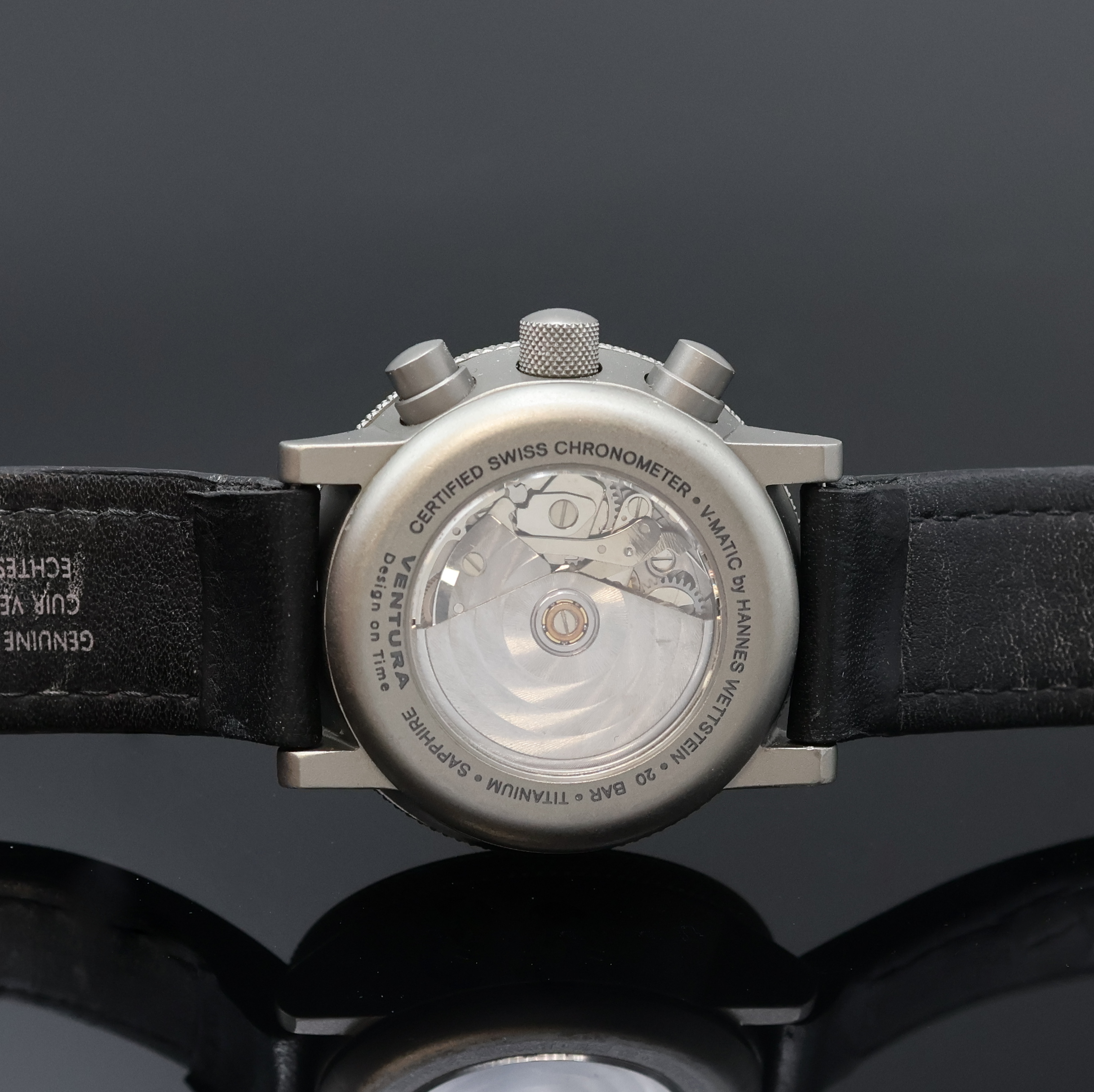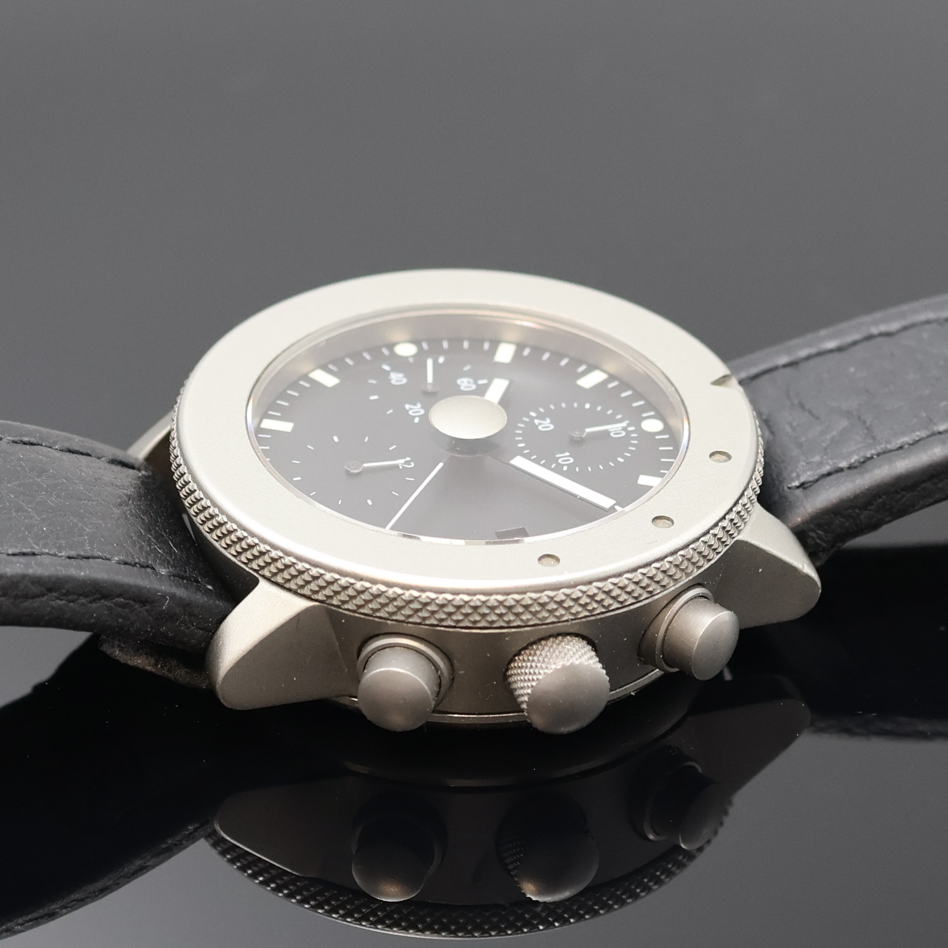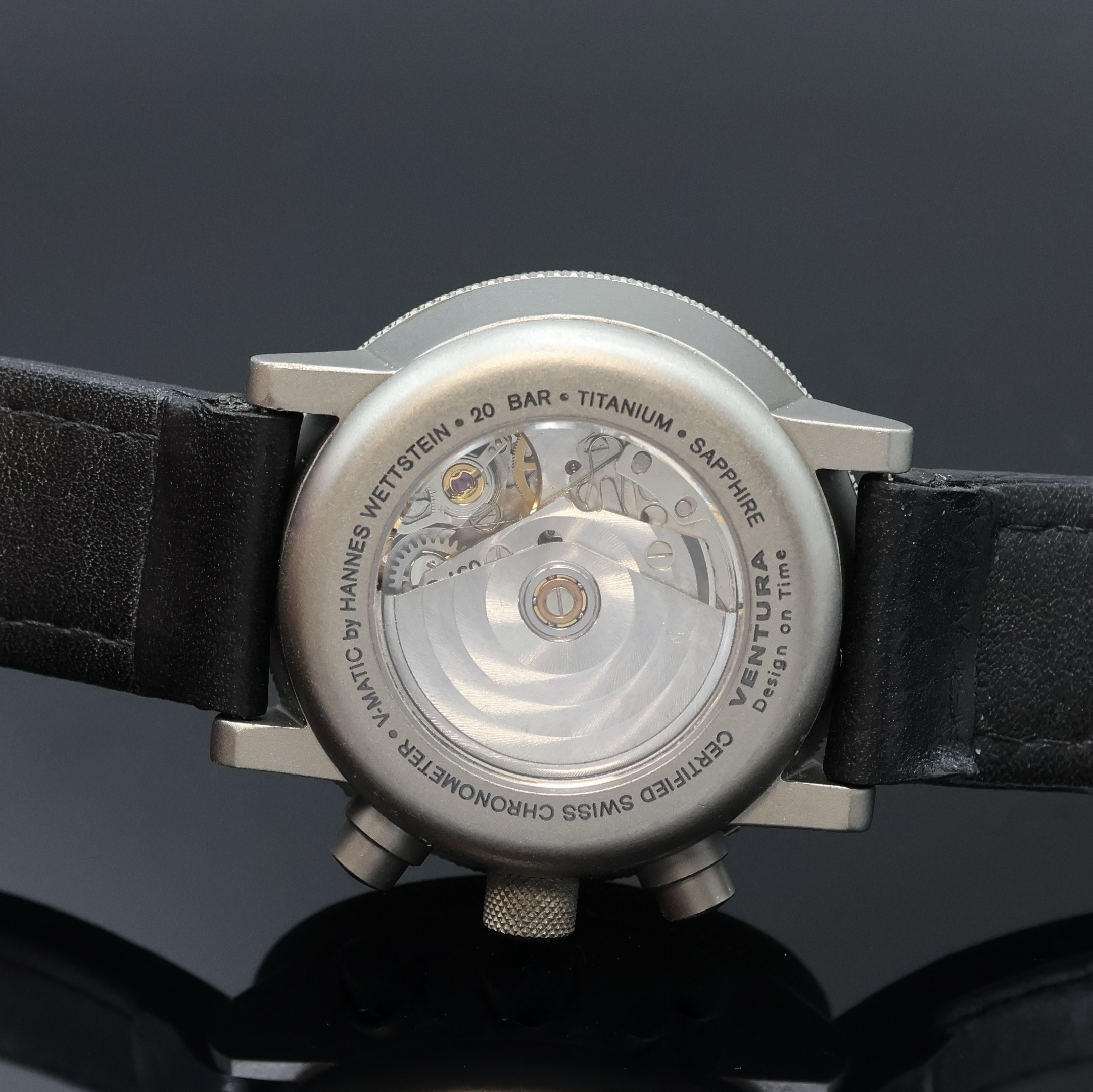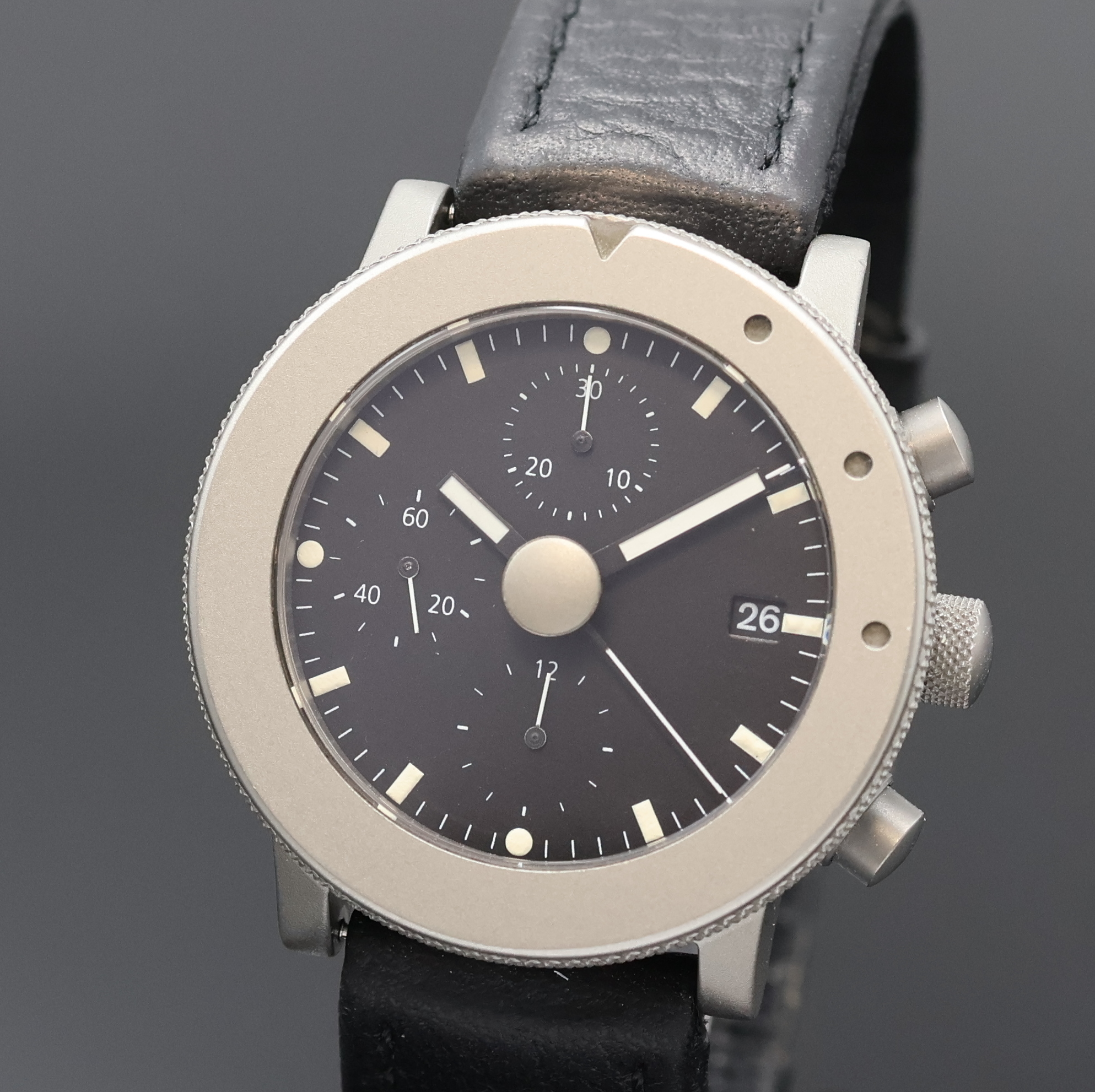 Chronometer in Titan beids. vergl., Boden aufgedr., Krone verschr., Lünette eins.
