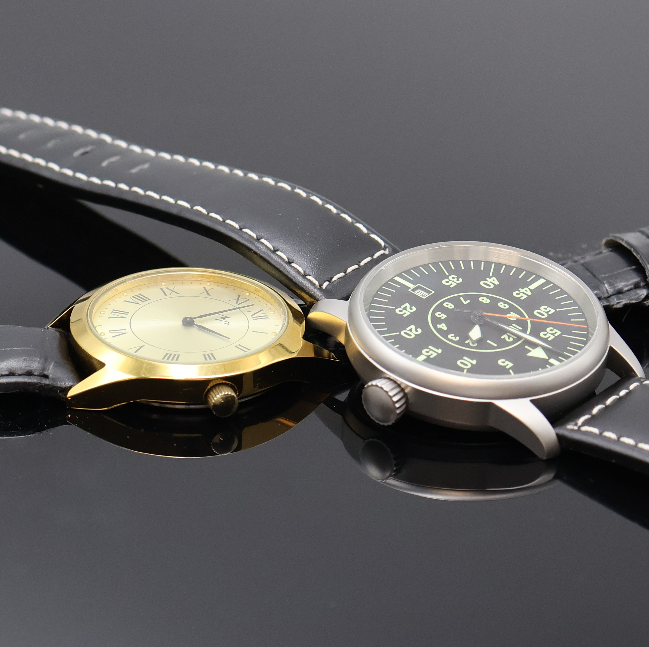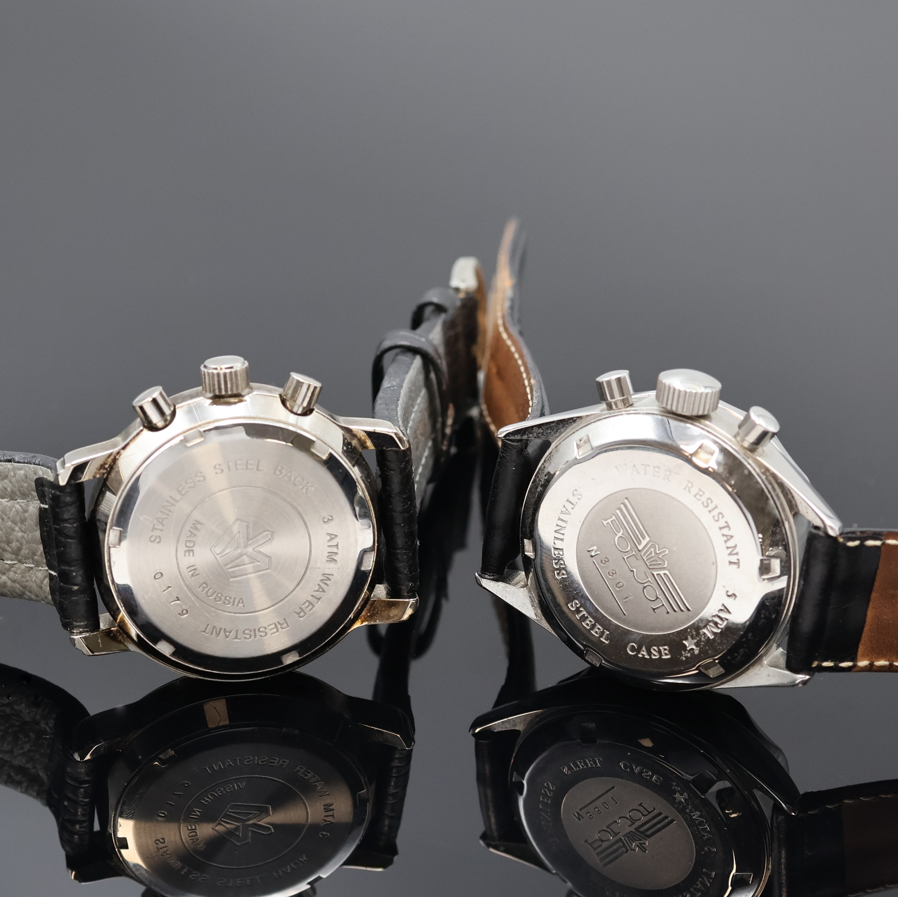 6 Russische Armbanduhren, Russland um 1980- 2010, Handaufzug/Automatik, 4 Chronographen, 2 Armbanduhren, Stahl/vergoldete Geh., Böden verschr. u. gedr., Zifferbl. 2x schwarz, 1x weiß, 1x cremefarb., 1x goldfarb., 1x grau, arab. u. röm. Zahlen, gold. Std.-Ind., teils Leuchtzeiger, 5x Datum, Kal. (Chronographen) 3133, 1x Kal. 1801.1, D. ca. 36-40 mm, Überh. empf., EZ 2-3, aus Sammlungsauflösung