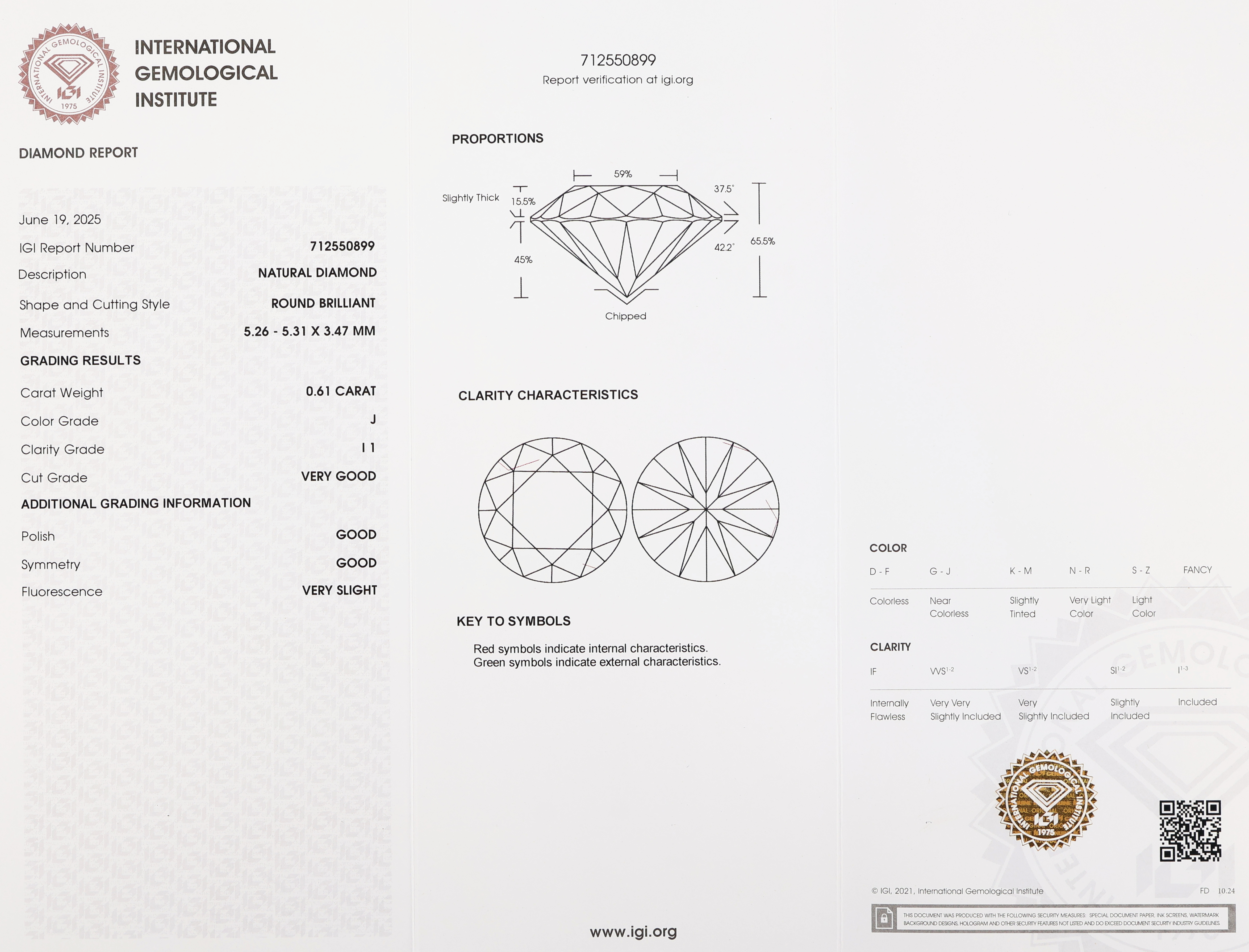 Loser Brillant 0.61 ct l.get.Weiß (J)/p1, verschweißt, Polish good, Symmetry good, Fluorescence very slight, mit IGI Zertifikat Schätzpreis: 1265, - EUR
