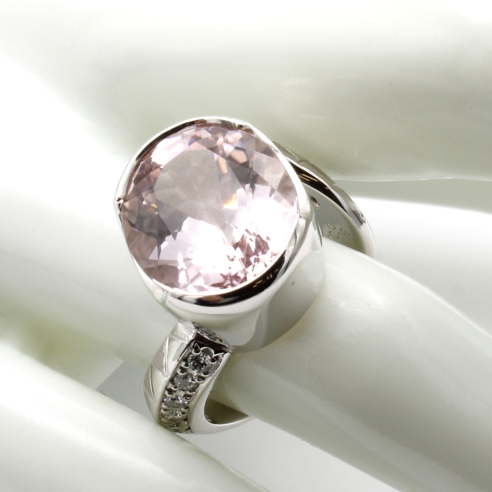 Ring mit Brillanten und Kunzit, 900er Platin, oval fac. Kunzit ca. 8.763 ct, 13 Brill. zus. ca. 0.28 ct, Ringschiene m. Muster, RW ca. 54 Schätzpreis: 4000, - EUR