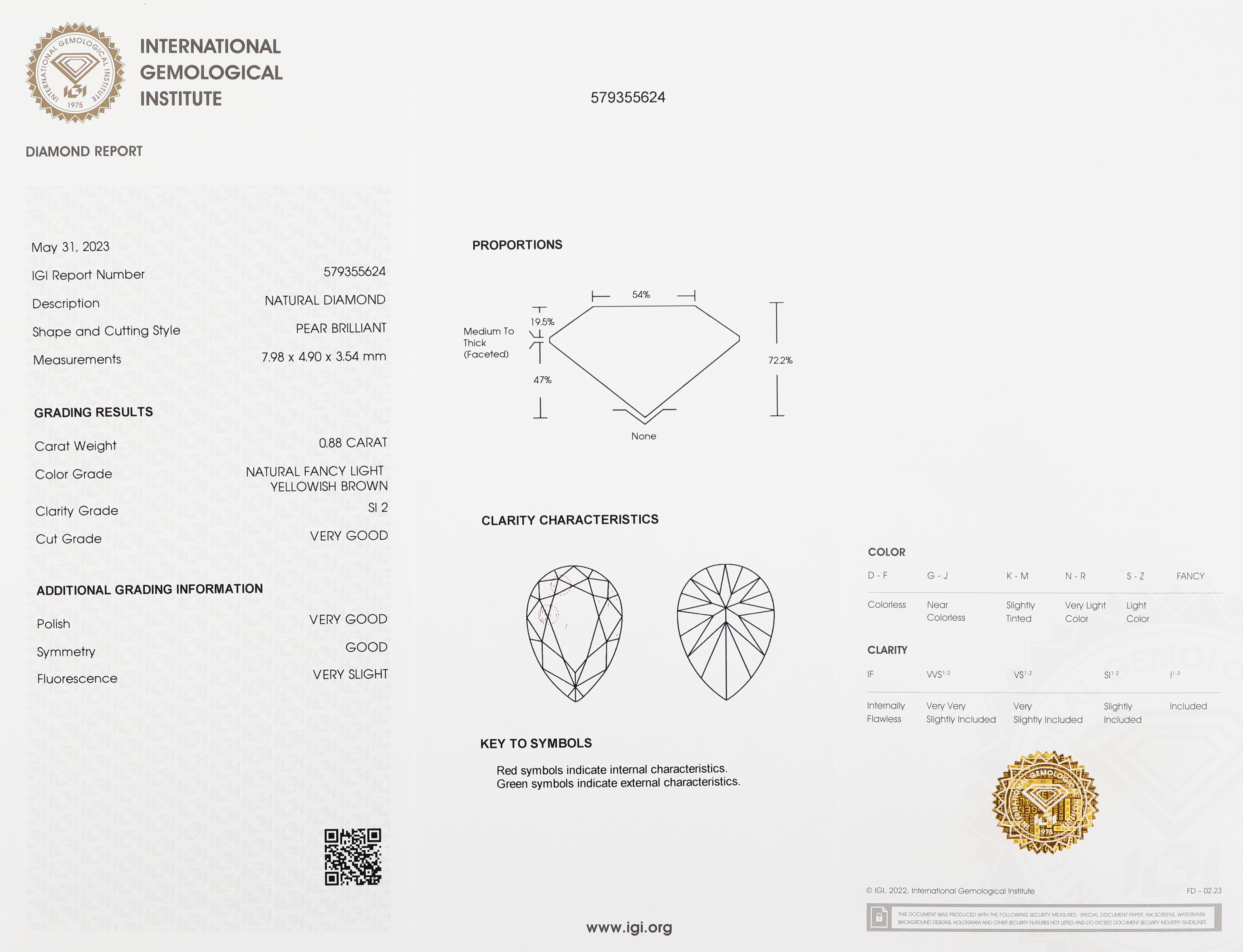 Loser Diamant-Tropfen 0.88 ct natural fancy light yellowish brown/si2, verschweißt, Polish very good, Symmetry good, Fluorescence very slight, IGI Zertifikat Schätzpreis: 2185, - EUR