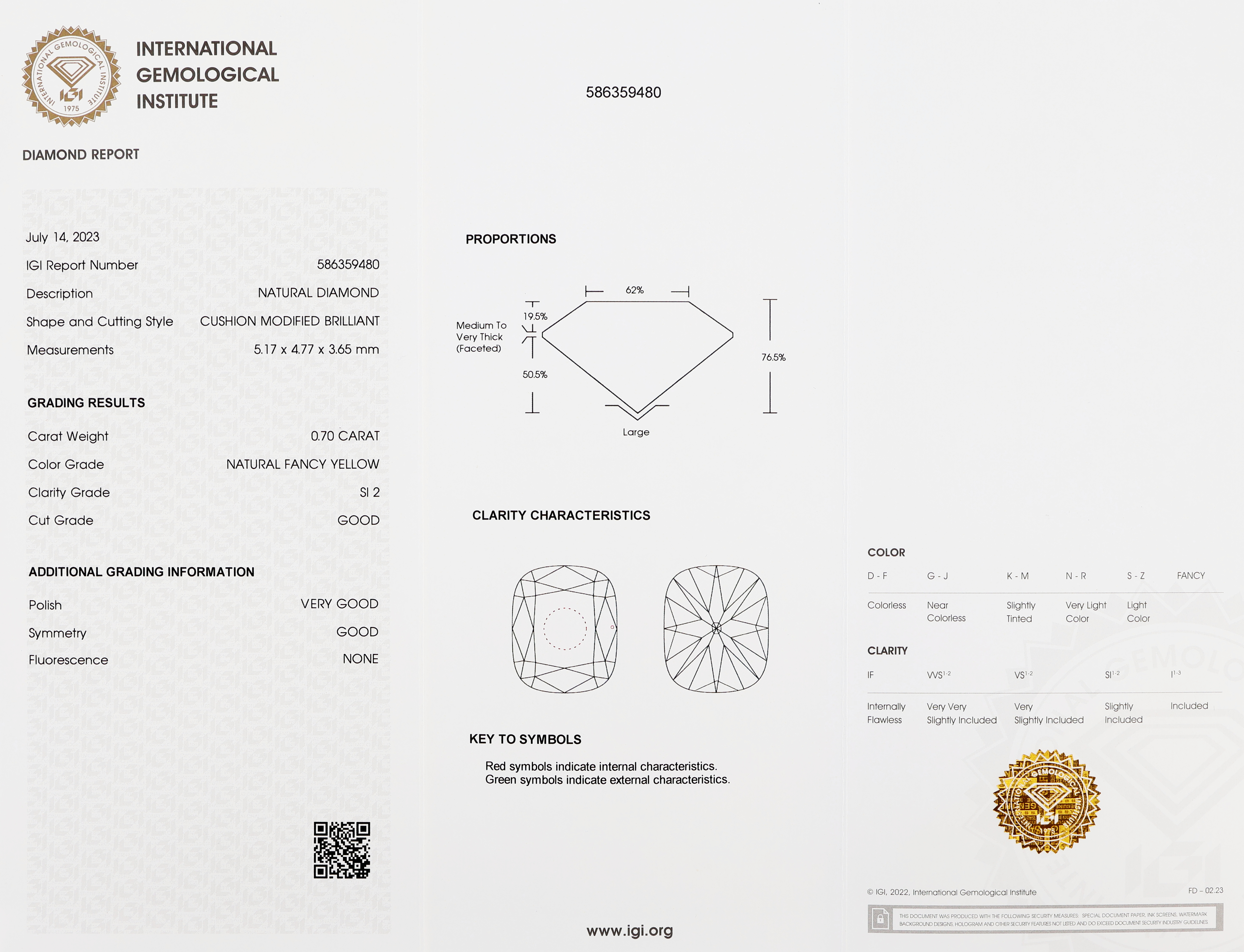 Loser Diamant 0.70 ct Natural fancy yellow/si2, Cushion modified, verschweißt, Polish very good, Symmetry good, Fluorescence none, IGI Zertifikat Schätzpreis: 2185, - EUR