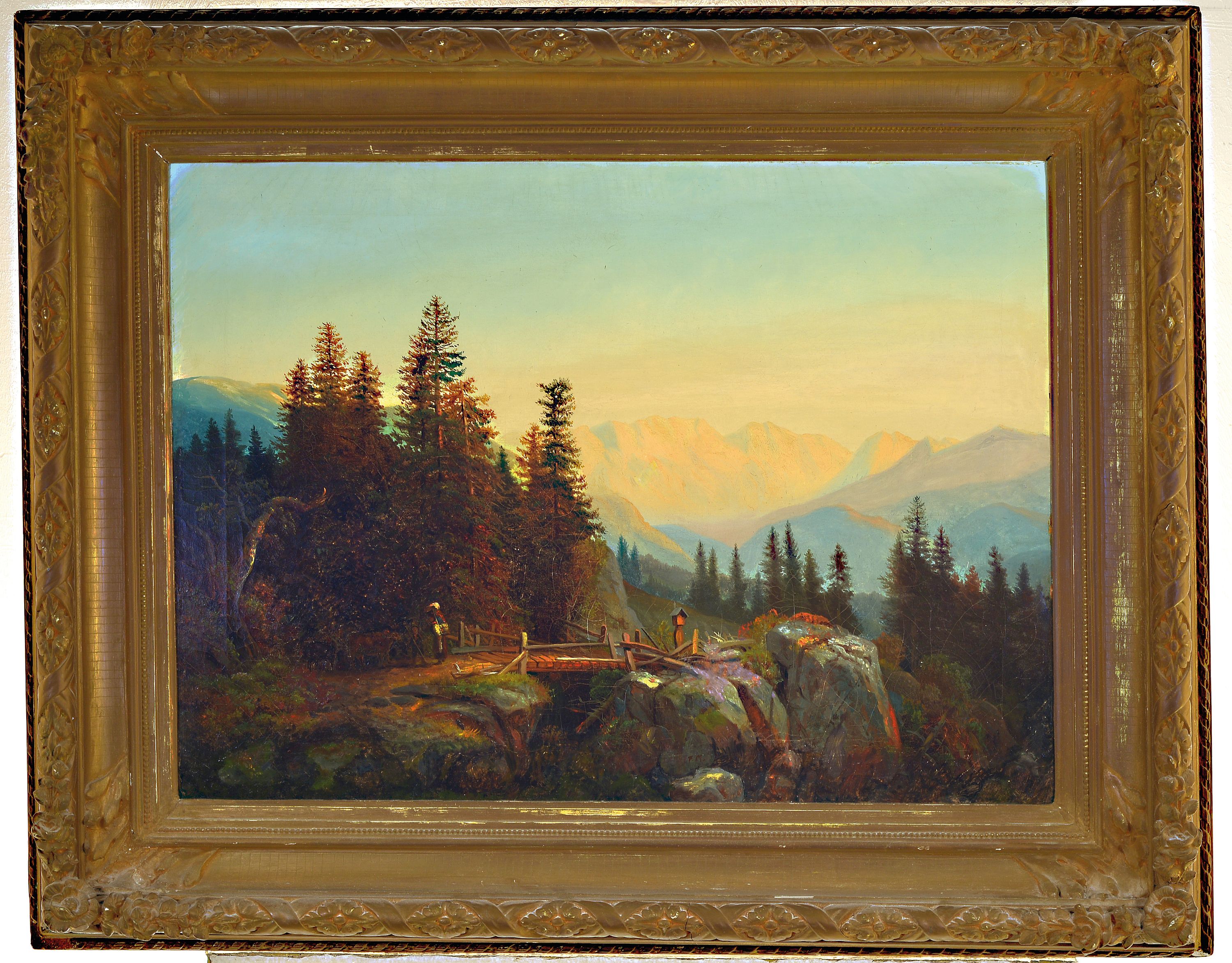 und Marterl, im Hintergrund Alpenglühen, Öl/Lwd, unsign., rest., ca. 59x81cm, Prunkrahmen