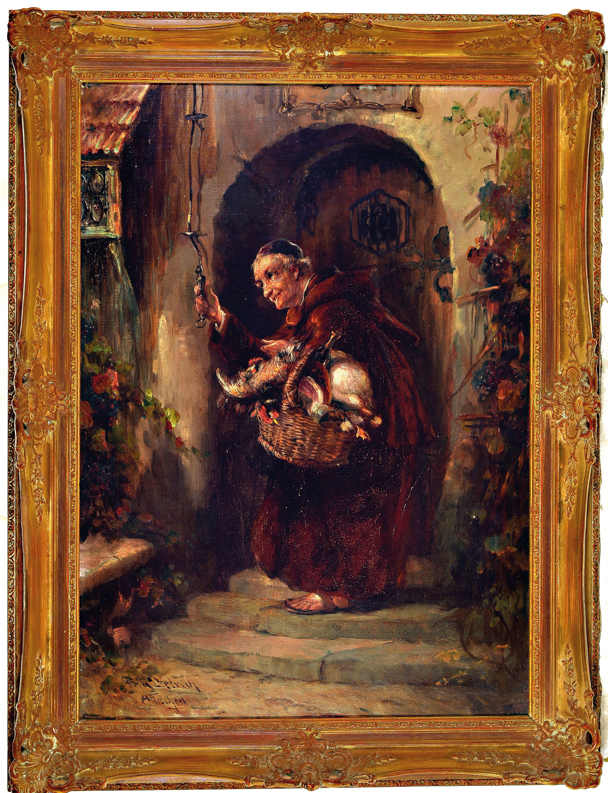 Korb läutet an einer Pforte, Öl/Lwd., links unten sign. u. bez. München, 70x50