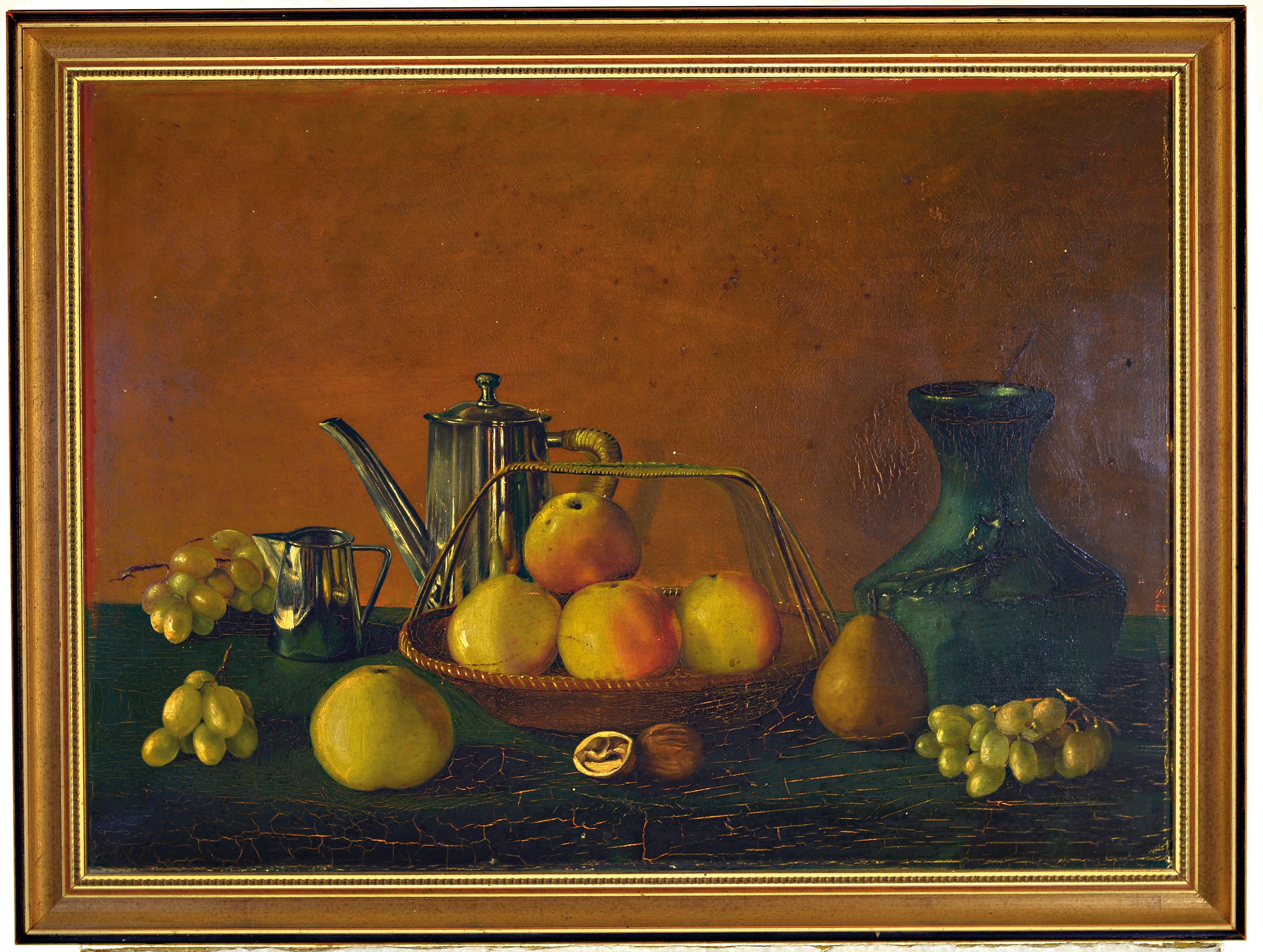 Unbekannter Maler, um 1910-20, Stillleben mit Silberkanne, Vase und Obst, Öl/Lwd,
