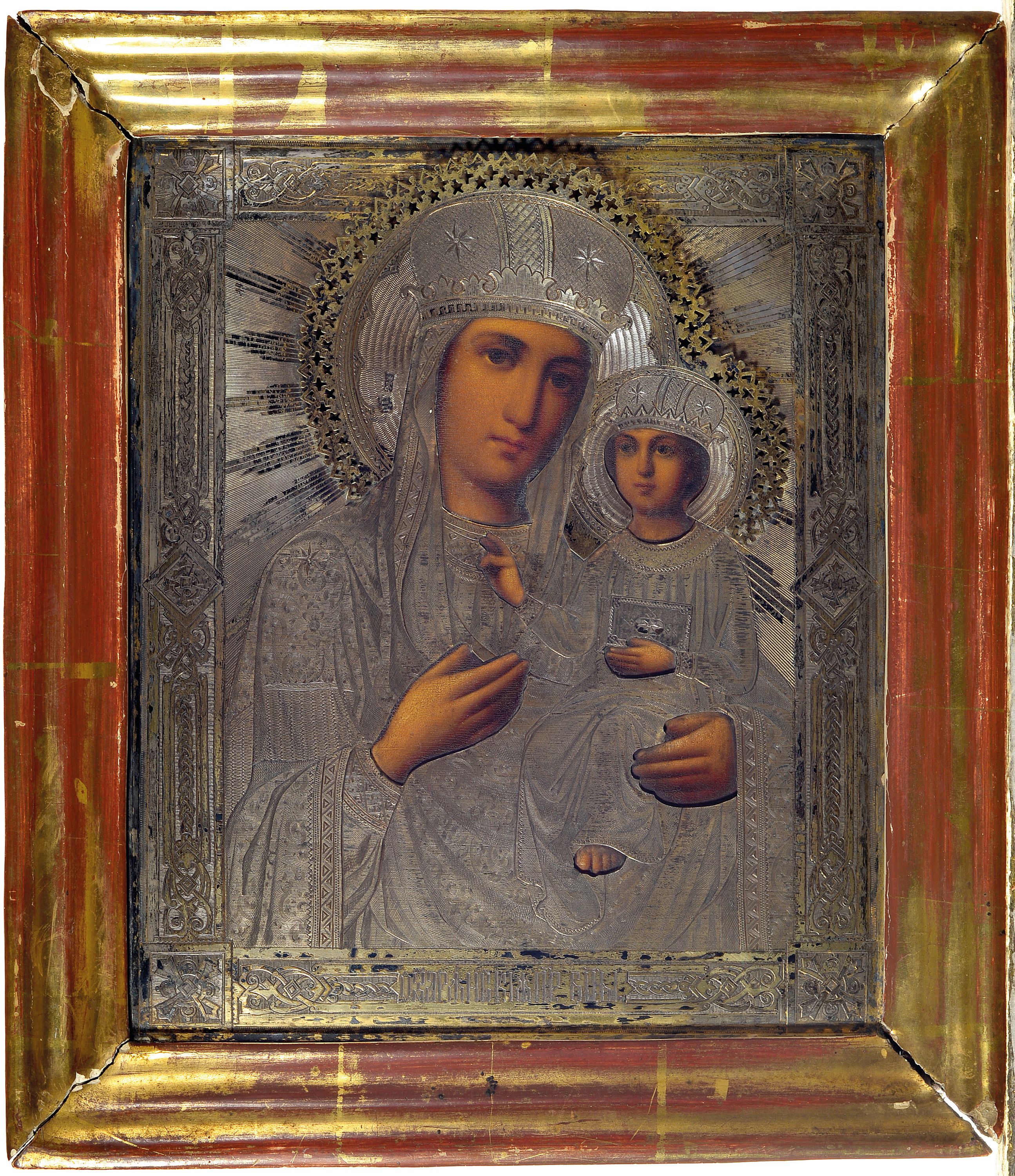 Ikone, Russland, um 1900, mit Silberoklad, Gottesmutter mit Kind, Tempera auf Holz,