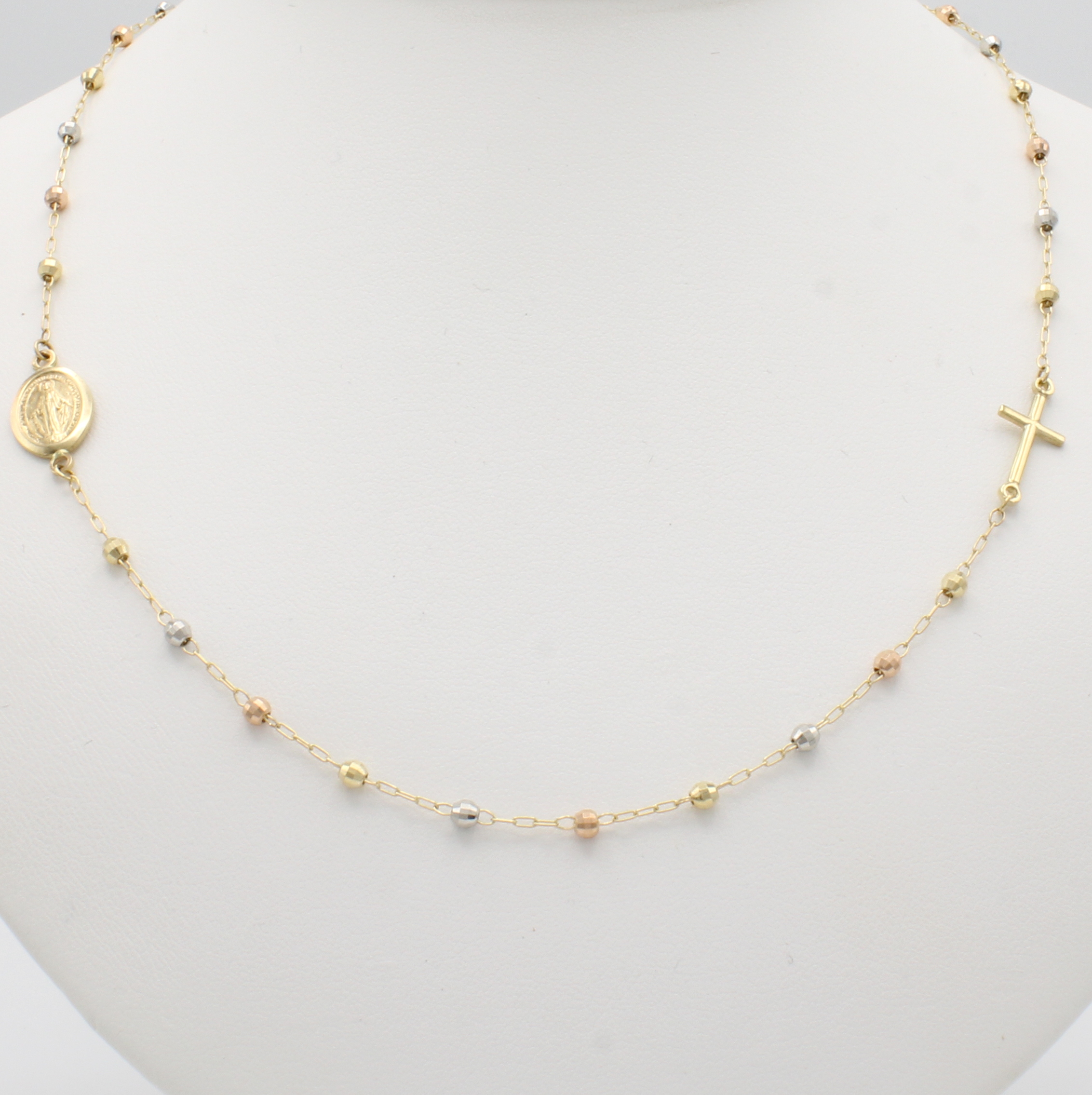 Collier, GG/RG/WG 585/000, anged. Rosenkranzmit Kreuz und Madonna, Karabinerschl., L. ca. 45 cm