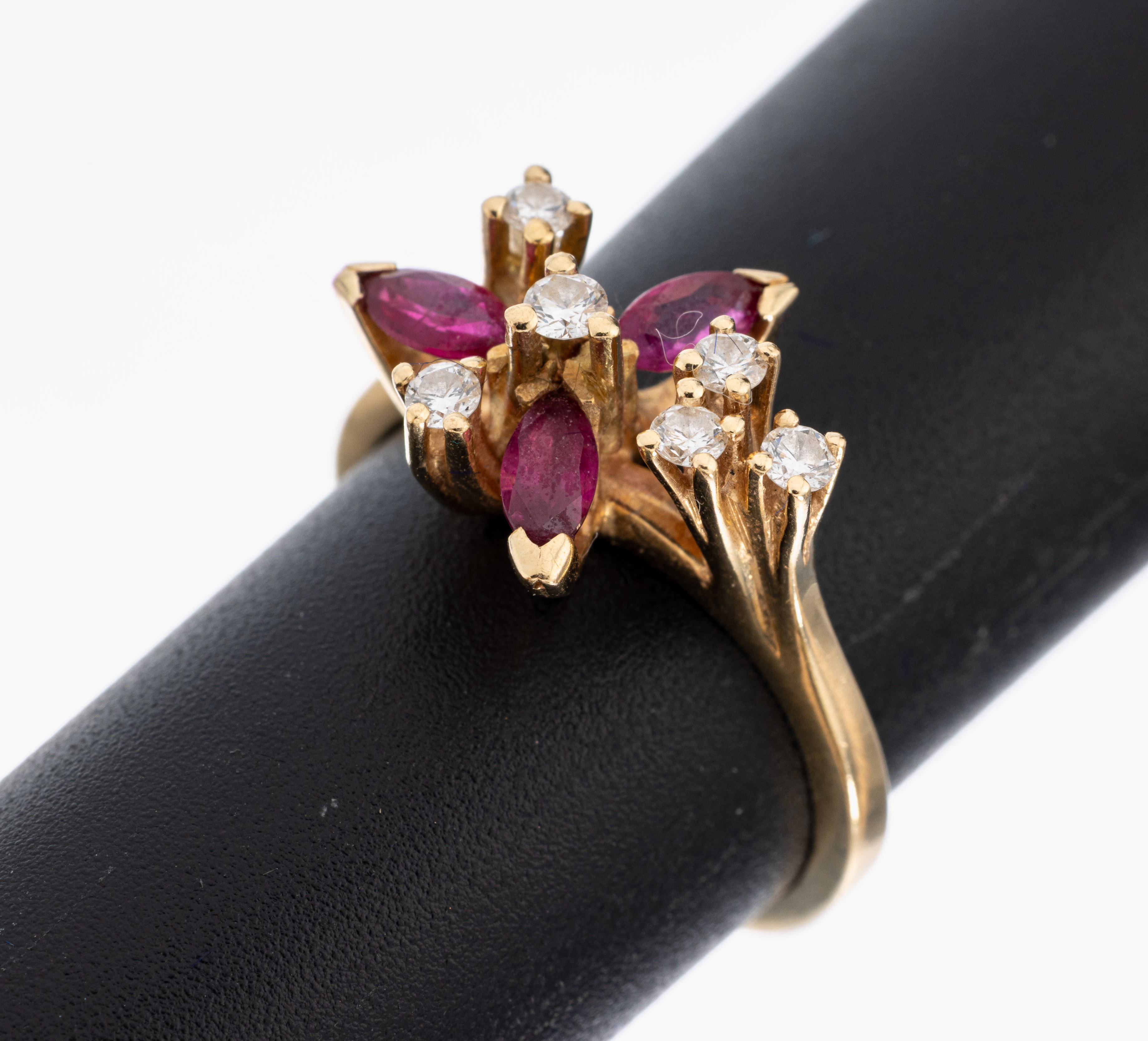 14 kt Gold Rubin-Brillant-Ring, GG 585/000,3 Rubin-Navettes zus. ca. 0.32 ct, 6 Brillanten