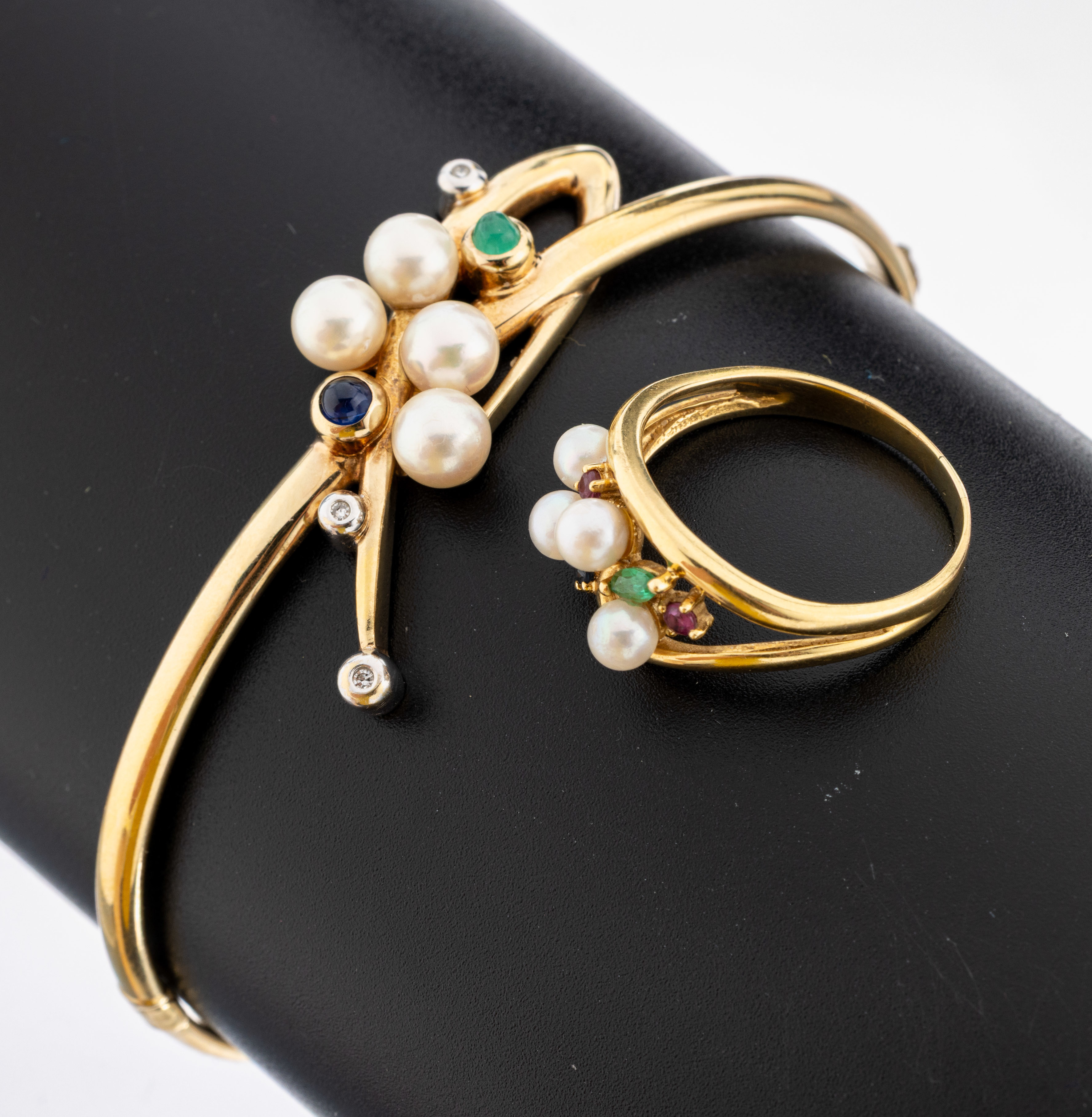14 und 18 kt Gold Konvolut, best. aus: 1 Armreif, GG 585/000, Mittelteil mit 4 Akoyazuchtperlen,