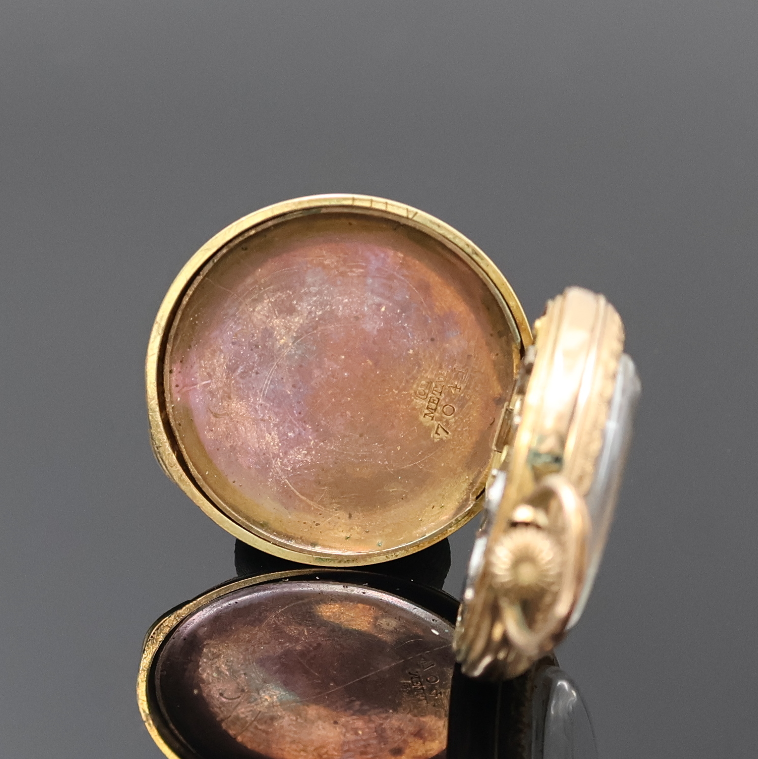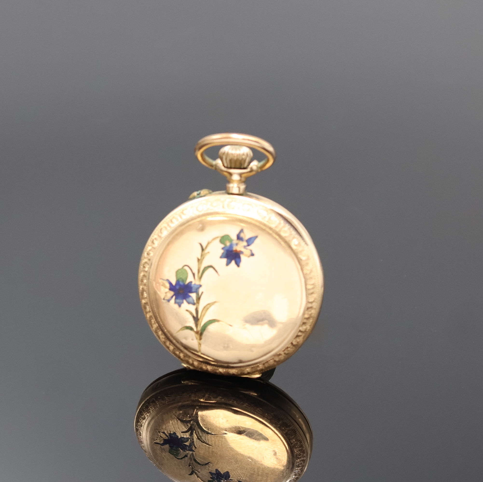 Metallcuvette, rücks. m. floraler Emaillierung, Emailzifferbl. m. röm. Zahlen,