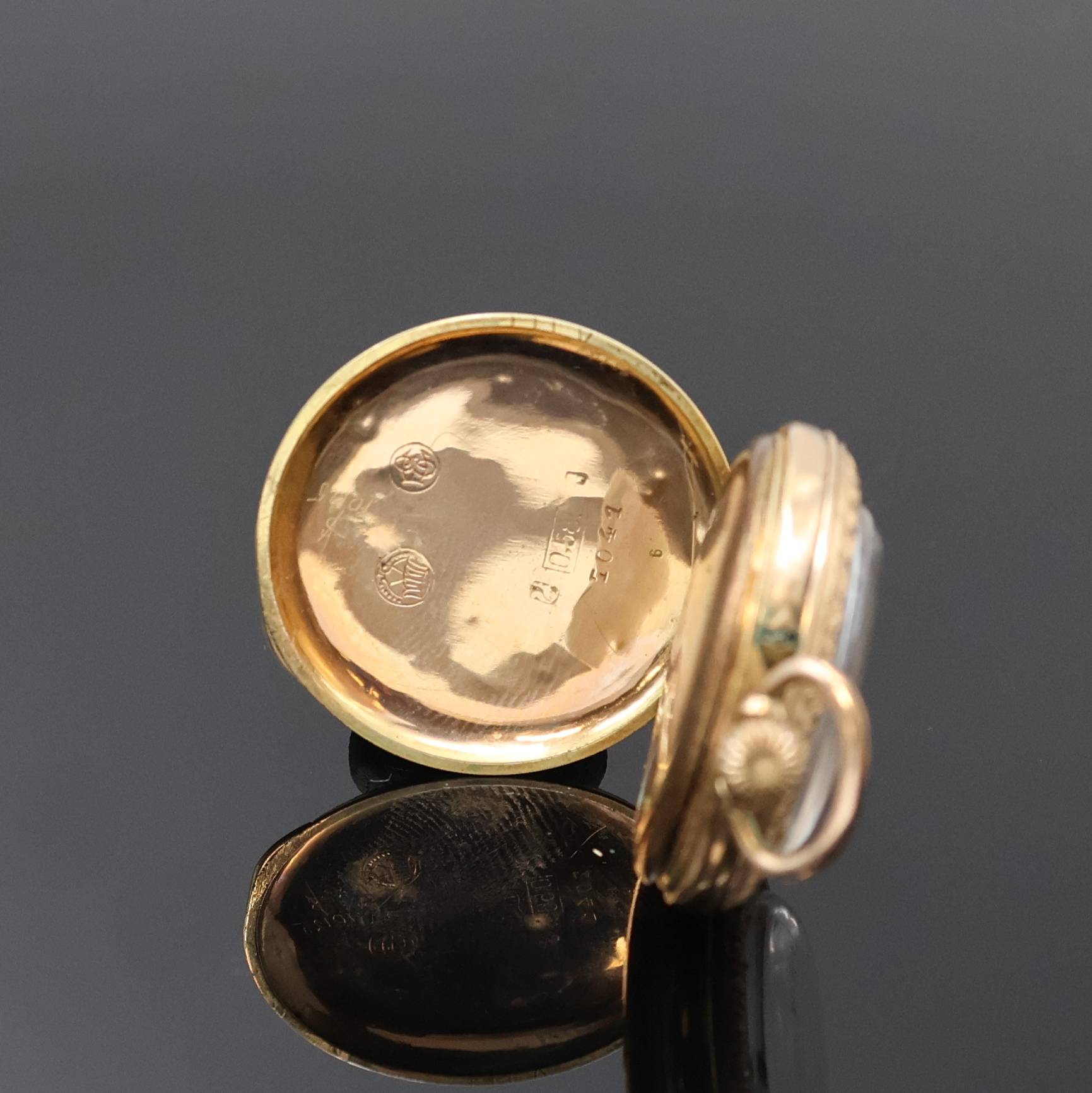 Offene Damentaschenuhr mit Emaillierung in RG 585/000, Schweiz um 1900, Geh. dell.,