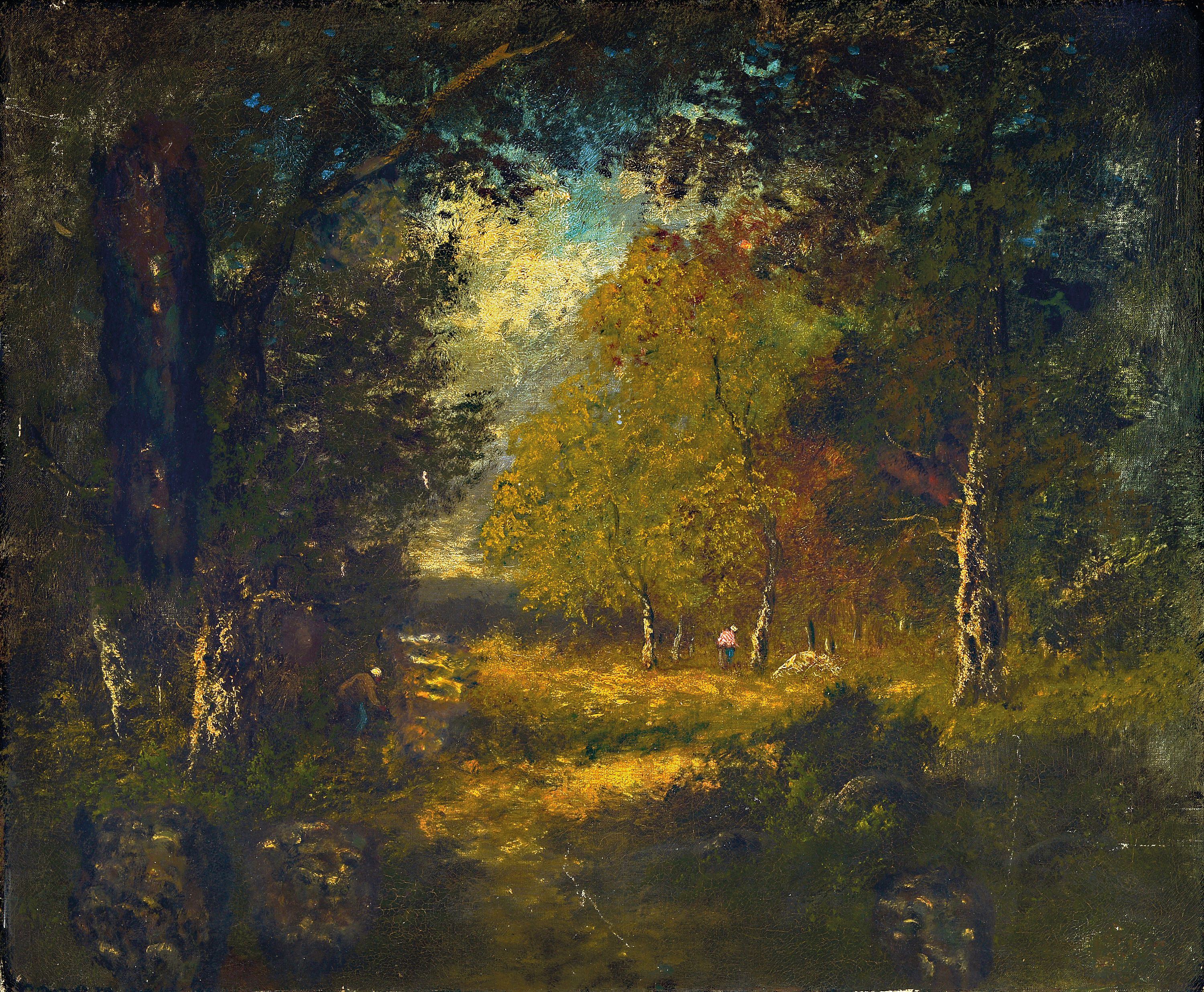 Unbekannter Maler der Schule von Barbizon, um 1900, zwei Holzsammler im Wald, Öl/Lwd,