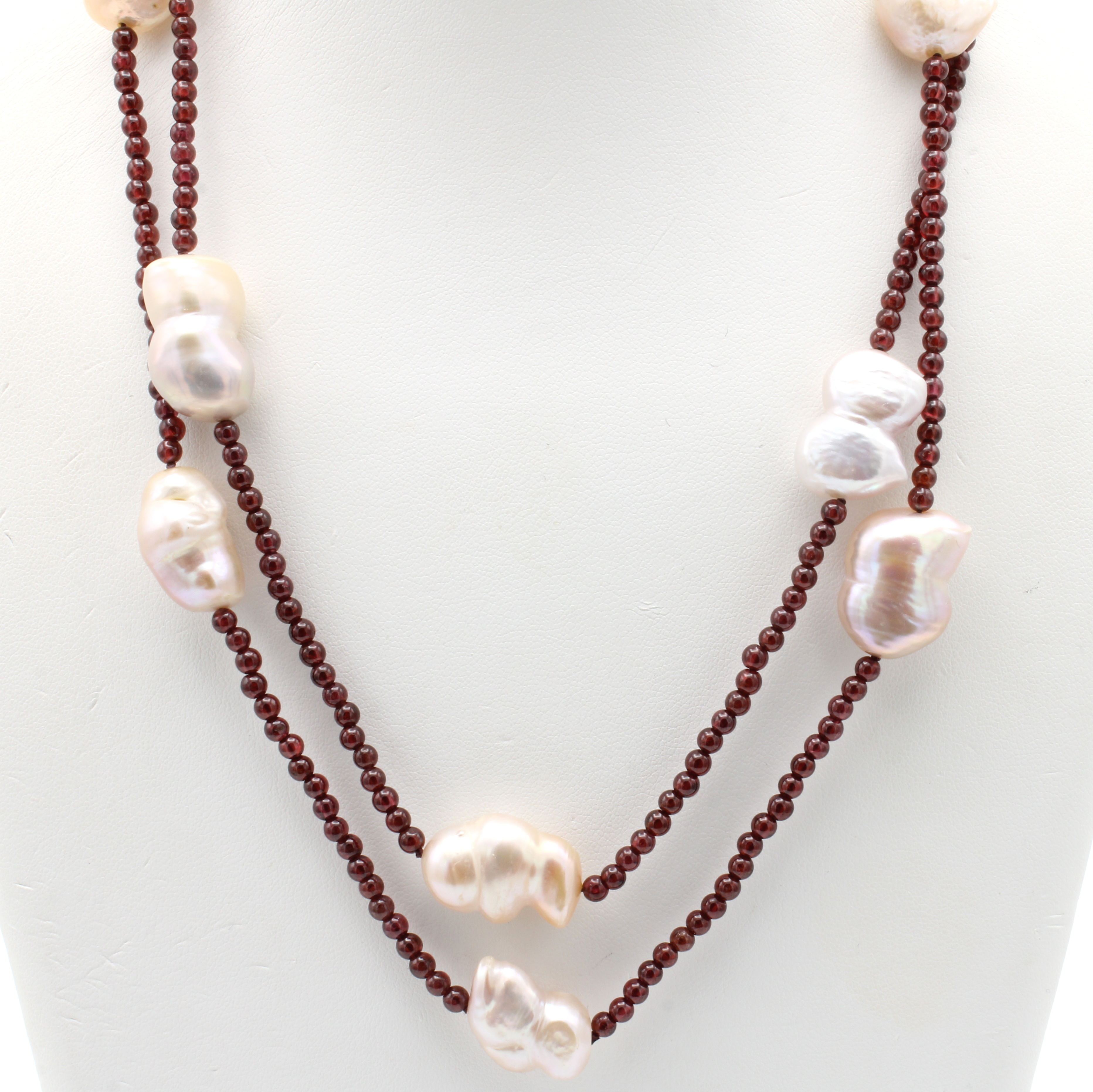 Lange Kette mit Granaten und Süßwasserzucht- perlen, barocke Perlen v. multicolorfarb. Lüster, L. ca. 100 cm