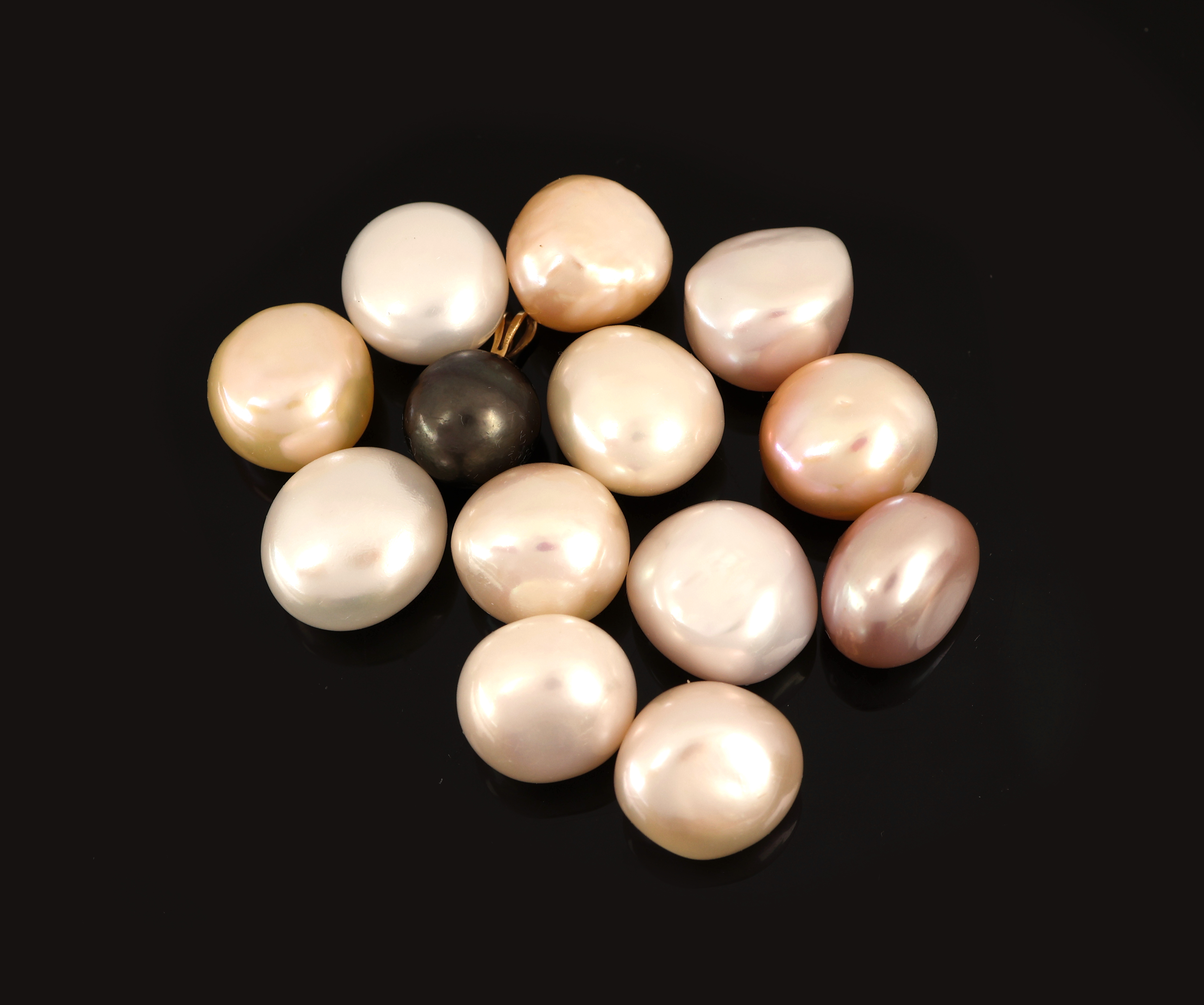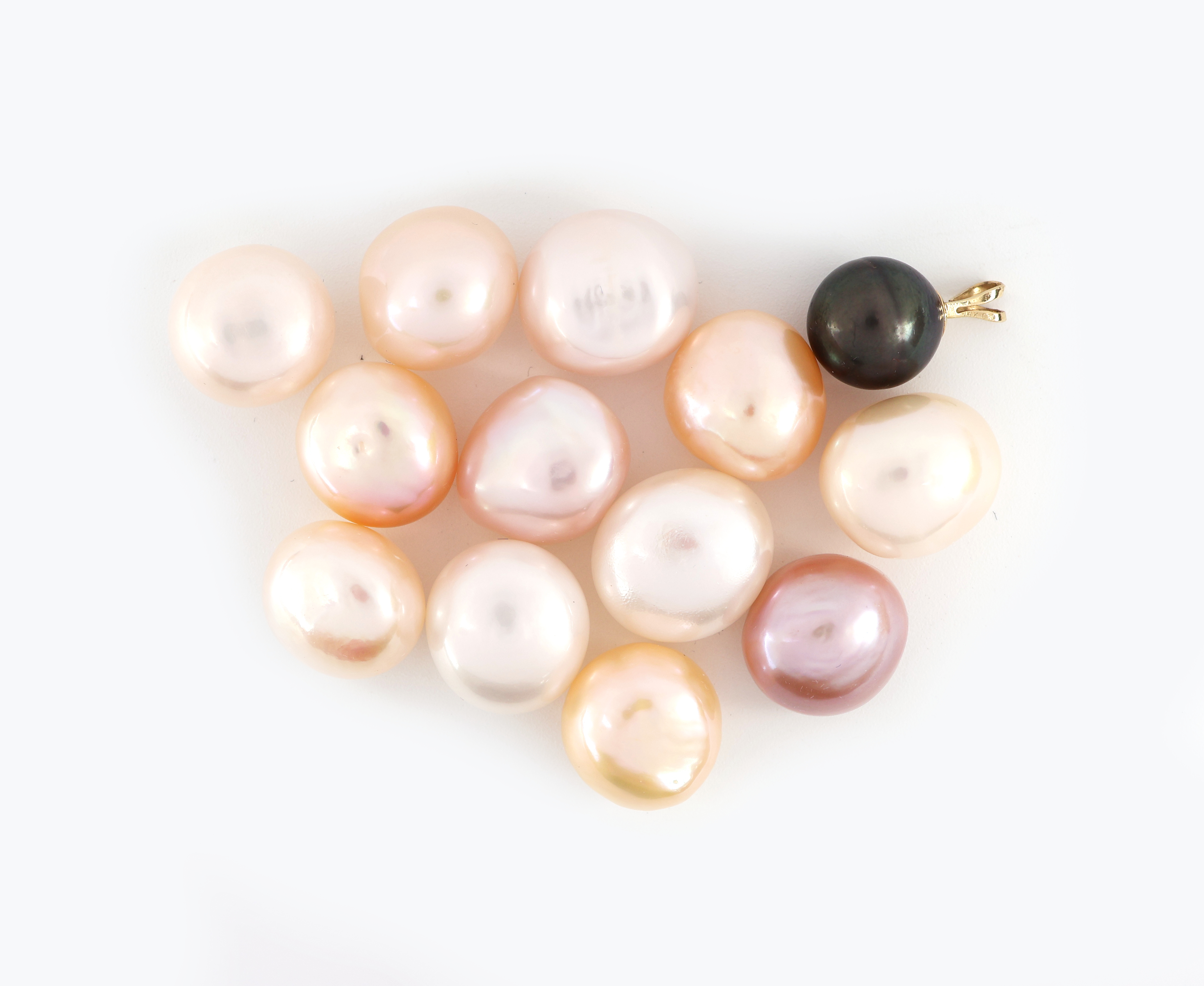 Lot 12 Süßwasserzuchtperlen, versch. Größen, Formen und Farbnuancen, dazu 1 Tahitizucht-