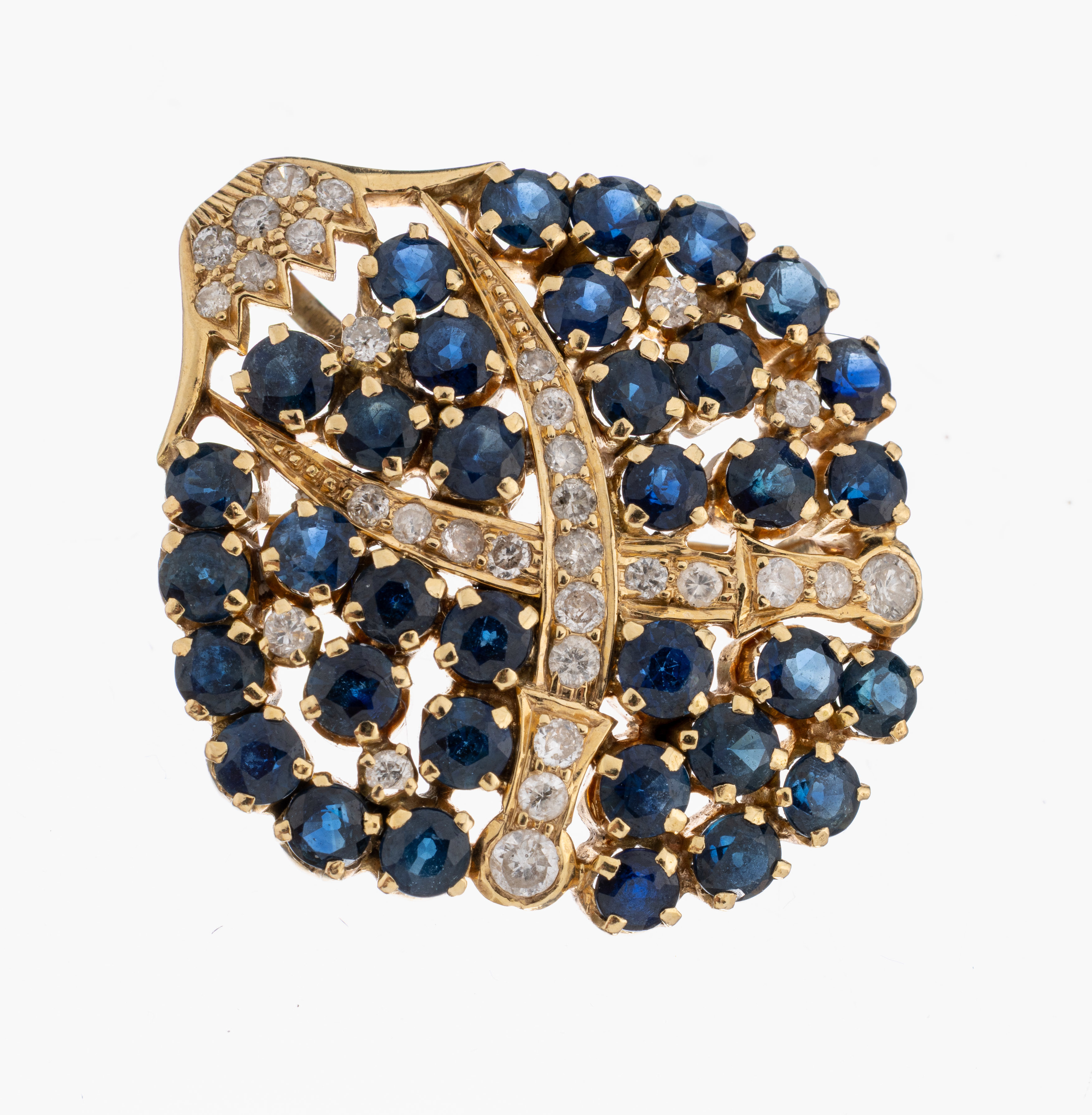 14 kt Gold Saphir-Brillant-Brosche, GG 585/000 gepr., 35 rundfacett. Saphire zus.