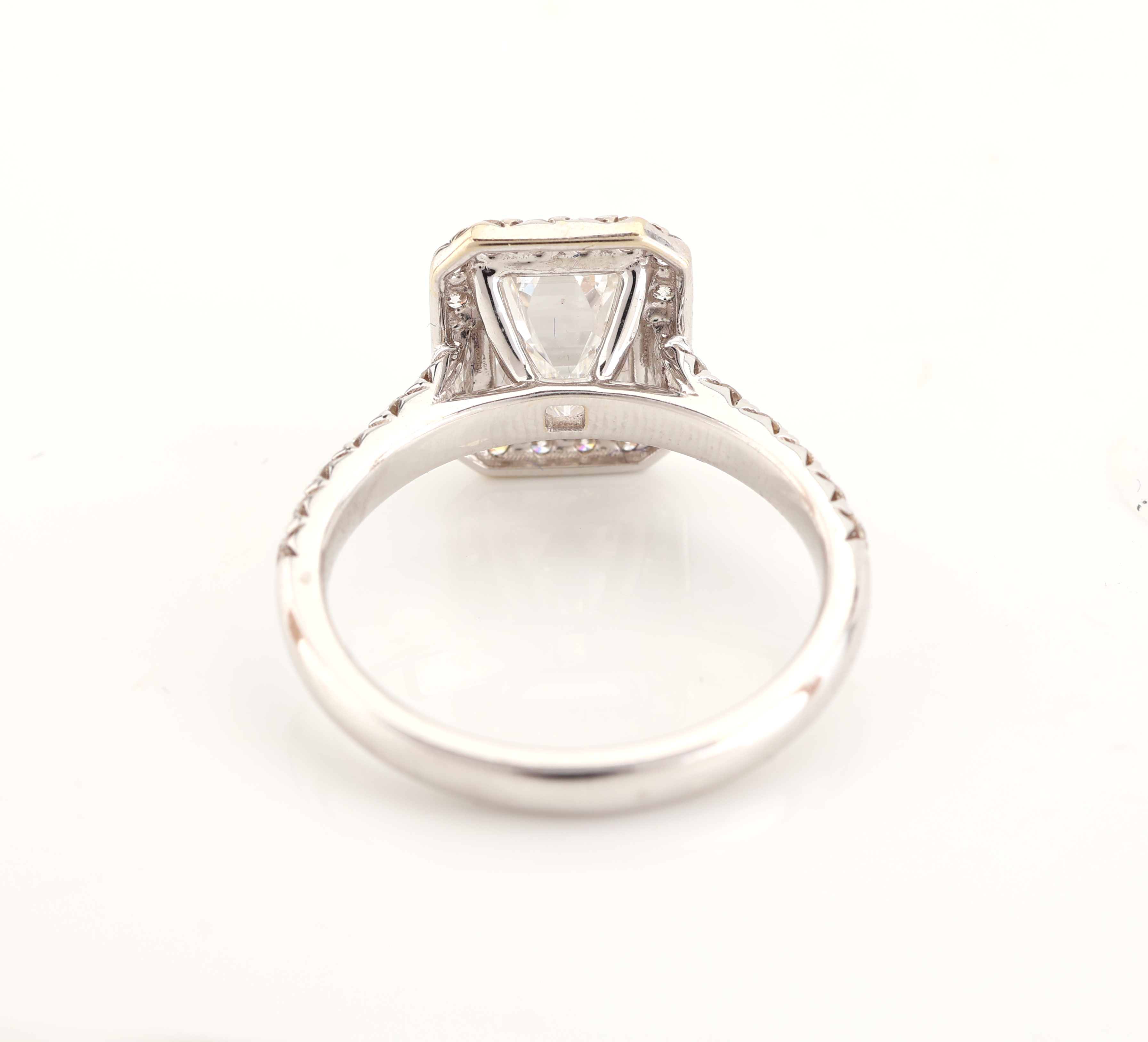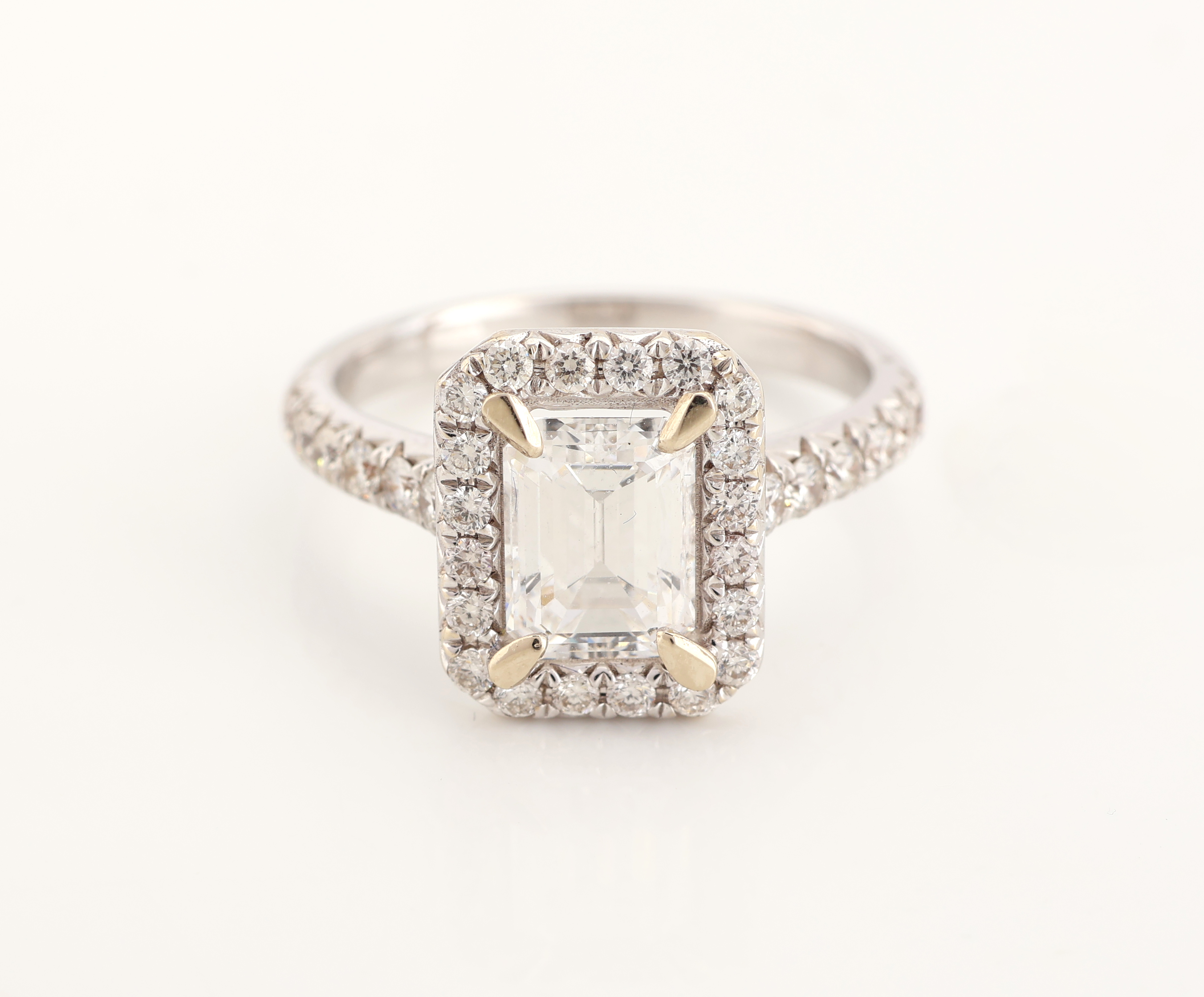 18 kt Gold Diamant-Ring, WG 750/000, mittigDiamant im Emerald Cut 2.23 ct hochfeines Weiß(E)/vs1, 32 Brillanten zus. ca. 0.66 ct feines Weiß-Weiß/vs-si, RW 54, ca. 4.4 g, DPL-Expertise für Mittelstein anbei
