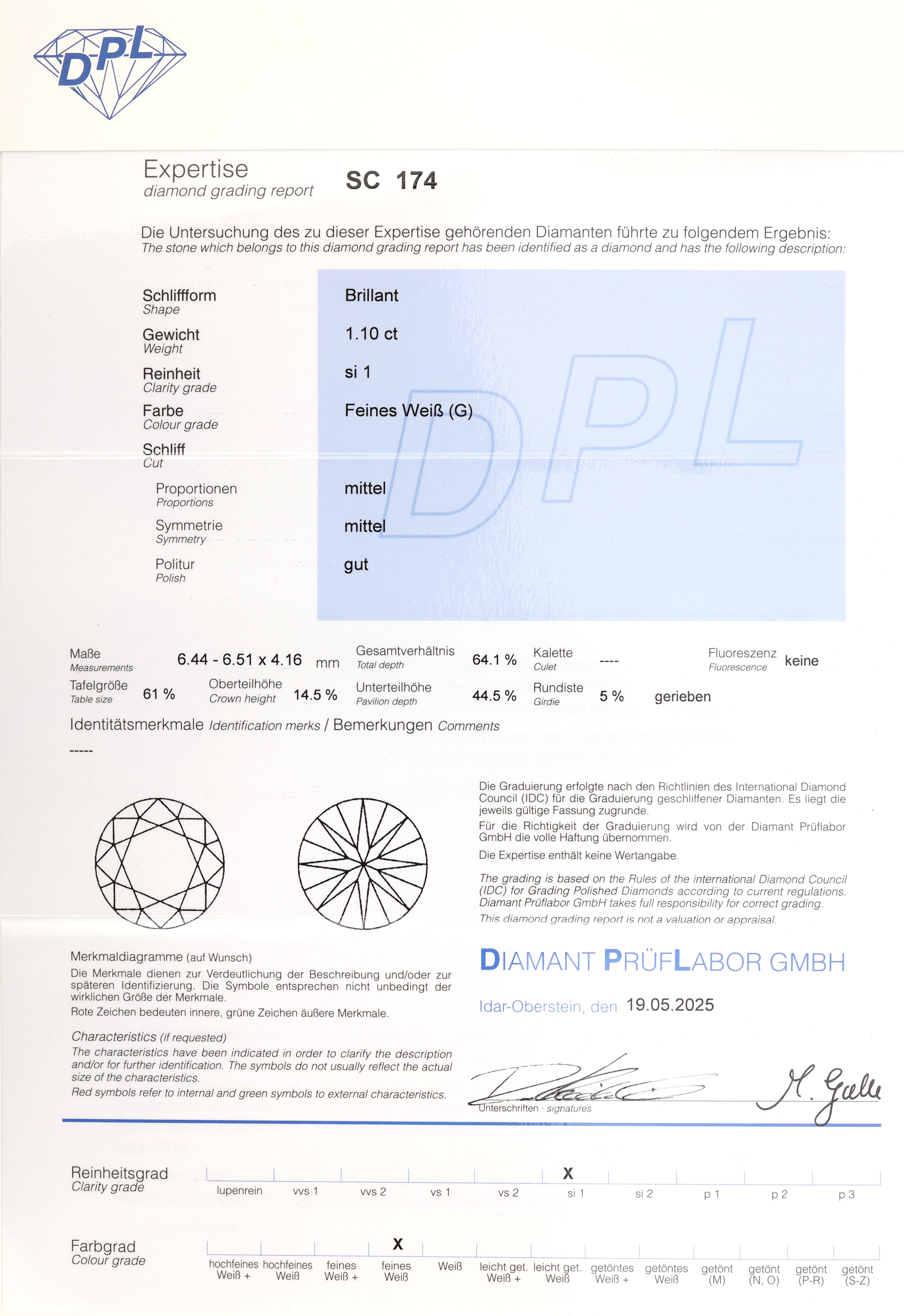 18 kt Gold Brillant-Ring, WG 750/000, Brillant ca. 1.10 ct feines Weiß(G)/si1, RW 57, ca. 3.3 g, DPL-Expertise für Mittelstein anbei