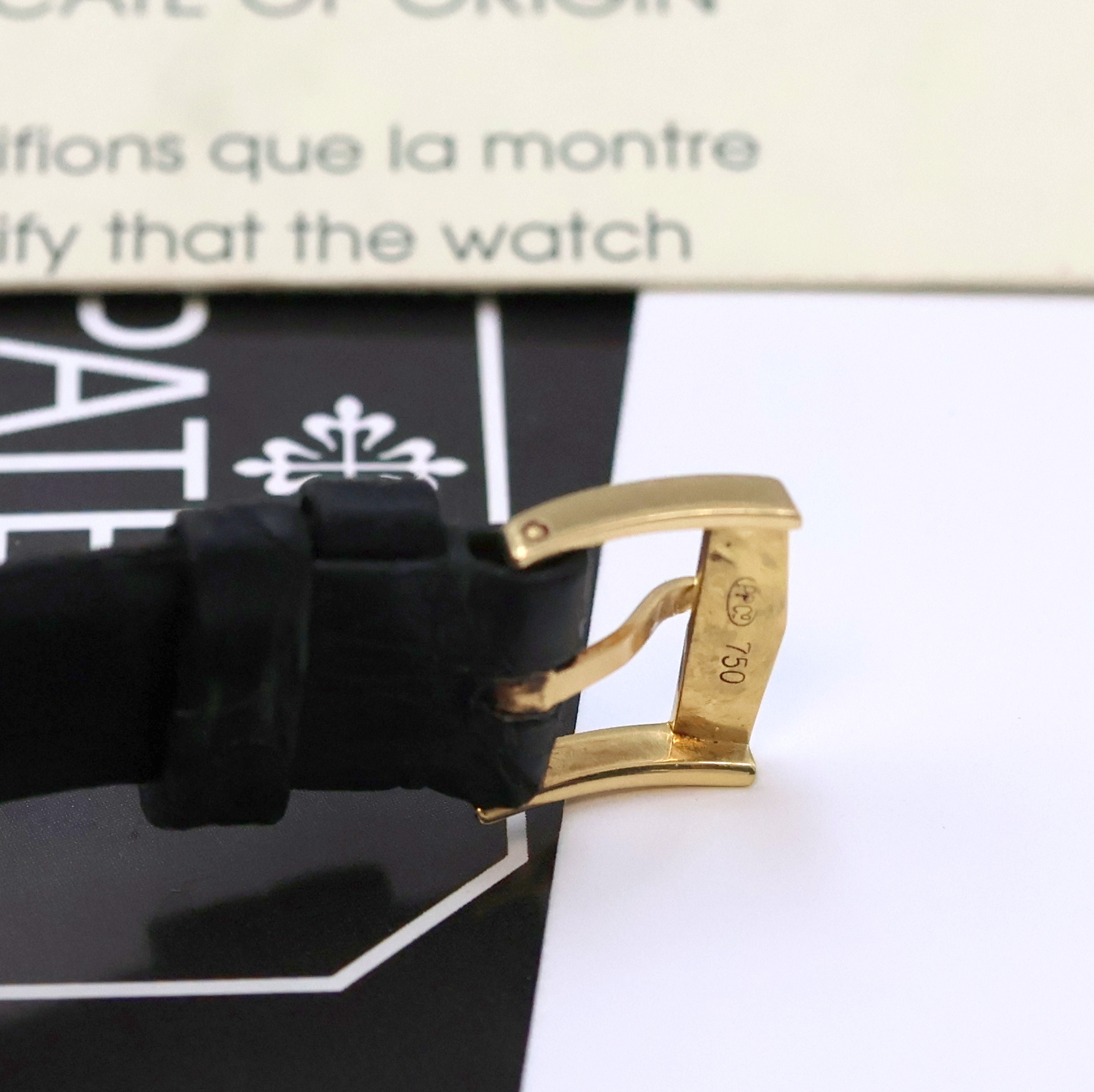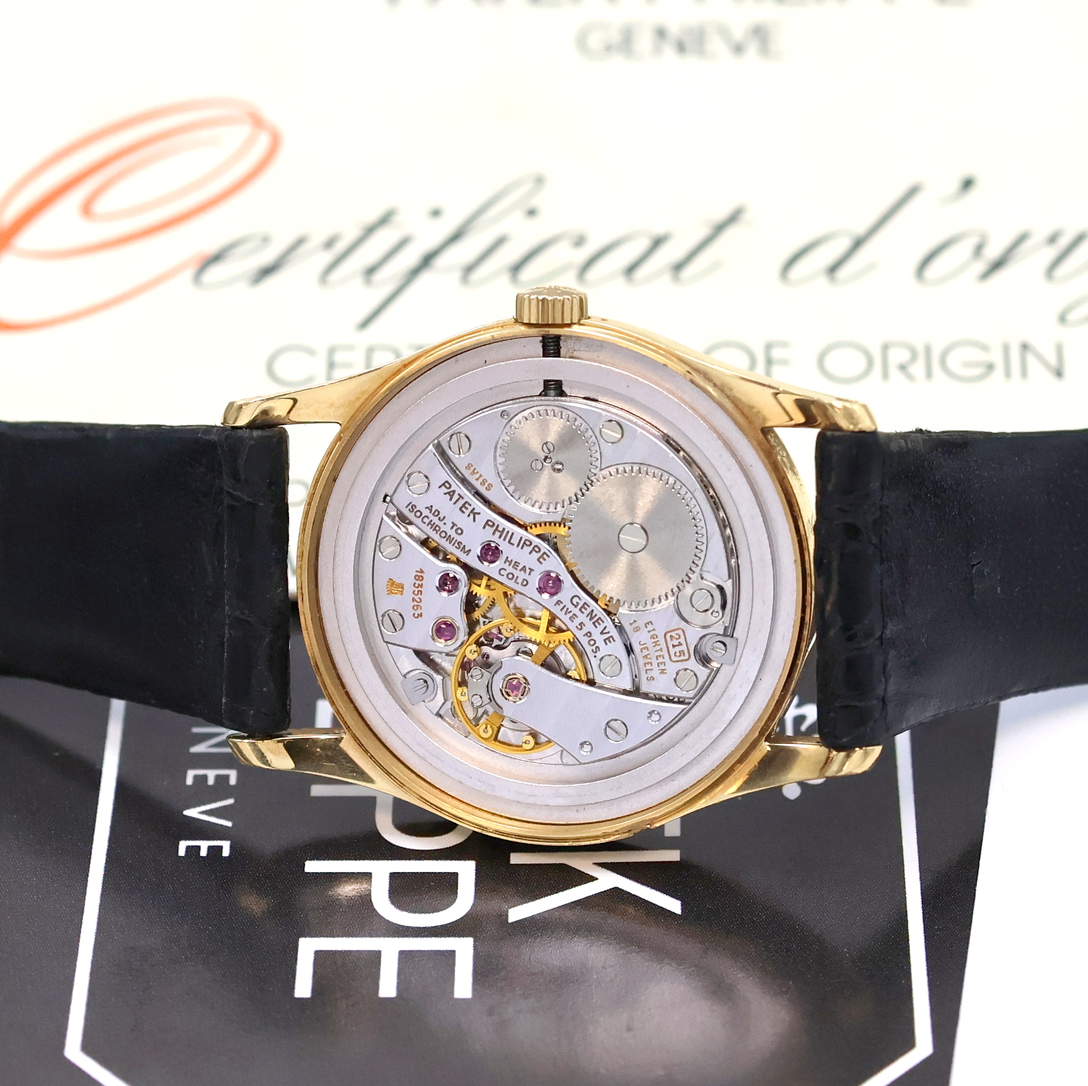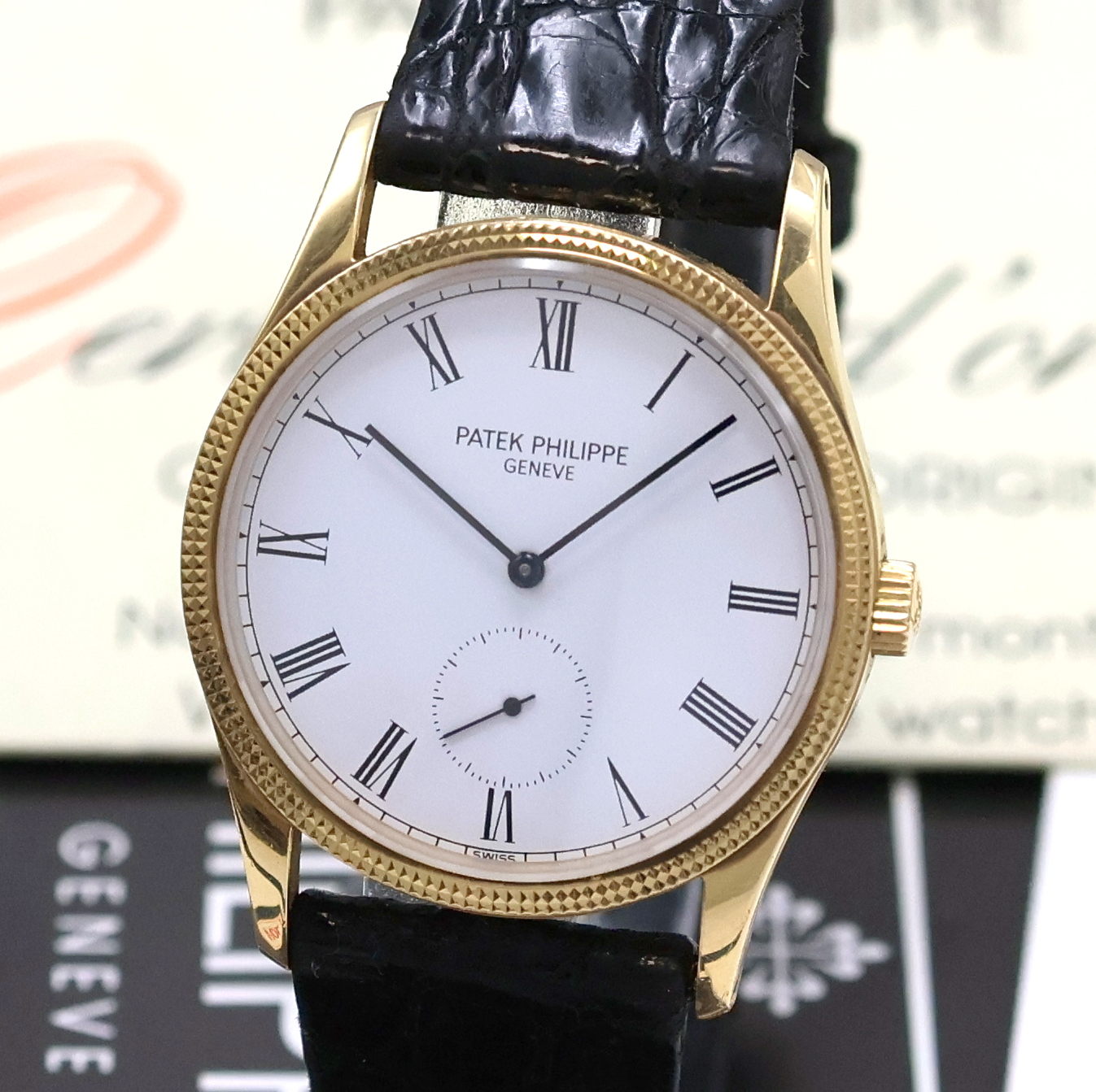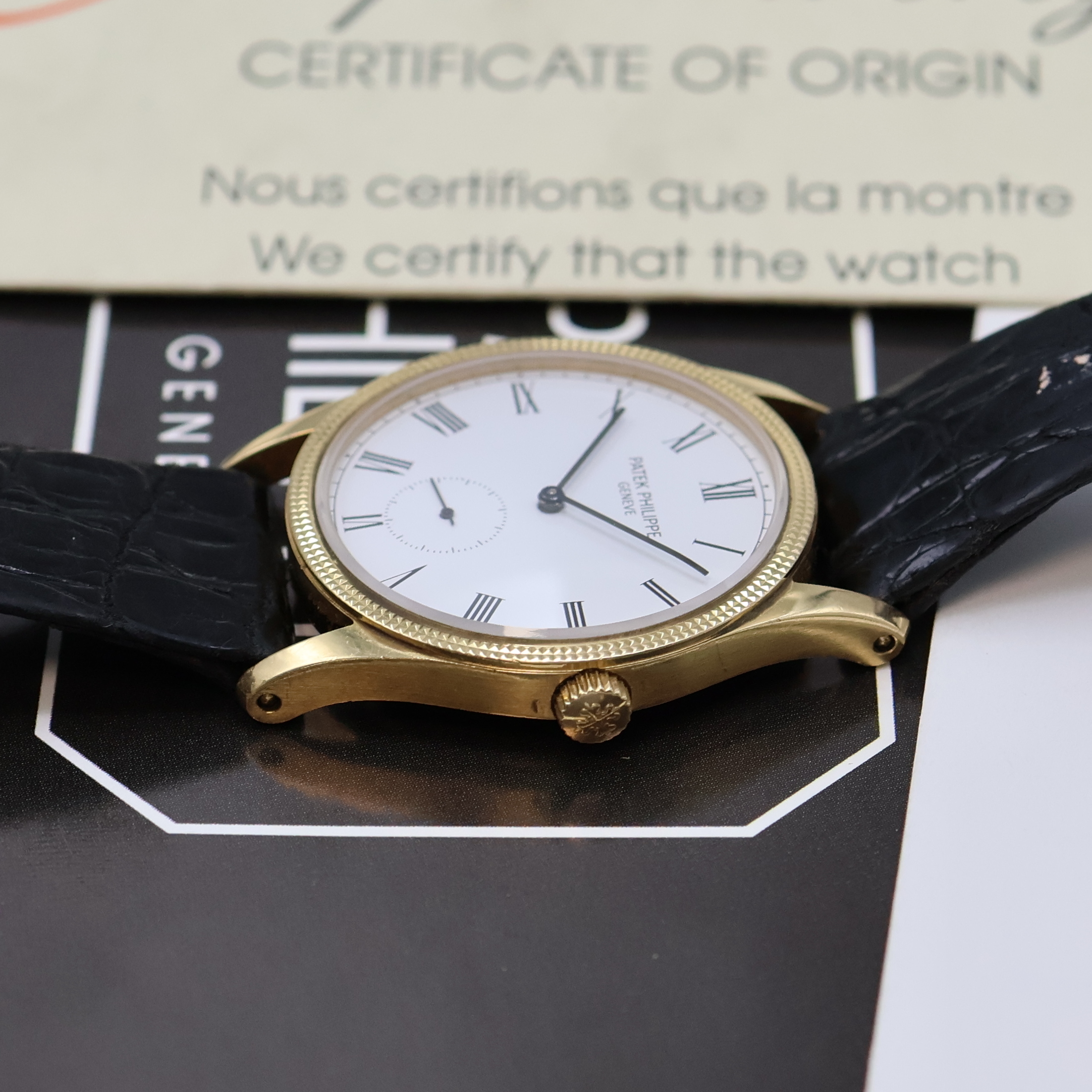 PATEK PHILIPPE Armbanduhr Serie Calatrava in GG 750/000 Referenz 3796 D, Handaufzug, Boden aufgedr., orig. Lederband m. orig. GG 750/000 Dornschl., weißes Zifferbl. m. röm. Std., Lünette m. Clous de Paris Verzierung, Werk rhod., 18 St., Kal. 215, Streifenschl., in 5 Lagen just., Genfer Punze, D. ca. 30 mm, orig. Zertifikat, demnach gek. 07/1993, Nutzsp. altersbed., EZG 3, EZW 2-3, aus Sammlungsauflösung