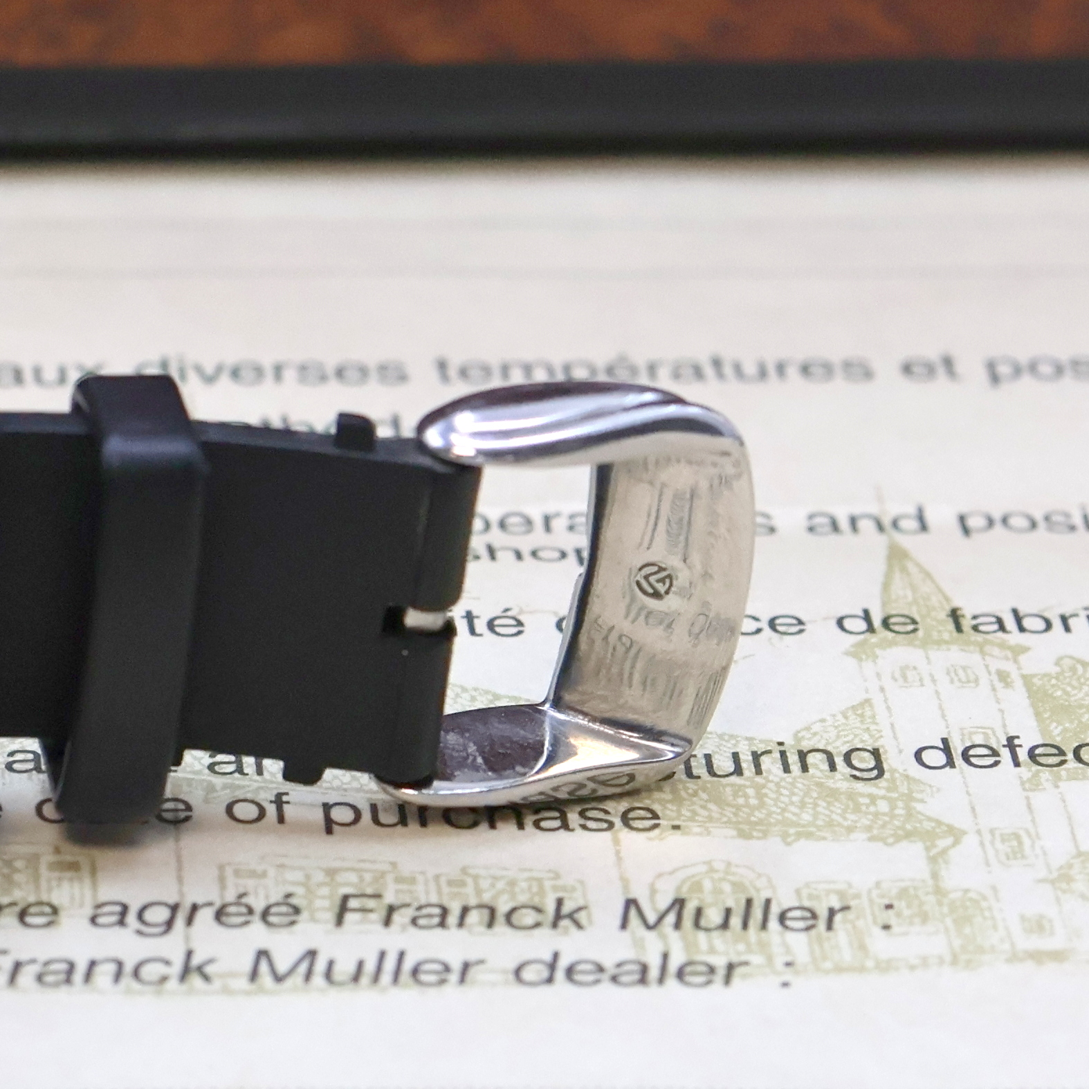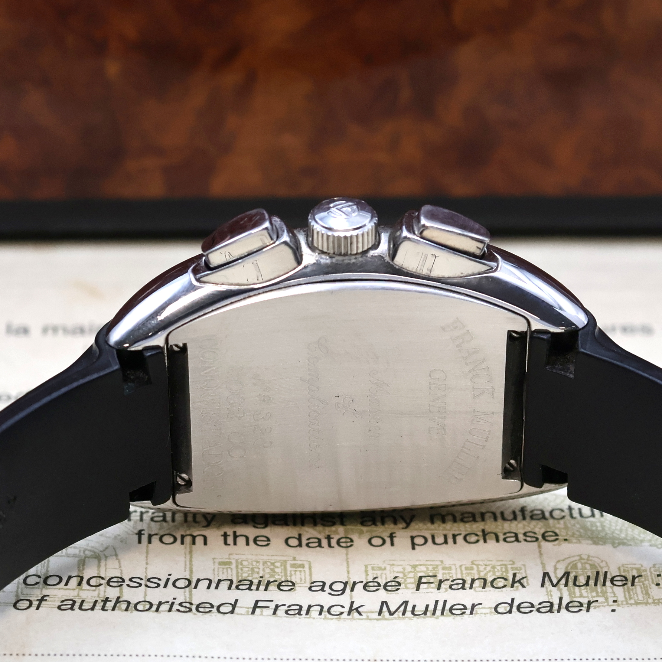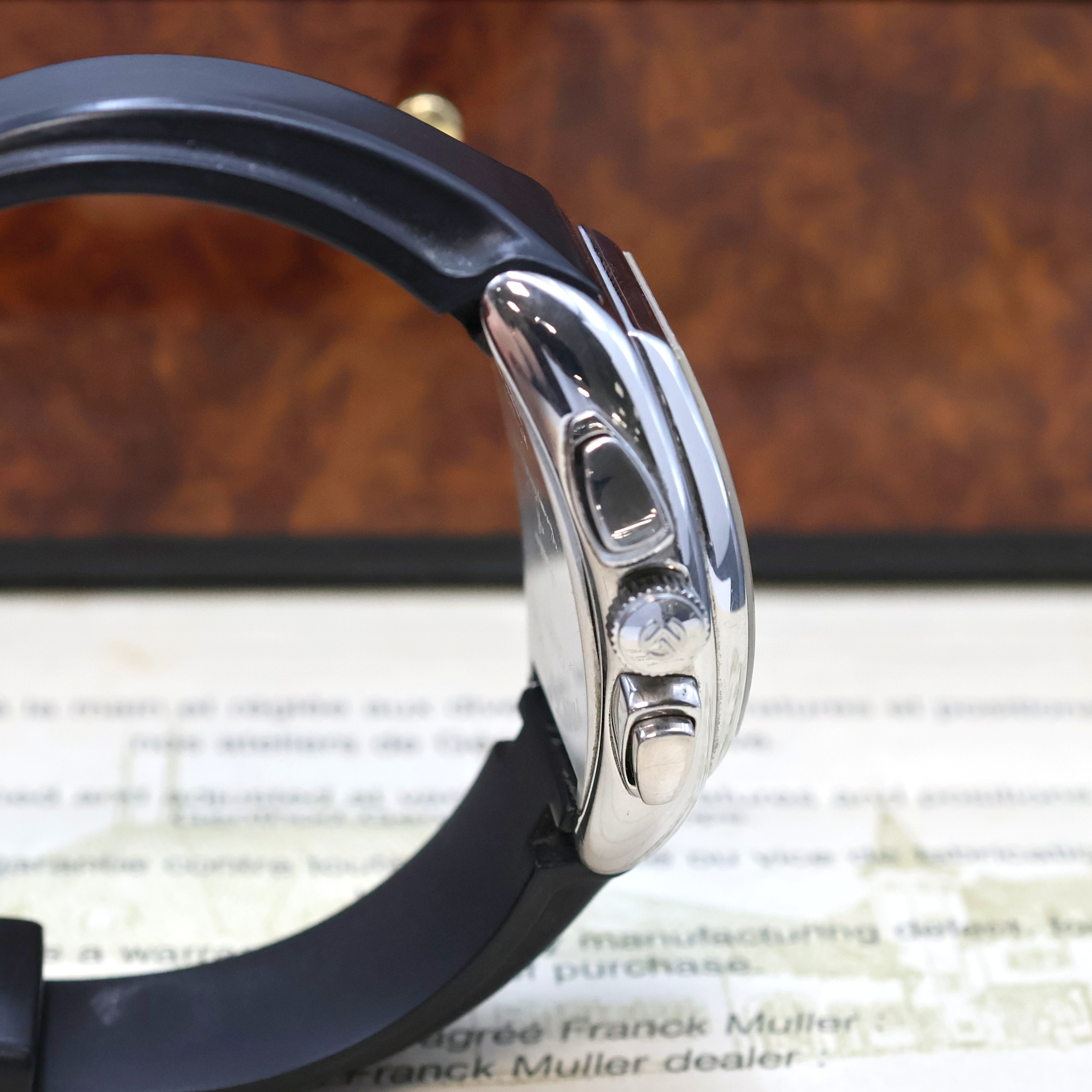 FRANCK MULLER Conquistador Schaltradchronograph Referenz 8002CC, Automatik, tonneauförm. Edelstahlgeh. inkl. orig. Kautschukband m. orig. Dornschl., Boden 4-fach verschr., verschr. Krone, silb., guill. Zifferblatt pat./fl., Anz. v. Std., Min., Datum und Chronographenz., rhod. Werk, 37 St., Kal. 1185 Co2, Zentralrotor mit Platin- Segment, gebl. Schrauben, Streifenschl., M. ca. 36 x 49 mm, orig. Edelholz-Etui und Zertifikat, demnach gek. 2002, EZ 2, aus Sammlungsauflösung