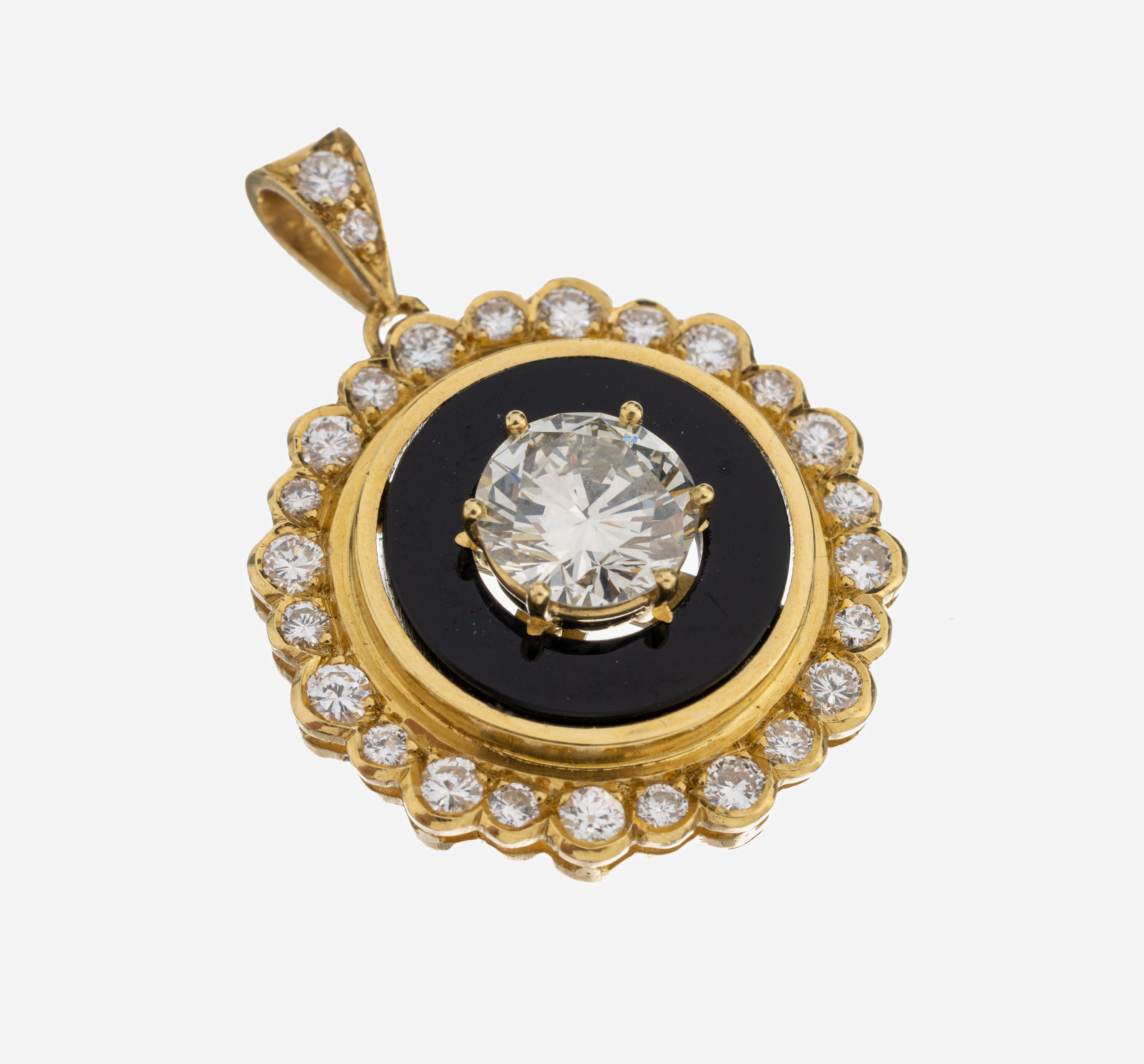 18 kt Gold Brillant-Onyx-Anhänger, GG 750/000, mittig erhaben gefasster Brillant
