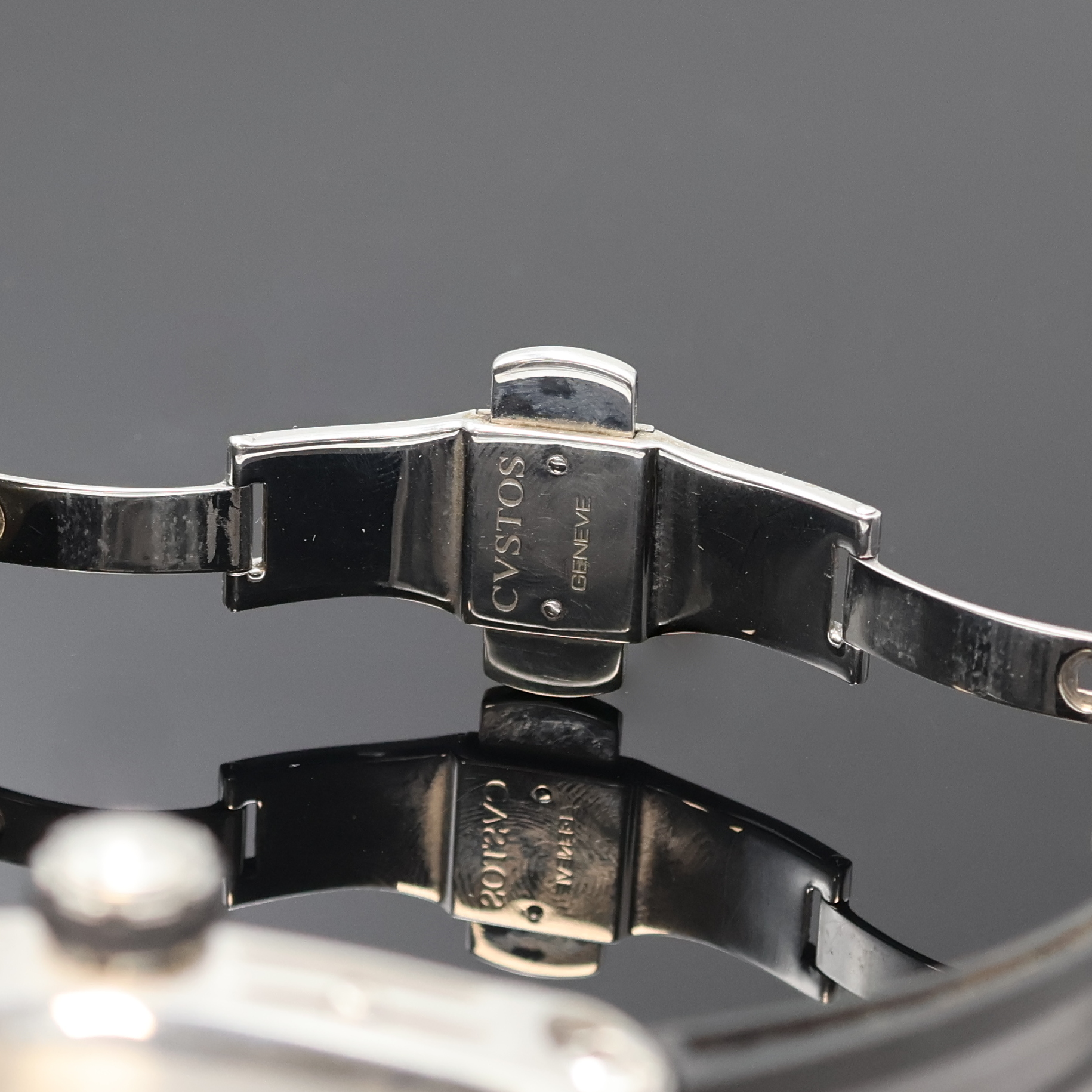CVSTOS Challenge astronomische Armbanduhr mit ewigem Kalender Referenz QP-S, Schweiz um 2007, Automatik, tonneauförmiges, beids. vergl. Palladium-Geh. inkl. orig. Kautschukband m. dopp. Faltschl., Boden 4-fach verschr., verschr. Krone, z. T. skel. Zifferbl., Anz. v. Std., Min., Zentralsek., Tag, Datum, Monat, Mondphase und Schaltjahr, Korrekturdr. seitl. im Geh. eingel., schwarzes, plasmabehandeltes Rundankerw., Rotor aus Palladium- und Titanlegierung, Kal. 6510 / Basis ETA 2892A2, M. ca. 41 x 54 mm, Nutzsp. altersbed., EZ 2-3, aus Sammlungsauflösung