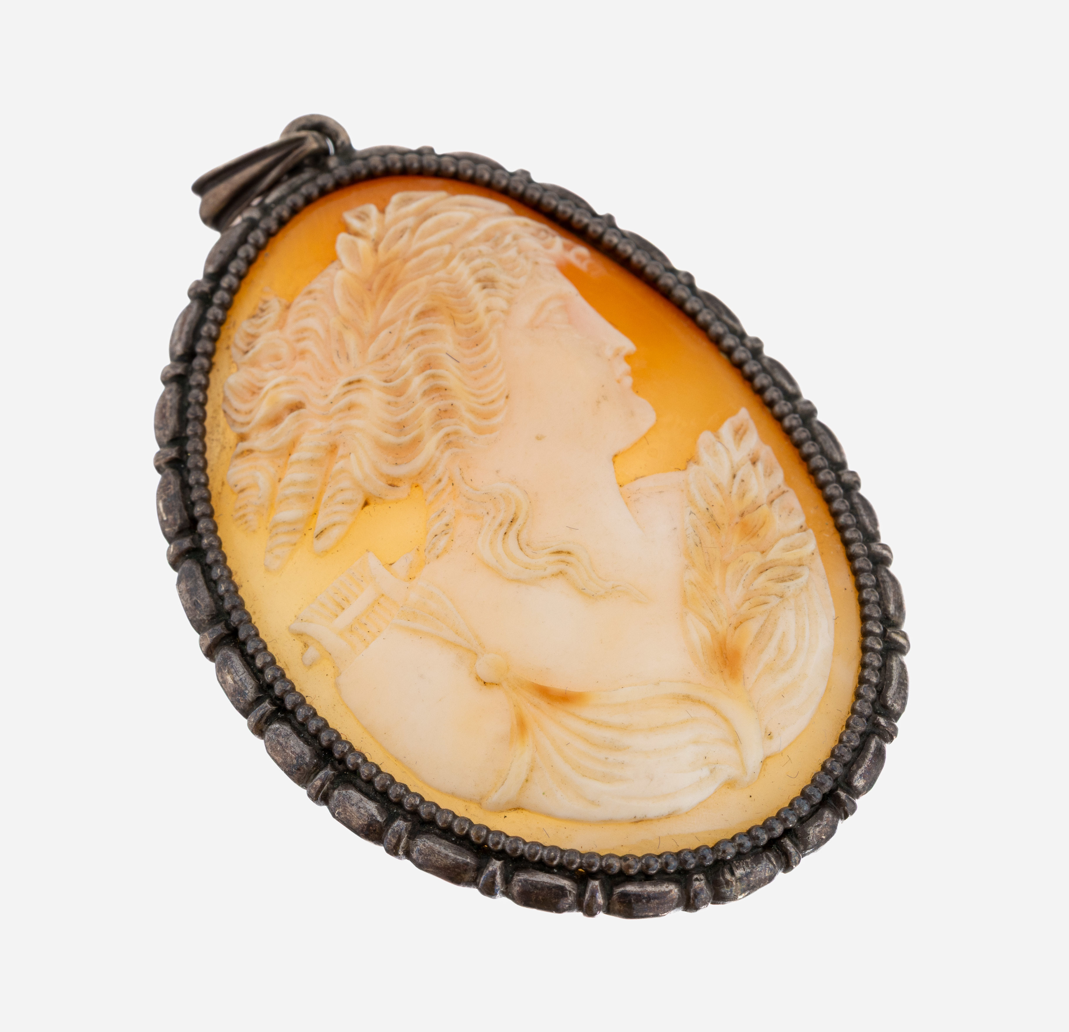 Kamee-Anhänger, um 1900, Fassung Silber, Muschelkamee, Darstellung einer Dame im