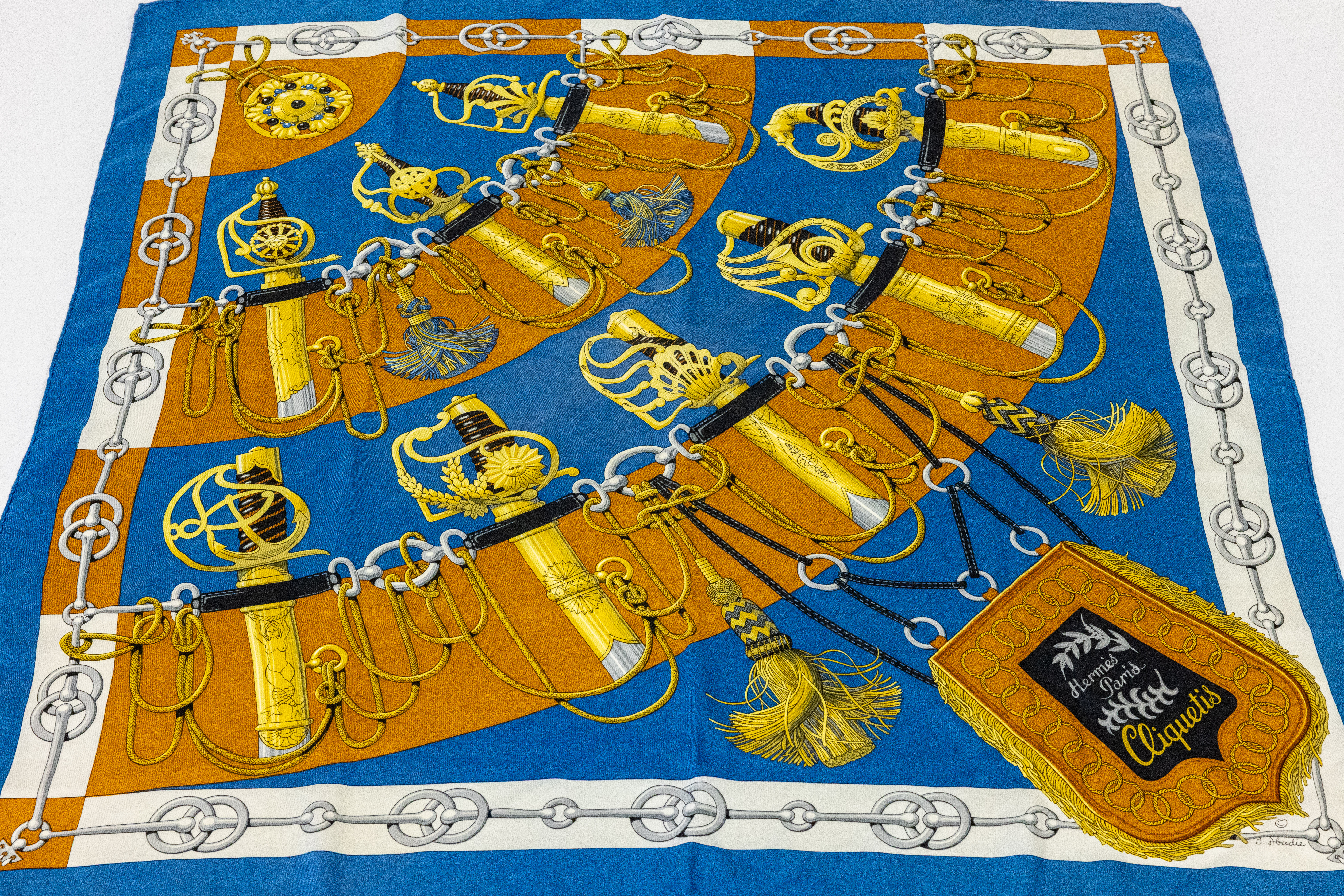 HERMES Carree, "Cliquetis", 100 % Seide, Made in Paris, hellblaugrundig, goldf. Motive