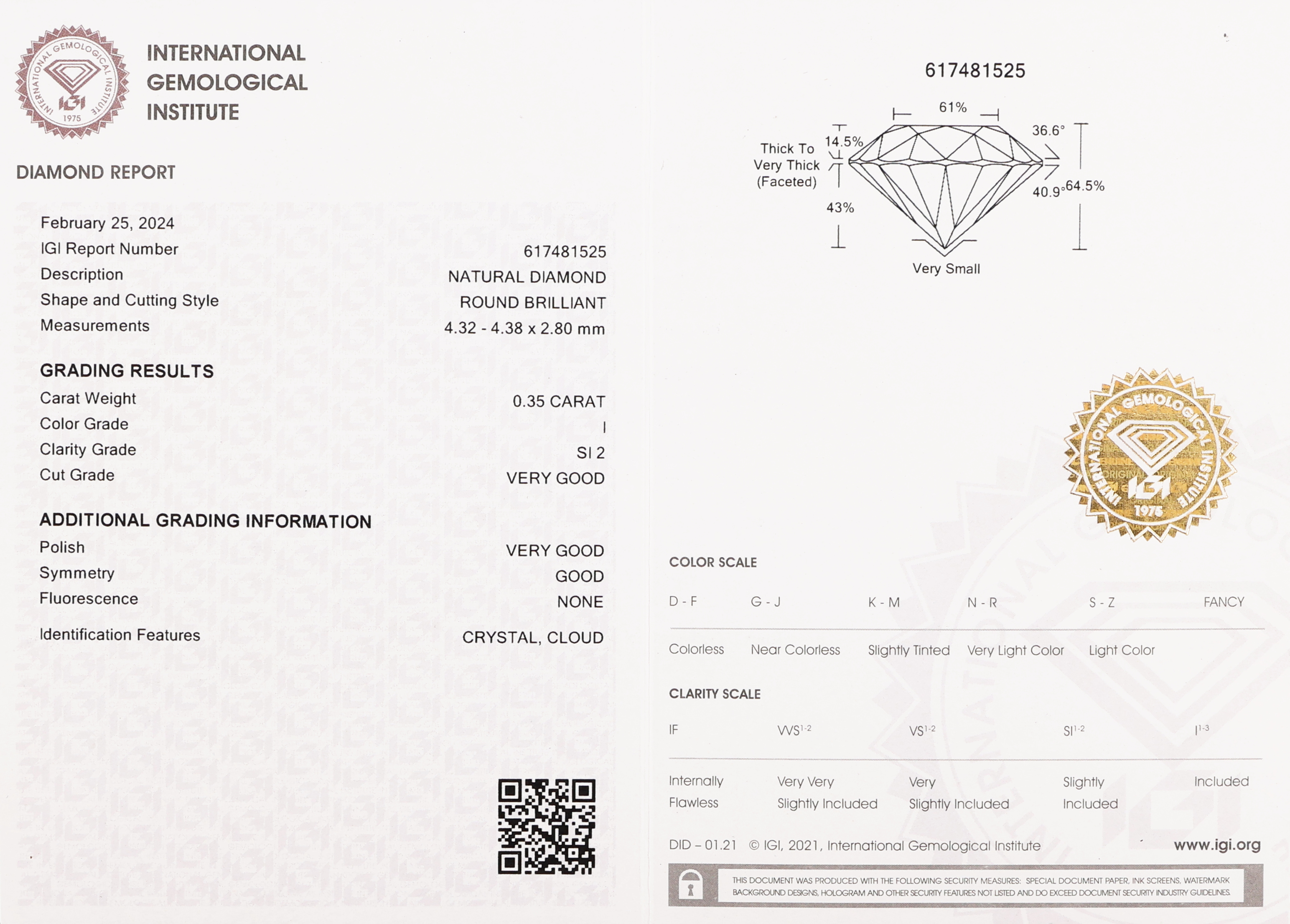 si3, AIG-Expertise anbei, und 1 Brillant 0.35 ct l.get.Weiß(I)/si2, IGI-Expertise