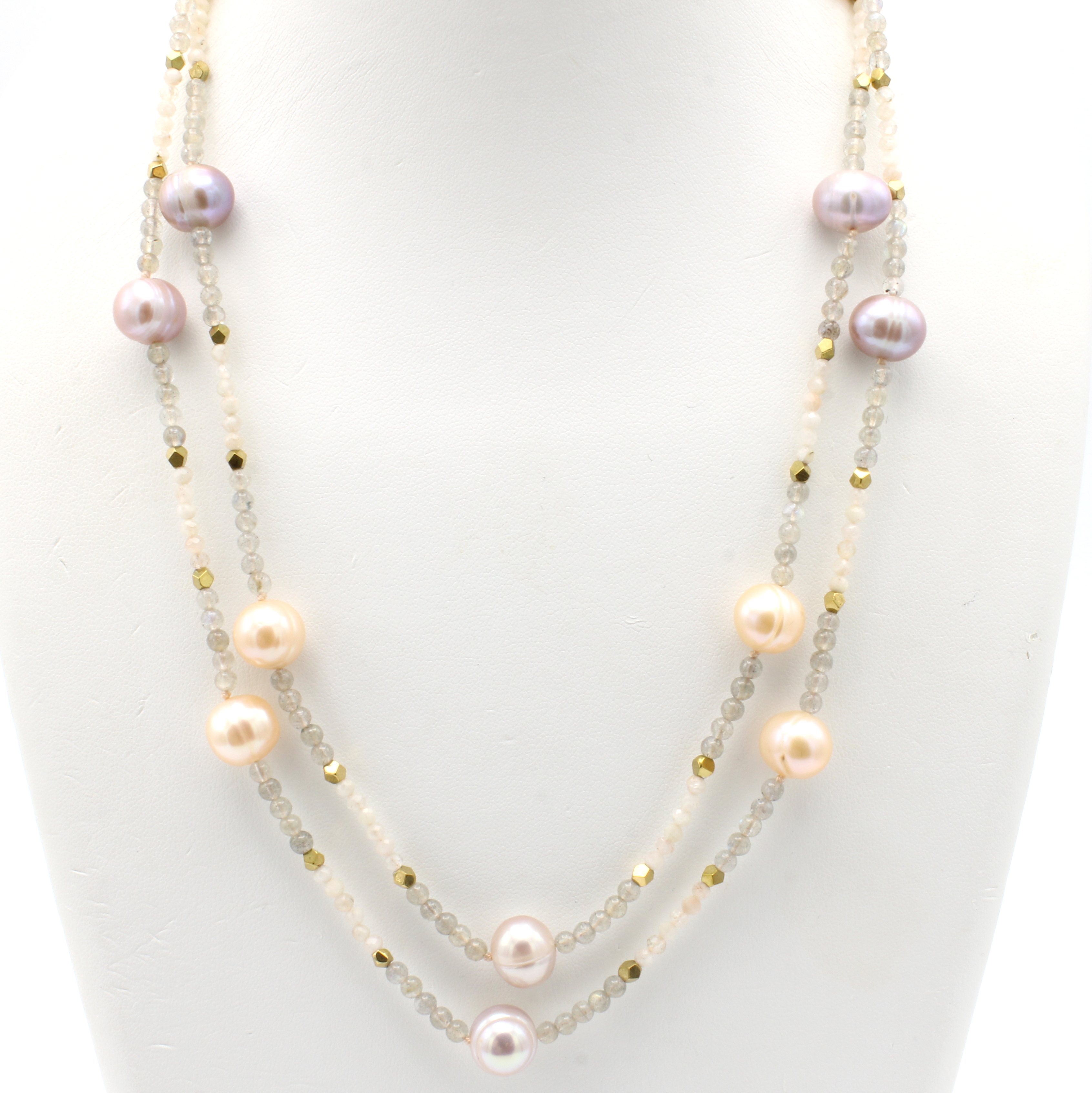 Lange Kette mit Mondsteinen, Süßwasserzucht- perlen und Zierteilchen, multicolorfarb. Perlen, Mondsteine in versch. Farbnuancen, L. ca. 100 cm