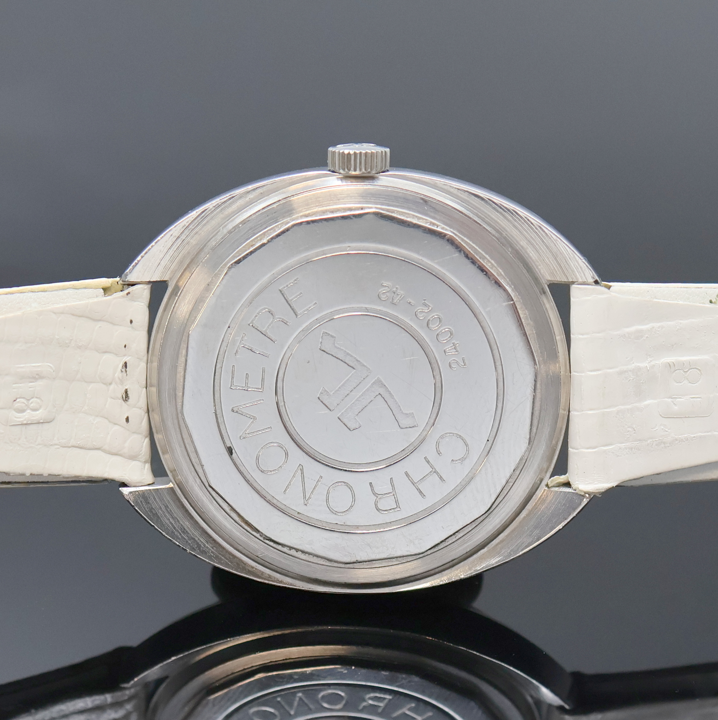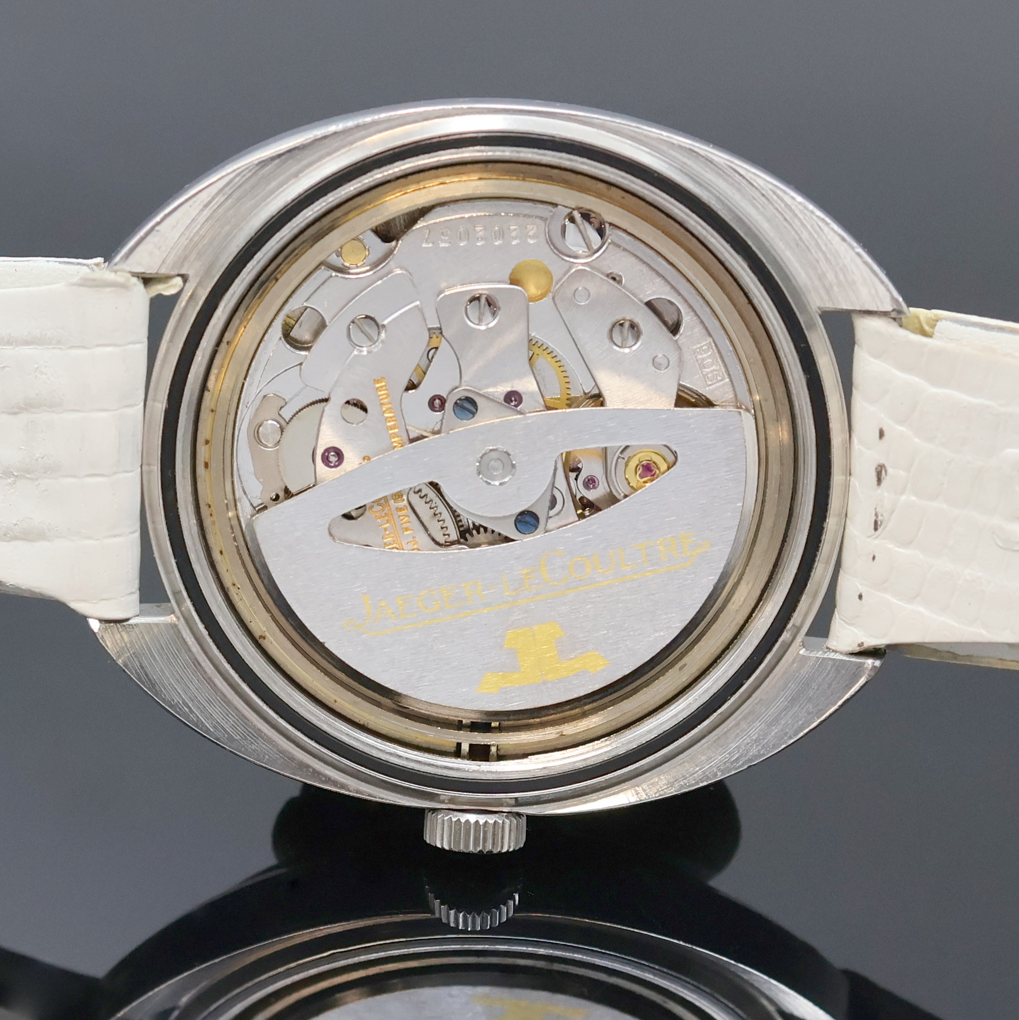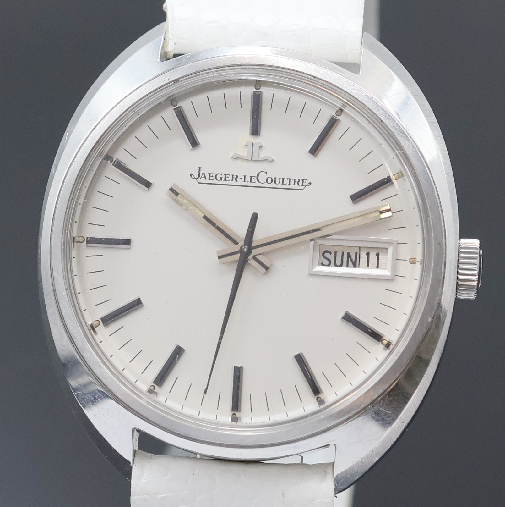 Jaeger-LeCoultre Chronometre Referenz 24002-42seltene Herrenarmbanduhr in Stahl, Schweiz um 1975, Automatik, unpoliertes Geh., verschr. Boden bez. "CHRONOMETRE 24002-42", silb. Zifferbl., aufges. silb. Indizes, Tag u. Datum b. 3, silb. Zeiger, Zentralsek. m. Stopp- Funktion b. Zeigerst., rhod. Werk Kal. 906, 21 St., 5 Adj., D. ca. 38,5 mm, JLC Etui anbei, Überh. empf., EZ 2