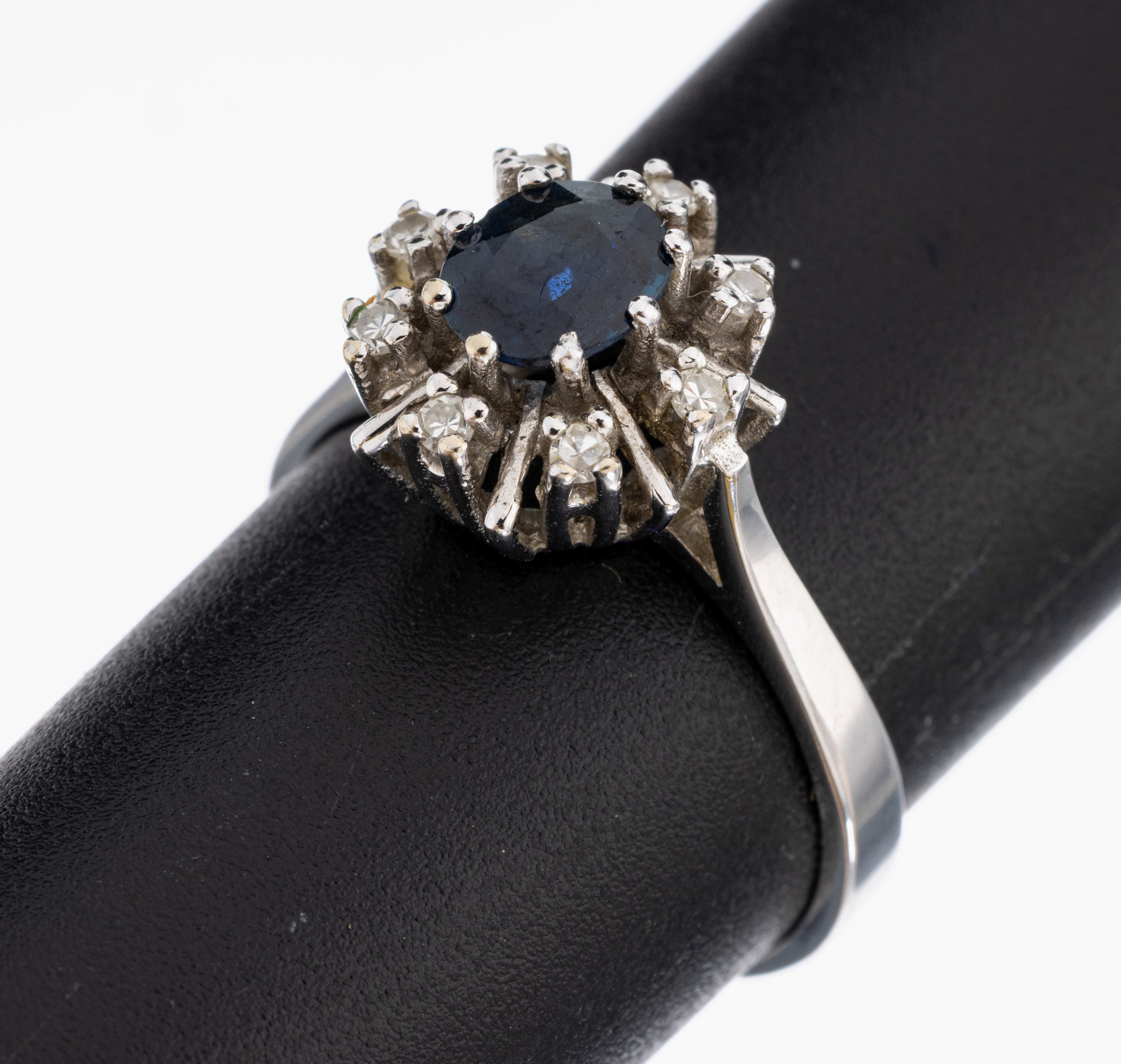 14 kt Gold Saphir-Diamant-Ring, WG 585/000,ovalfacett. Saphir ca. 1.10 ct, umgeben