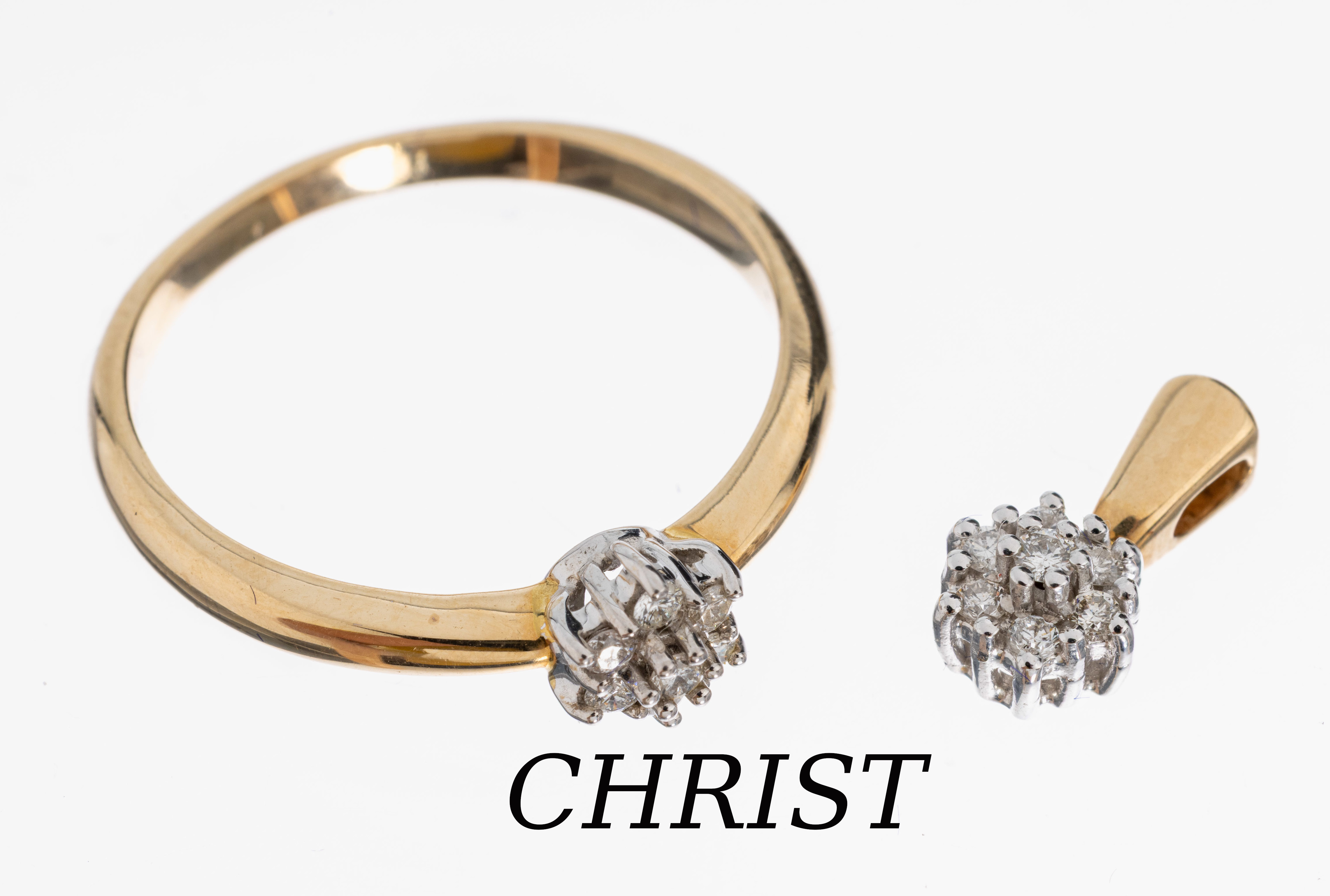 14 kt Gold CHRIST Brillant-Schmuckset, GG/WG 585/000, best. aus: 1 Ring, RW 60, und