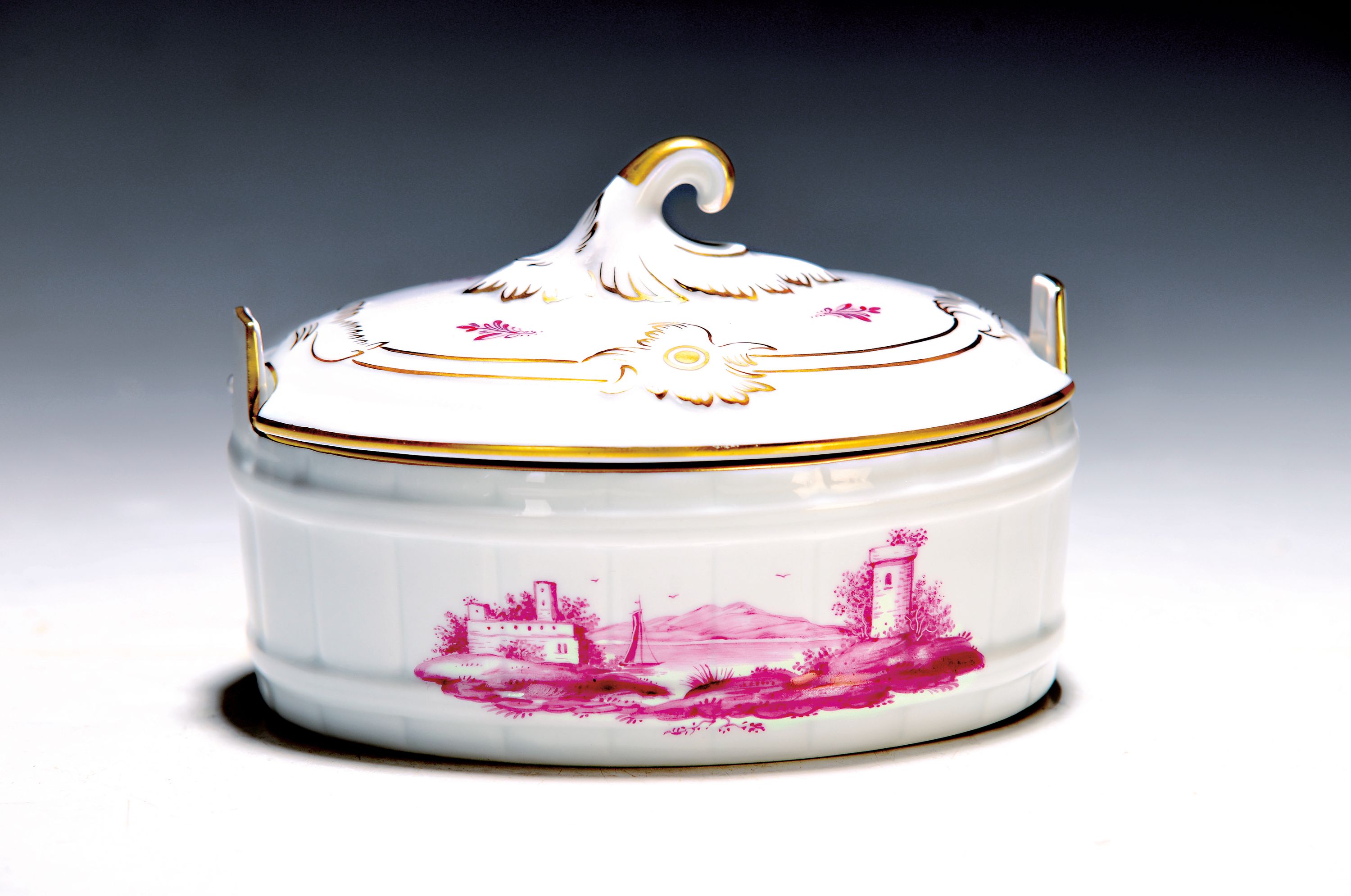Deckeldose, Höchst, 1970/80er-Jahre, Porzellan, Goldstaffage, Camaieu-Malerei in