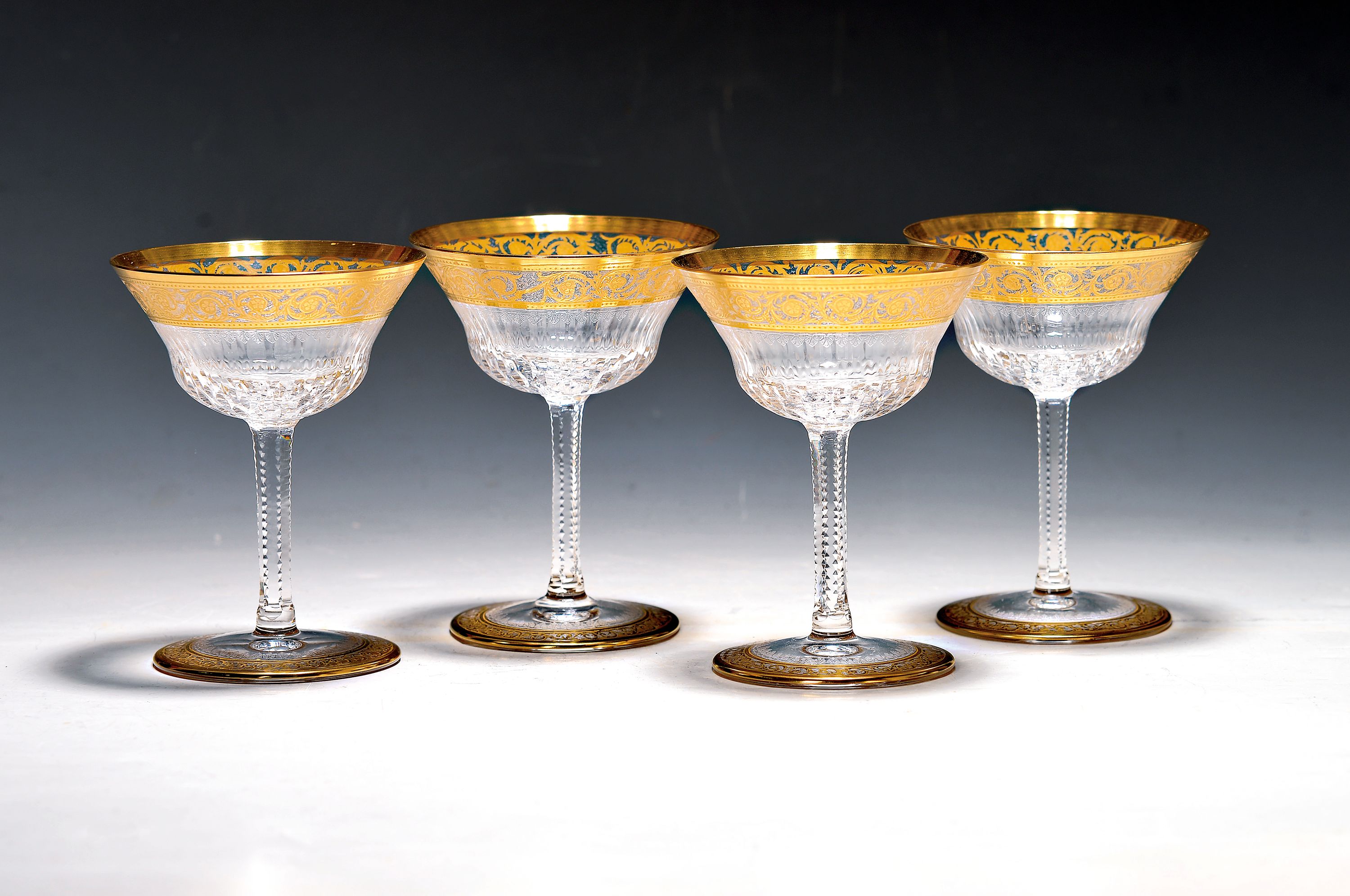 7 Champagnerschalen, Saint Louis, Dekor Thistle, farbloses Kristallglas, breit geätzte