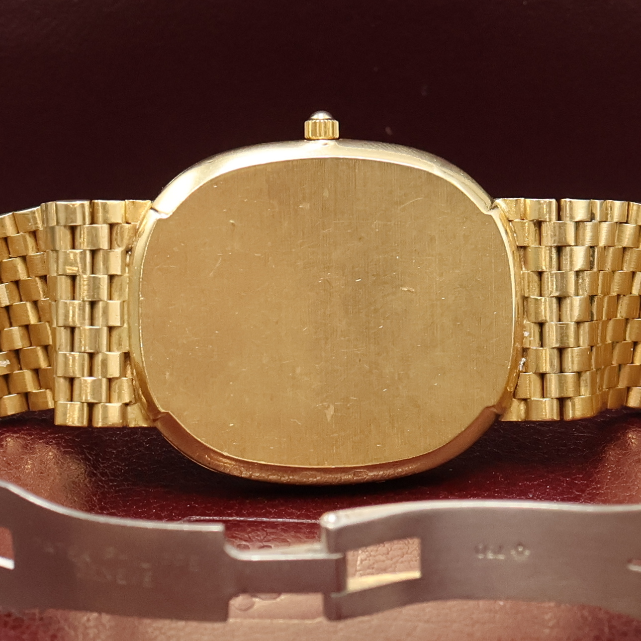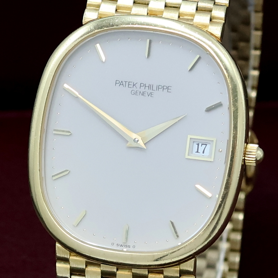 PATEK PHILIPPE Ellipse D`Or feine und seltene Herrenarmbanduhr in GG 750/000 Referenz 3747/00, quarz, 2-teil. Geh. inkl. Gliederband m. Faltschließe, Saphirflachglas, elfenbeinfarbiges Sigma-Zifferblatt m. aufges. Gold-Std.-Zeichen, Gold-Zeiger, Kal. E23C, M. ca. 35,5 x 31 mm, L. ca. 19 cm, Gew. ca. 105g, orig. Etui und Pap., demnach gek. 10/1993, Nutzsp. altersbed., EZ 2