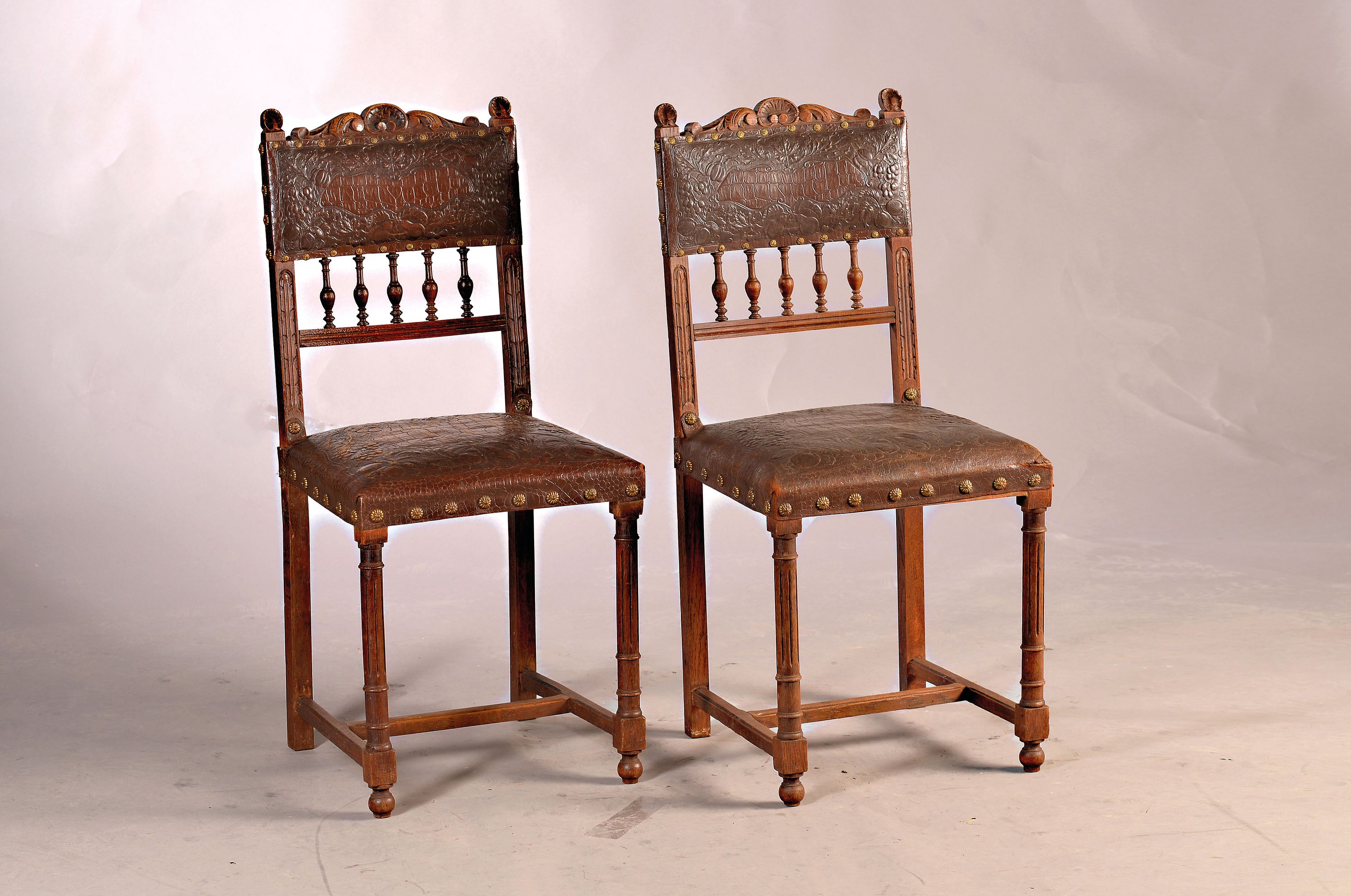 5 Gründerzeit-Stühle, um 1900, Eiche massiv, Sitzfläche und Rückenlehne aus geprägtem